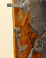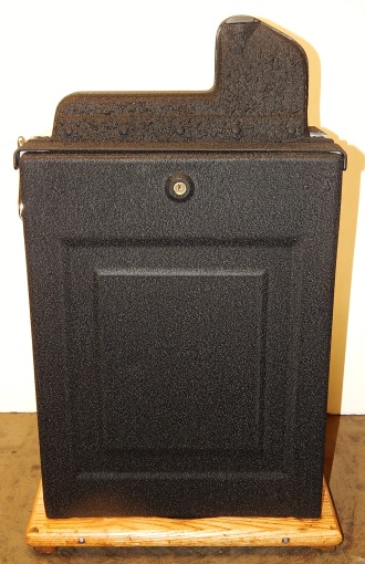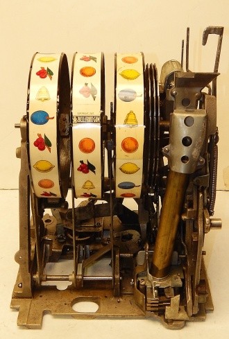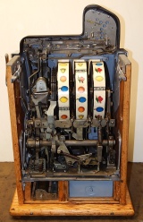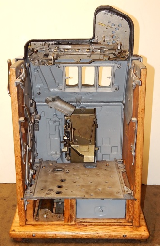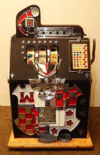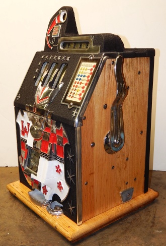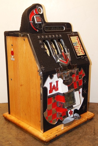 1938 Mills Castle Front 25 cent. Another very nice all original machine, the only thing that is not original is the paint. Restored back to it's original colors, wrinkle black trimed in red and white. Jackpot with reserve, original reel strips, original back door, original Mills lock with one key, original cash box. Original oak cabinet. Still has the original paper work on the inside of the cabinet. This is the way you want to find them. Plays very easy, 3-5 payout.