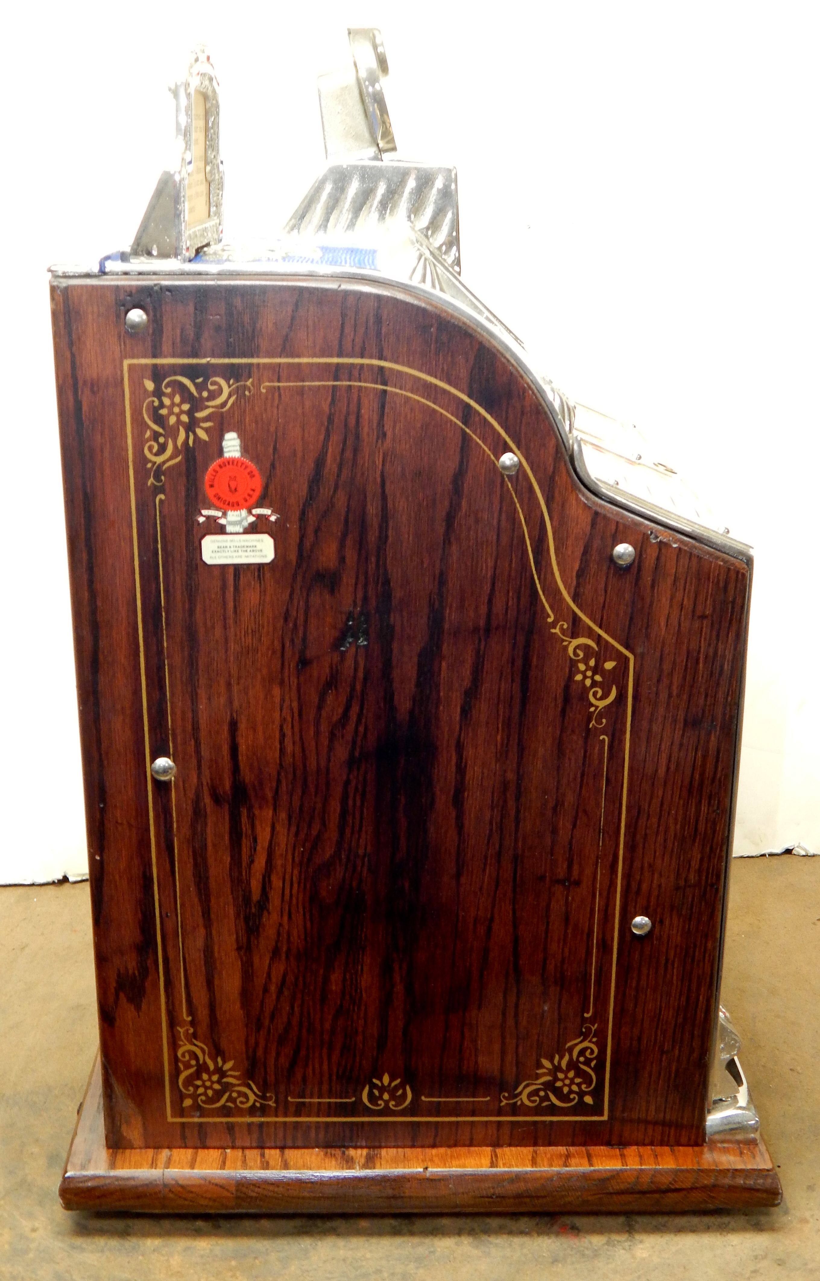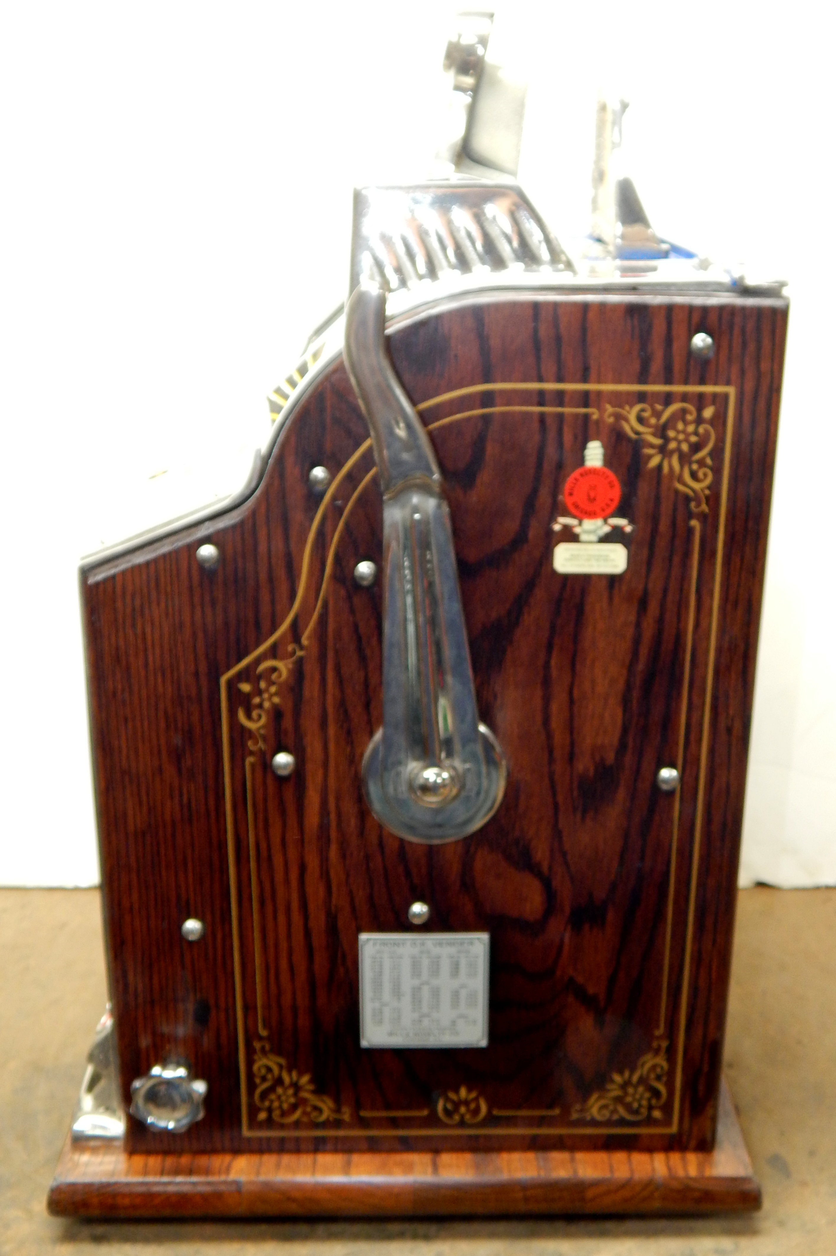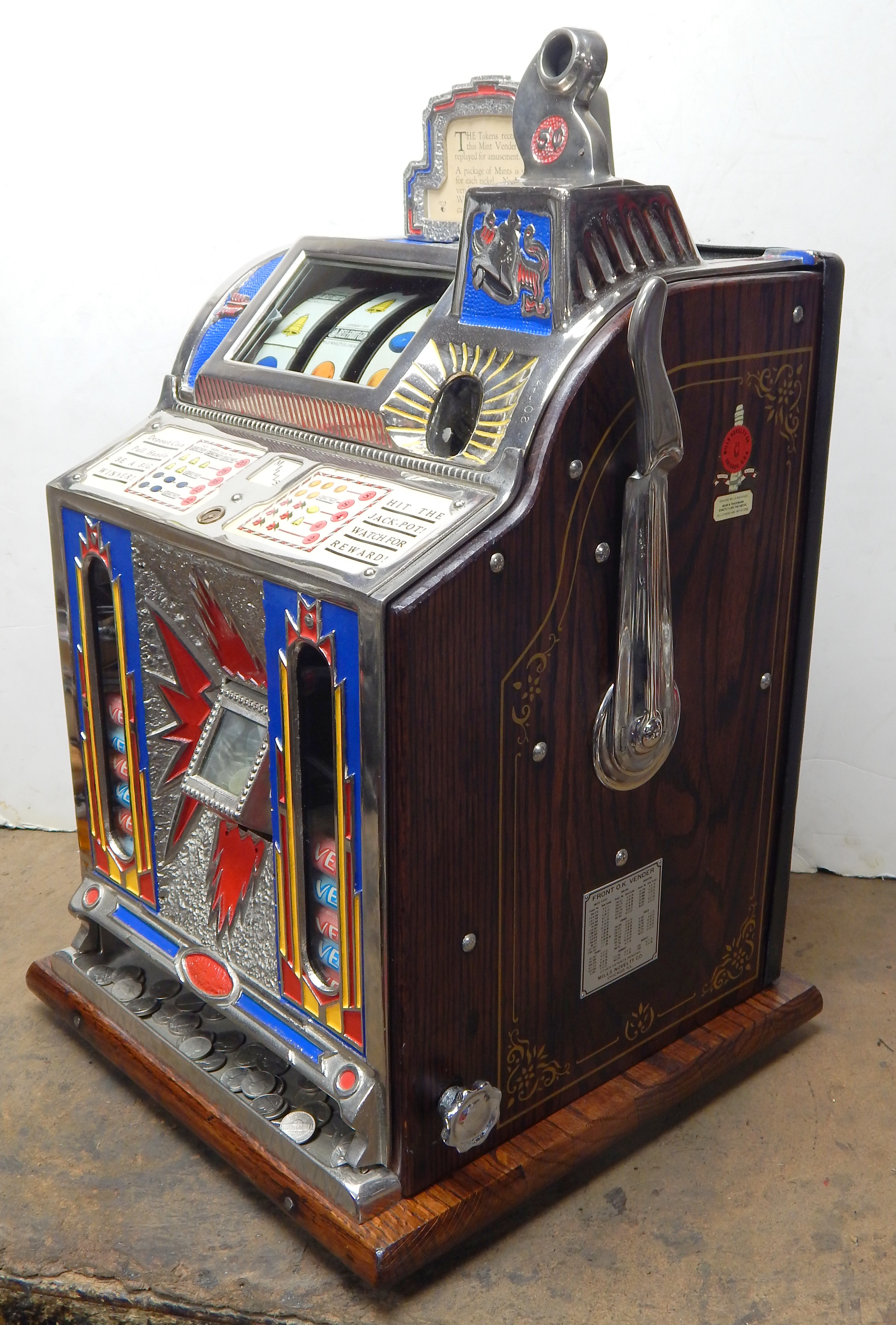 1929 Mills Silent FOK Jackpot Vender, 5 cent. Restored with original tin reel strips in mint condition, working front mint venders, Jackpot, chrome plated castings. Original back door with Mills locks with key, also has the front vender door key. original cash box. Very nice oak cabinet with gold stenciling. Easy to play and pay as it should.