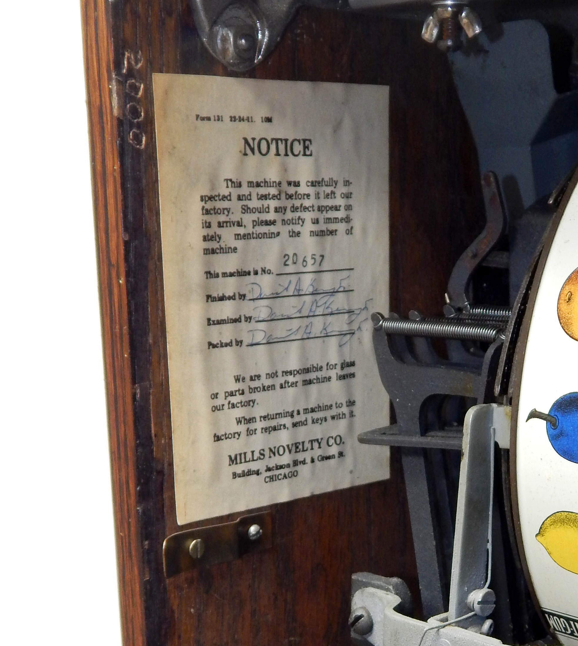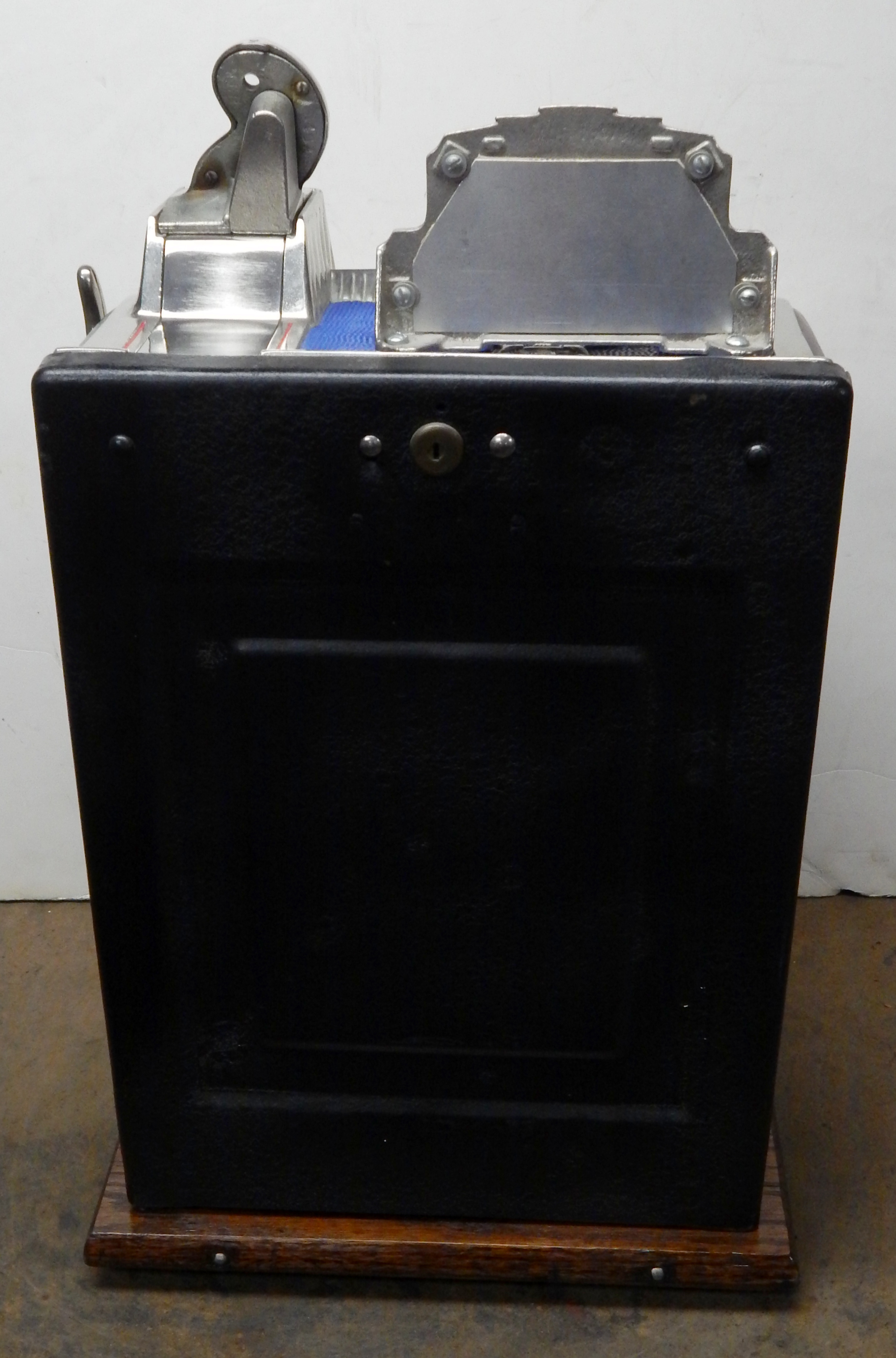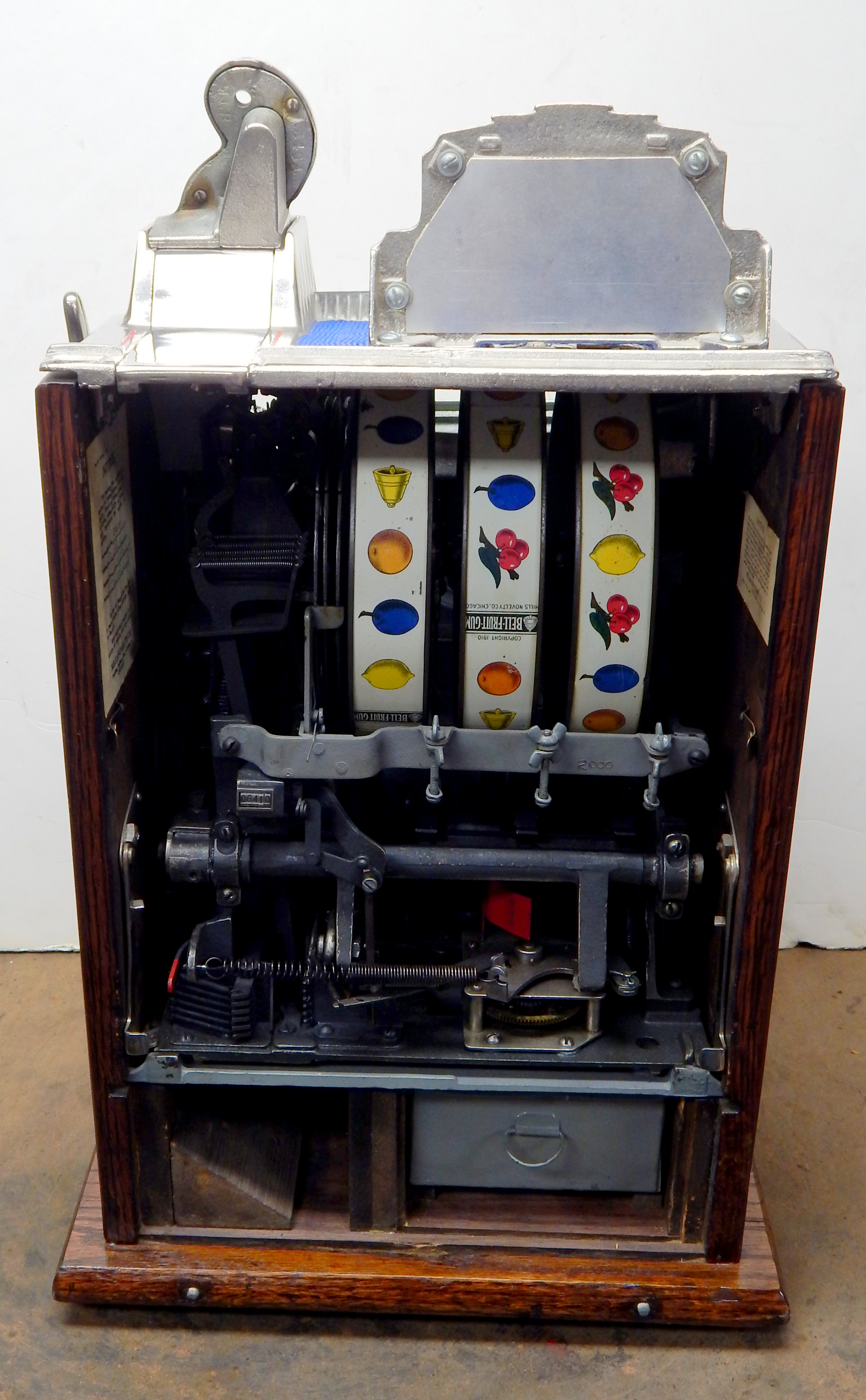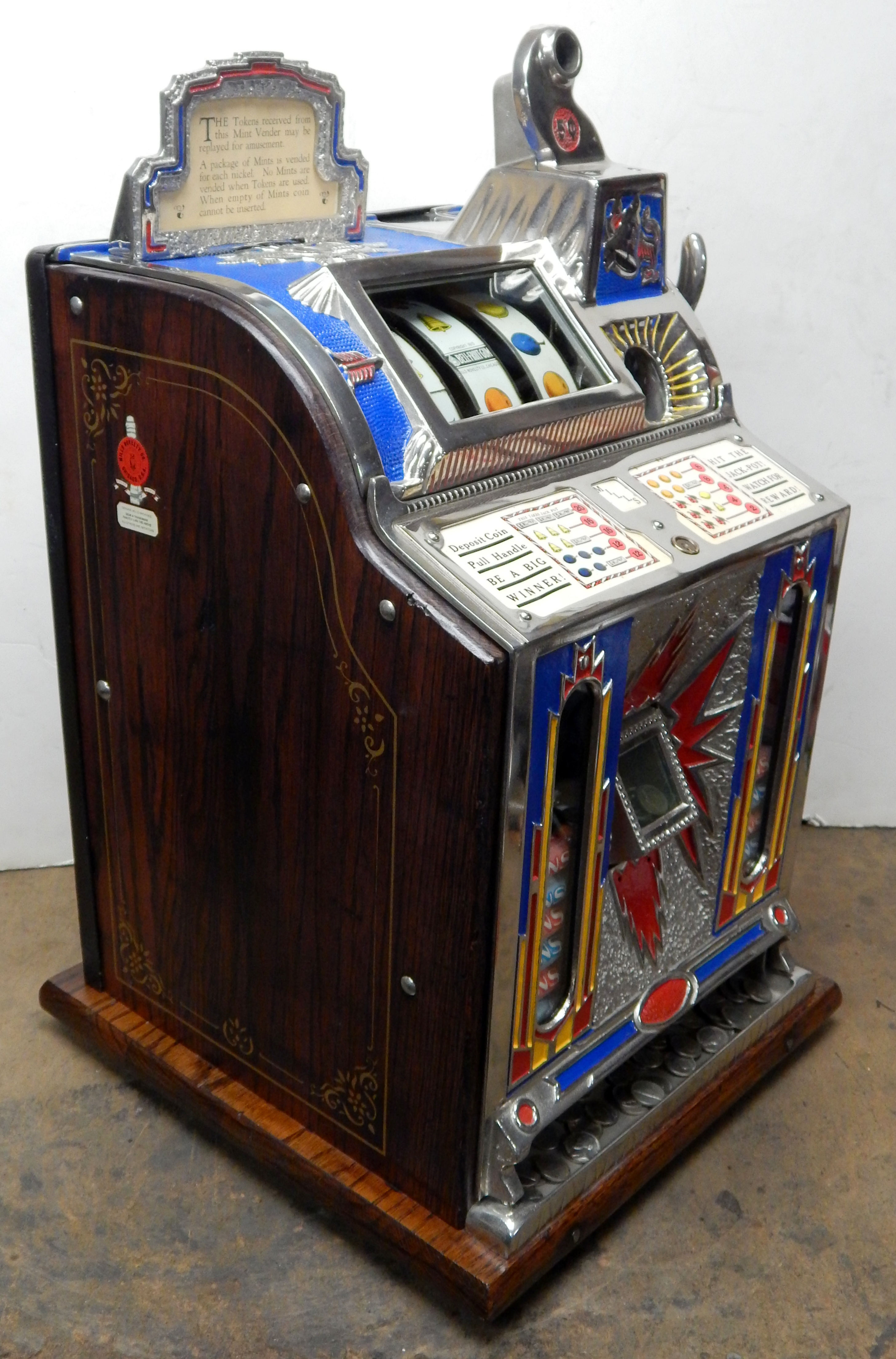 1929 Mills Silent FOK Jackpot Vender, 5 cent. Restored with original tin reel strips in mint condition, working front mint venders, Jackpot, chrome plated castings. Original back door with Mills locks with key, also has the front vender door key. original cash box. Very nice oak cabinet with gold stenciling. Easy to play and pay as it should.