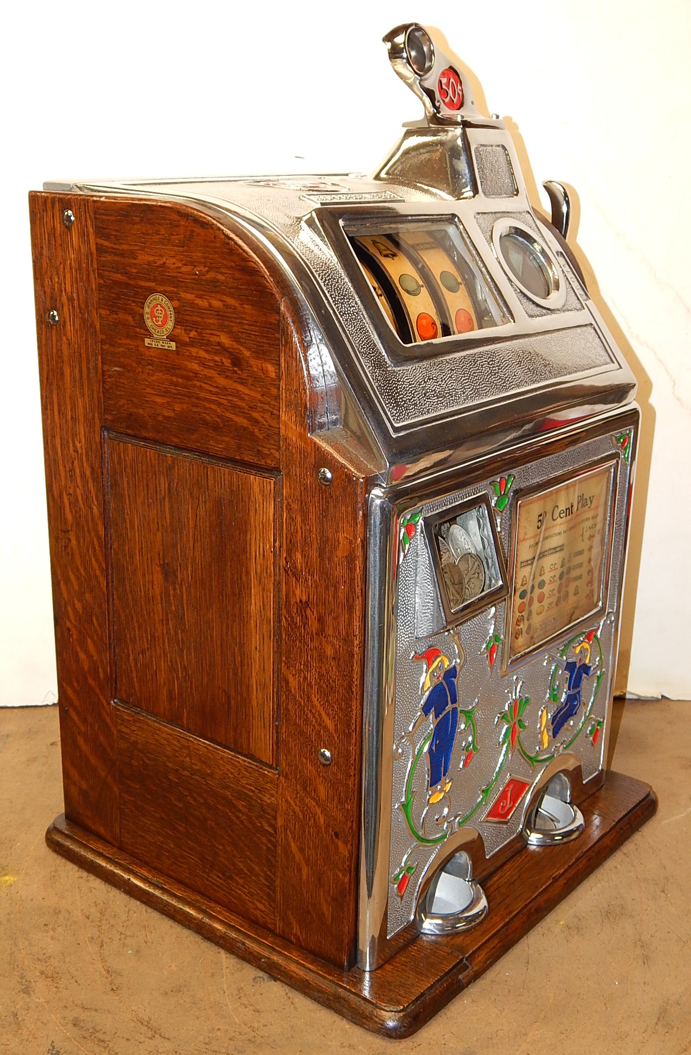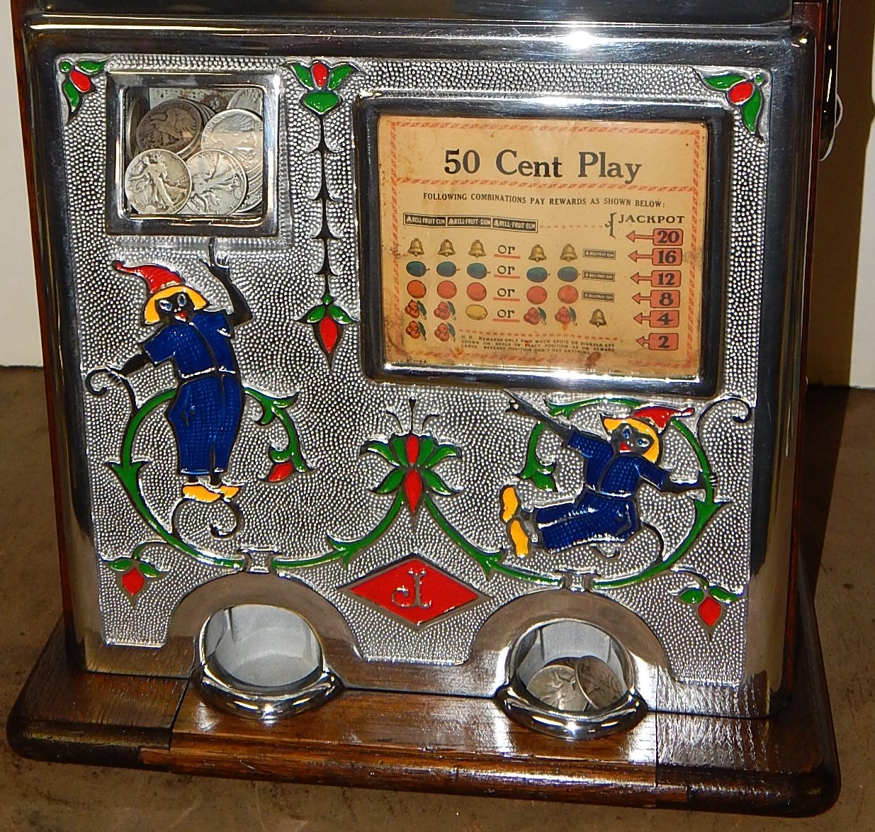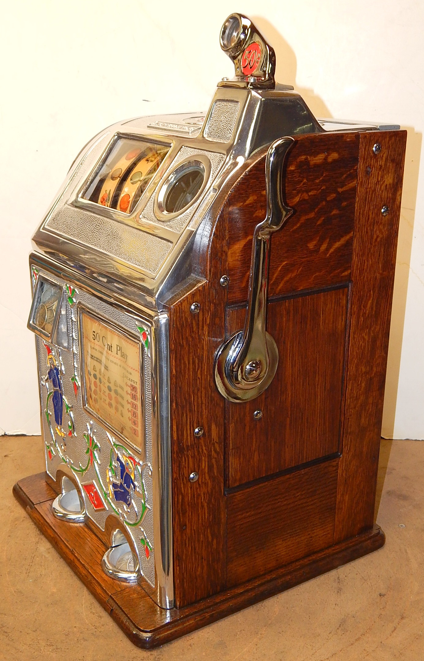 1929 Jennings Blue boy 50 cent, restored, original back door top and bottom with original locks and keys top and bottom, original cash box, original rell strips, original award card. This machine has a 10 stop mechanism with jackpot payouts. The only thing that is not original on this machine is the paint.