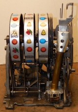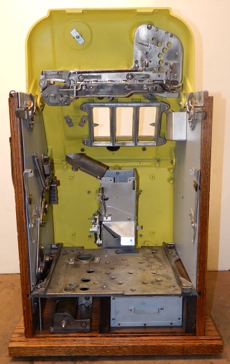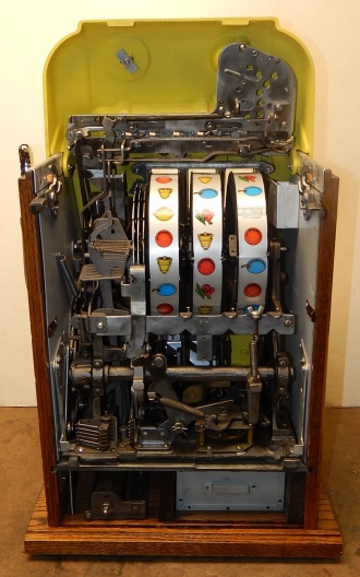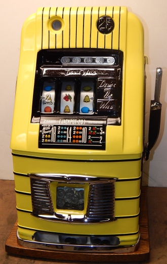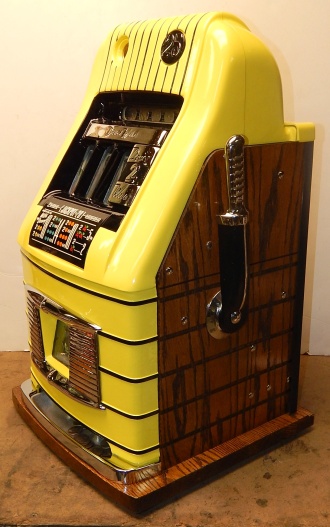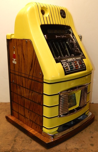 1950 Mills Deuce Wild 25 cent, This is a very nice machine restored to the original colors Yellow with Black. Mint condition award card, Jackpot, original back door and lock with one key, new cash box. All the trim on this machine was chrome plated to add a little flash with the bright color.
