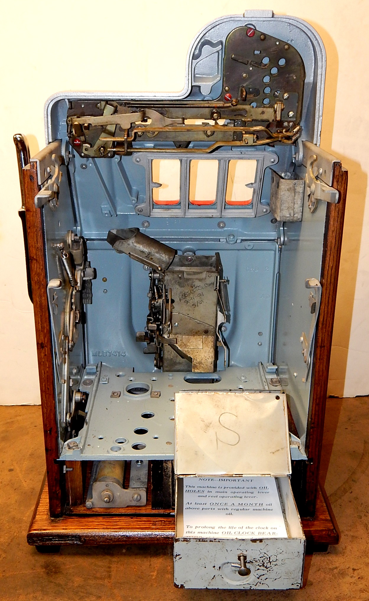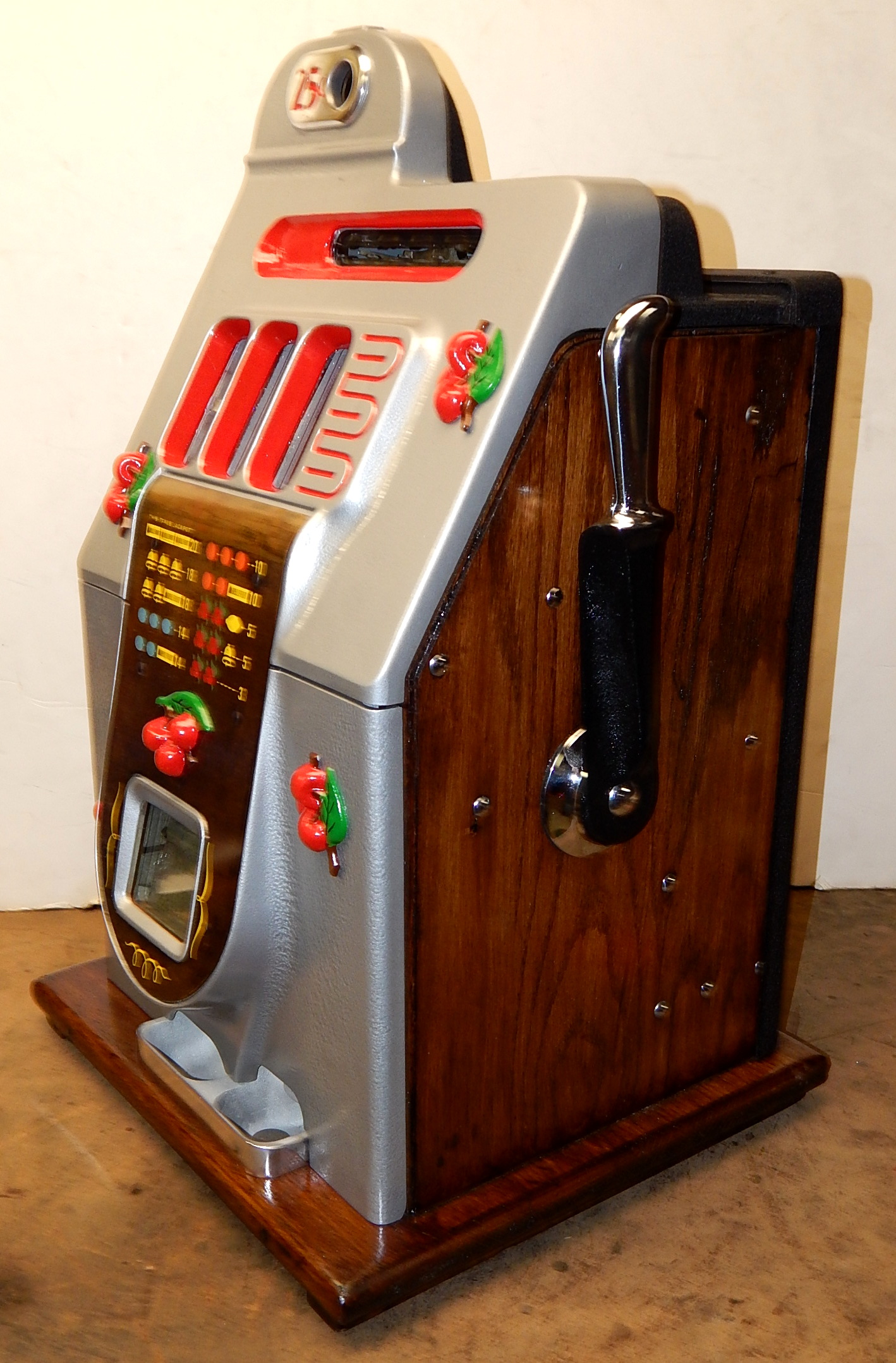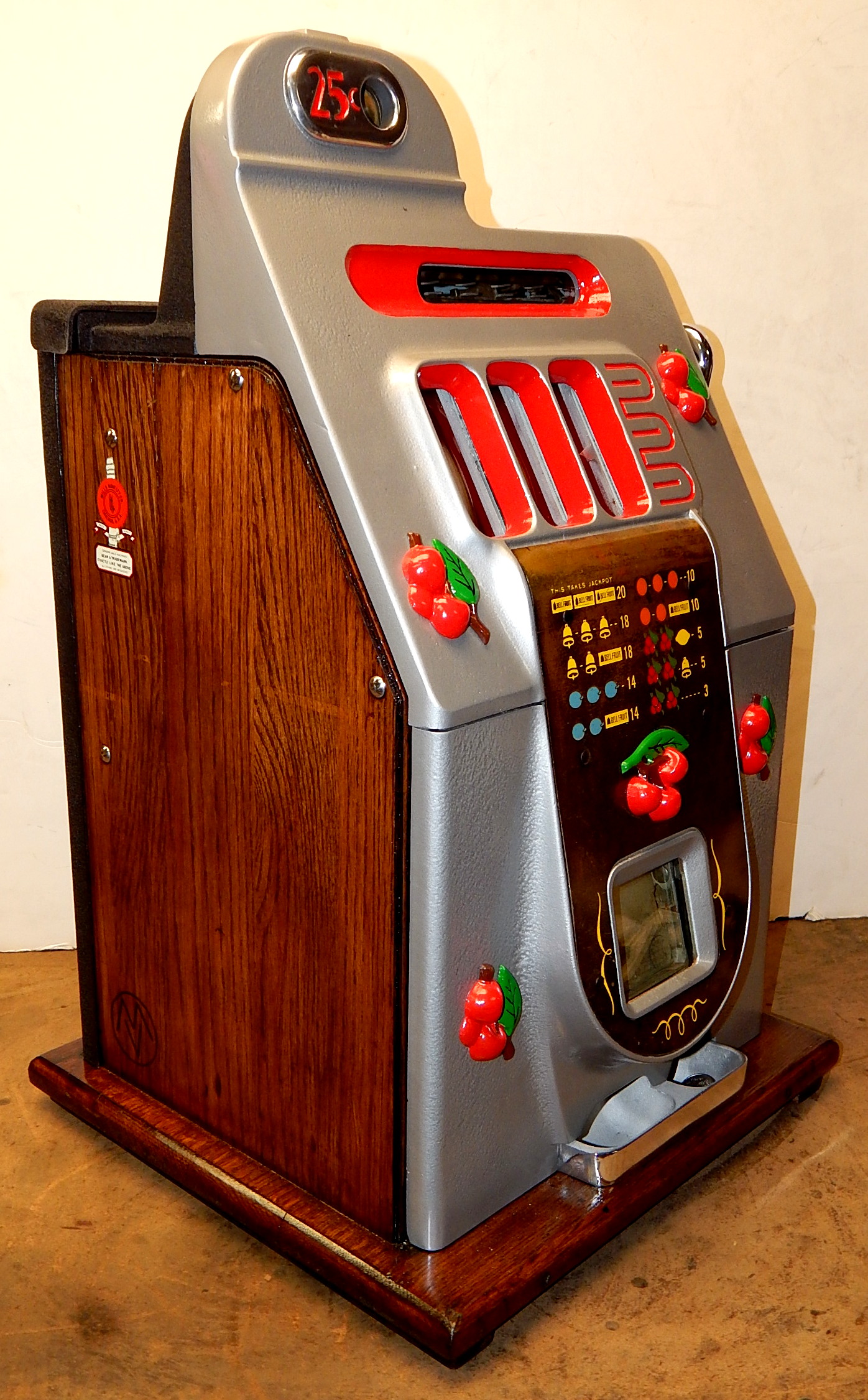 1946 Mills Black Cherry 25 cent, restored. Hammer Silver, trimmed red with oak cabinet This is a very nice machine. Original award card, Original reel strips. Jackpot with reserve. Original back door with lock with one key, original cash box. Plays very easy. A great rec-room machine.