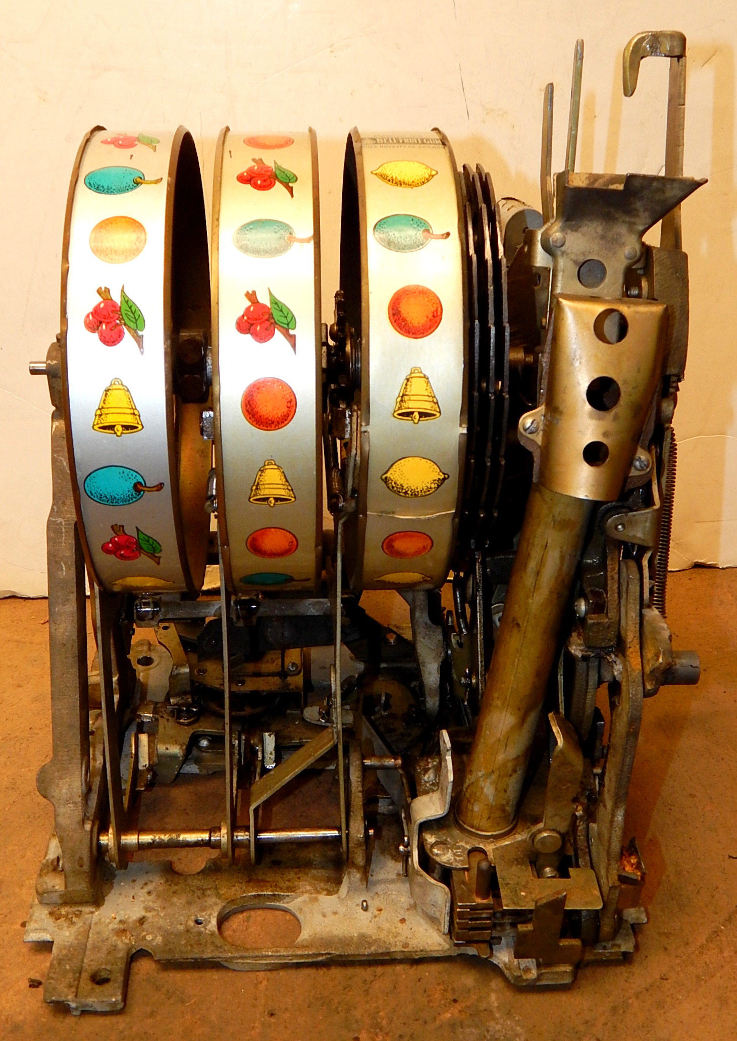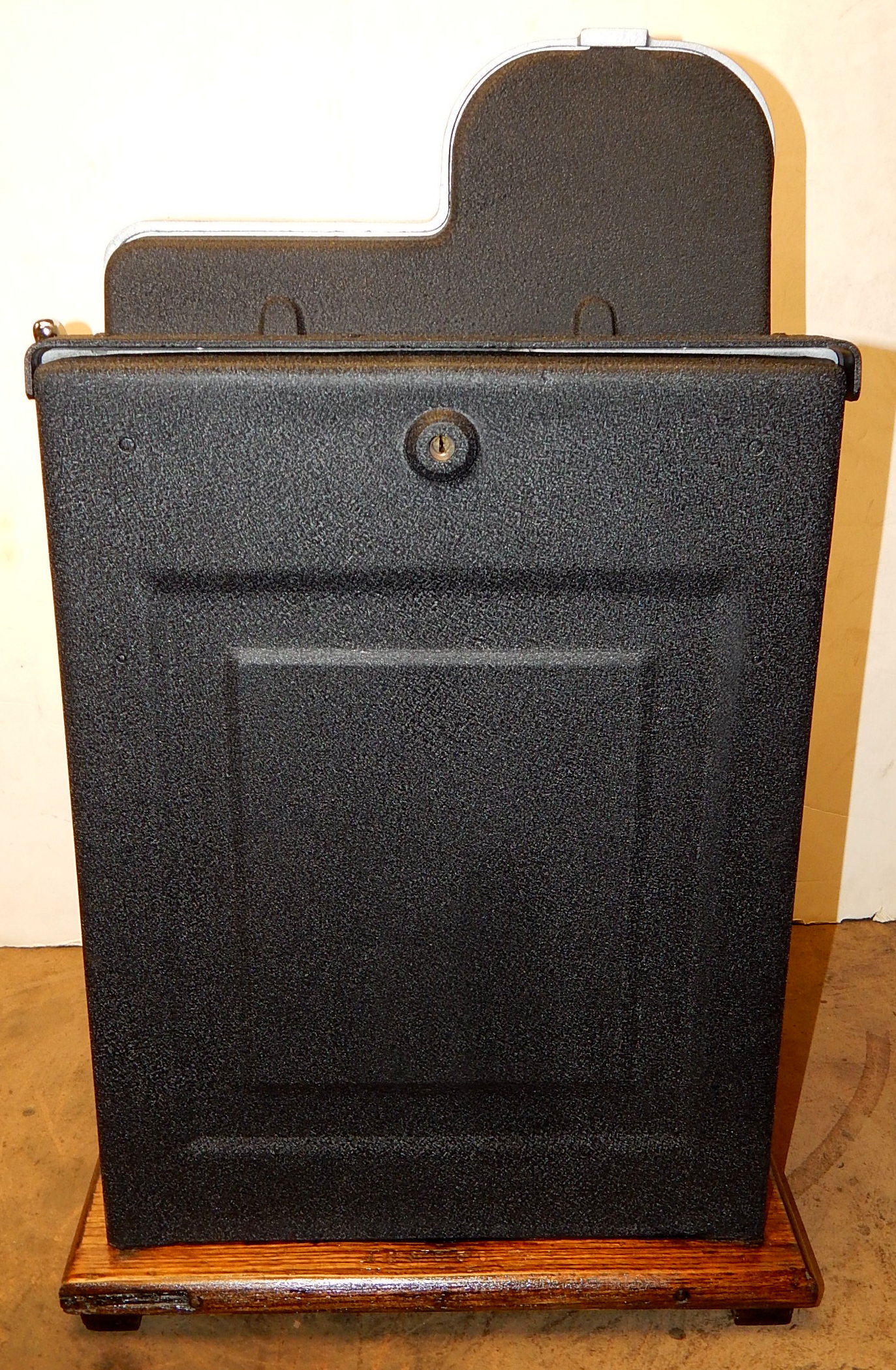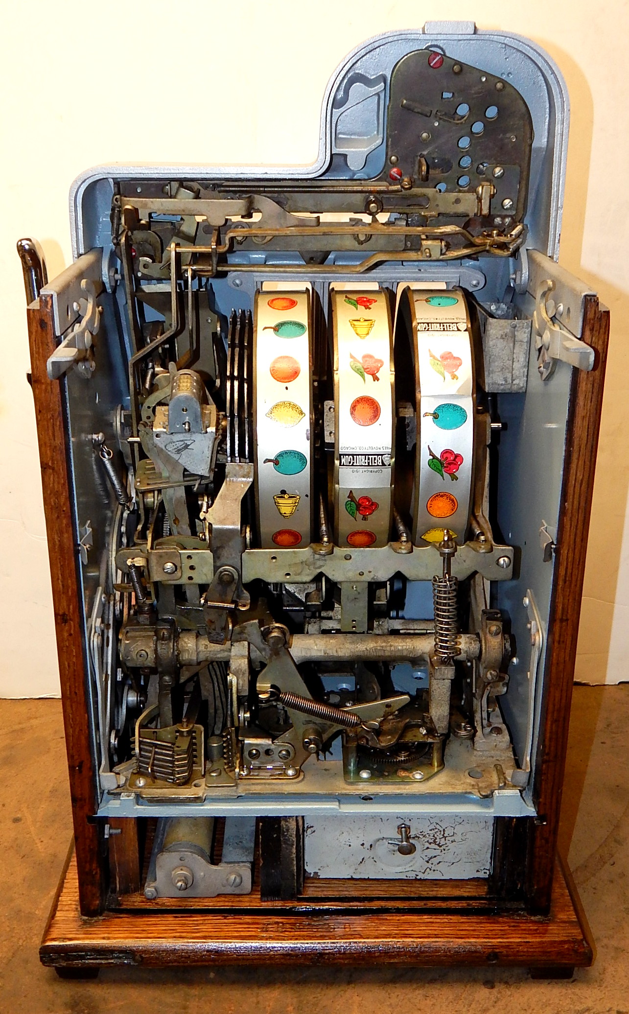 1946 Mills Black Cherry 25 cent, restored. Hammer Silver, trimmed red with oak cabinet This is a very nice machine. Original award card, Original reel strips. Jackpot with reserve. Original back door with lock with one key, original cash box. Plays very easy. A great rec-room machine.