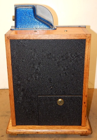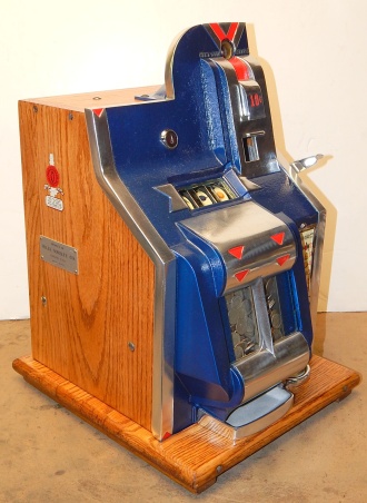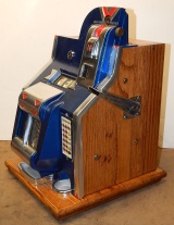 1936 Mills QT "Chevron" 10 cent. This is a very nice machine. Blue and Red in color. Twin Jackpots, original back door, original cash box, new award card, original Mills front and back door locks with Mills keys.  Very nice hard wood cabinet. Measurements 12.5" X 13.5" X 18", 51 pounds. Plays very easy, pays as it should.