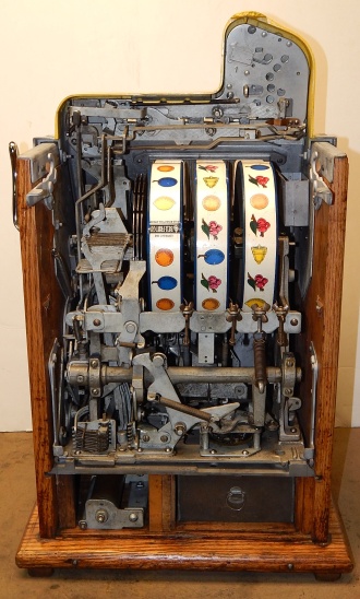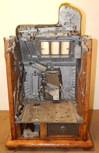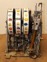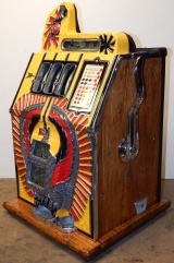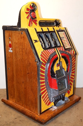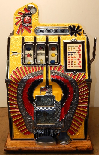 Mills 1935 War Eagle 5 cent, this is a very nice machine complete and original. This machine was restored back to the original colors, Yellow, trimed in Red, Black. Has Jackpot with reserve, original back door with original Mills lock with one key, original Reel Strips, original cash box. The award card is the only thing on this machine that is an reproduction, Plays very nice.