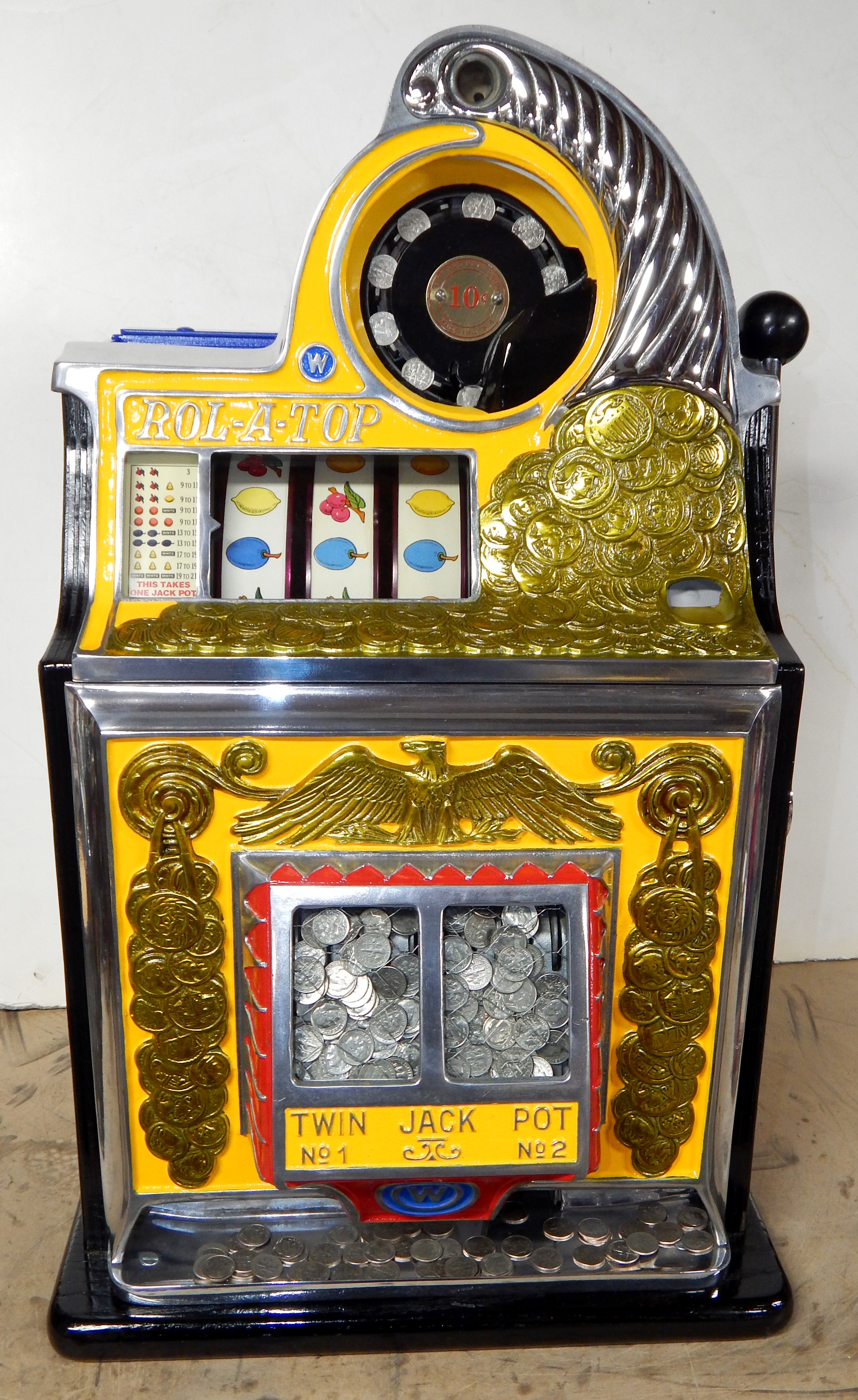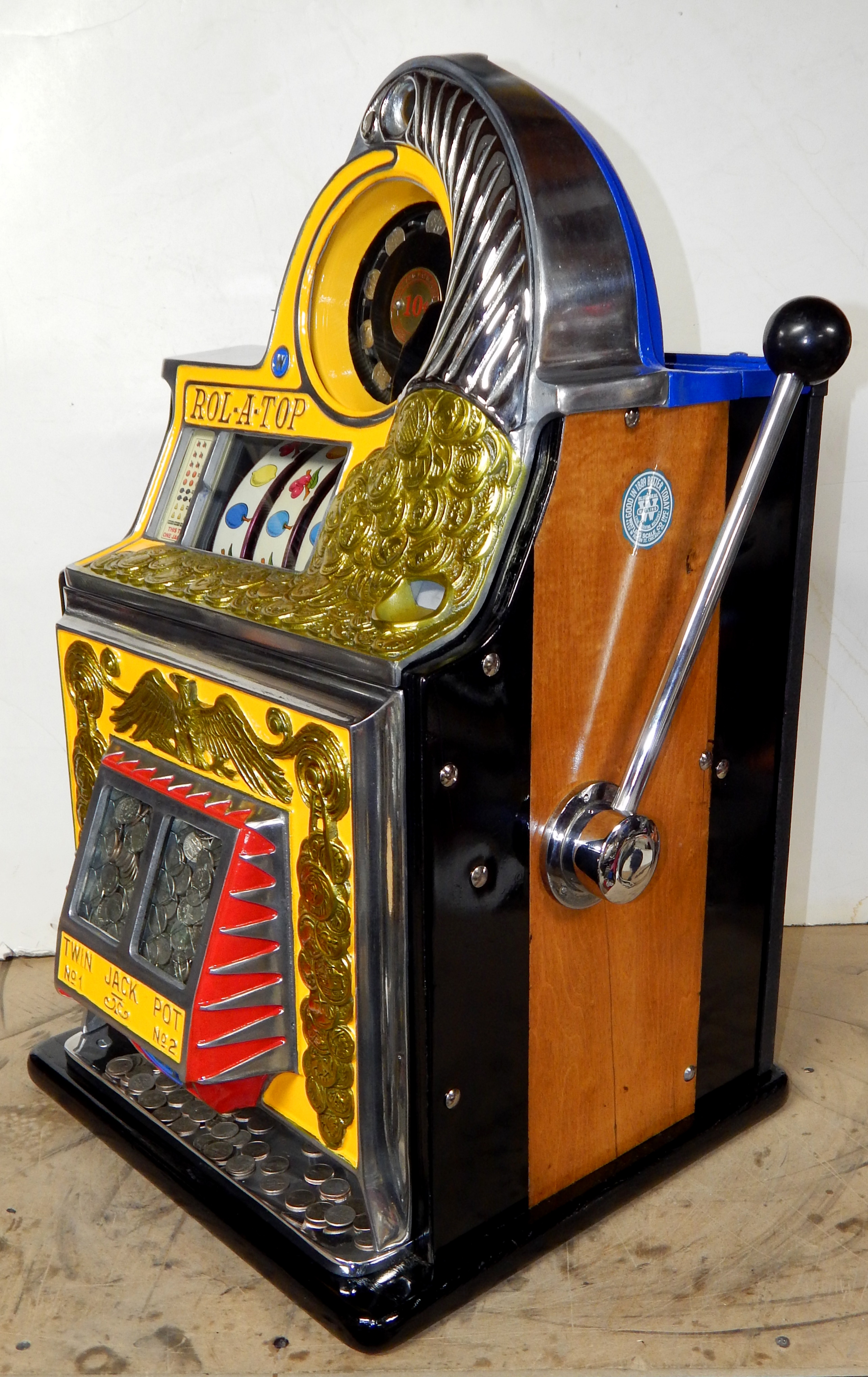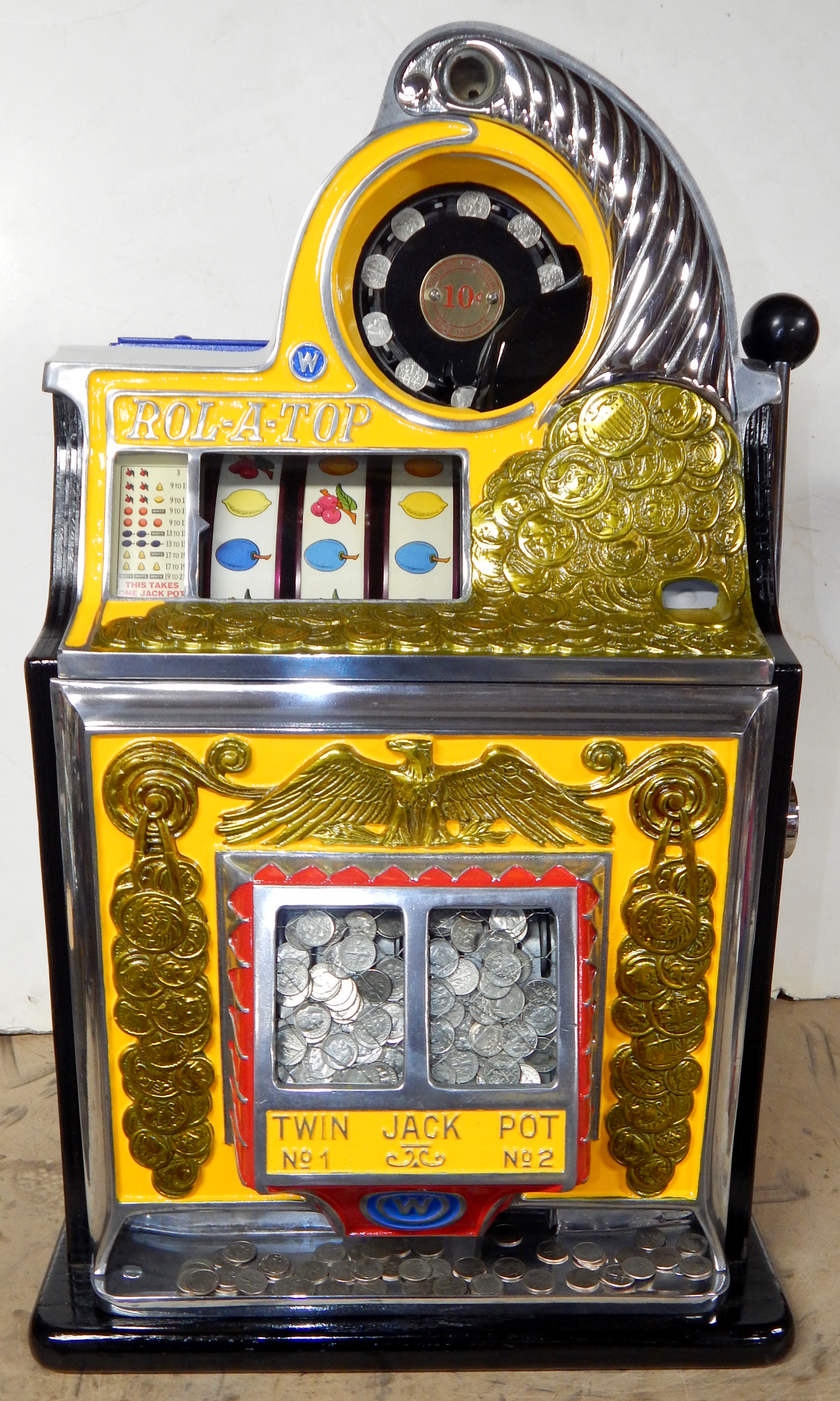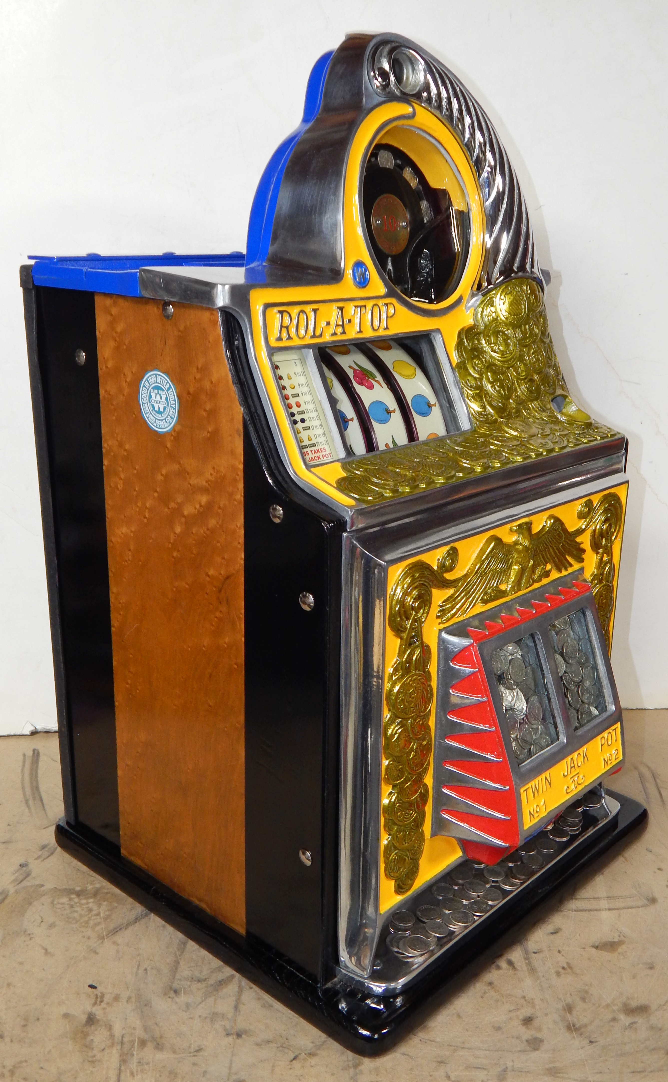 1947 Watling Rolatop "Coin Front" 10 cent, restored back to it original colors, tinted gold coins trim in Yellow, red and blue. Mint original reel strips, original back door with lock and key, very nice cabinet, twin Jackpots, original cash box with original Watling lock and key.