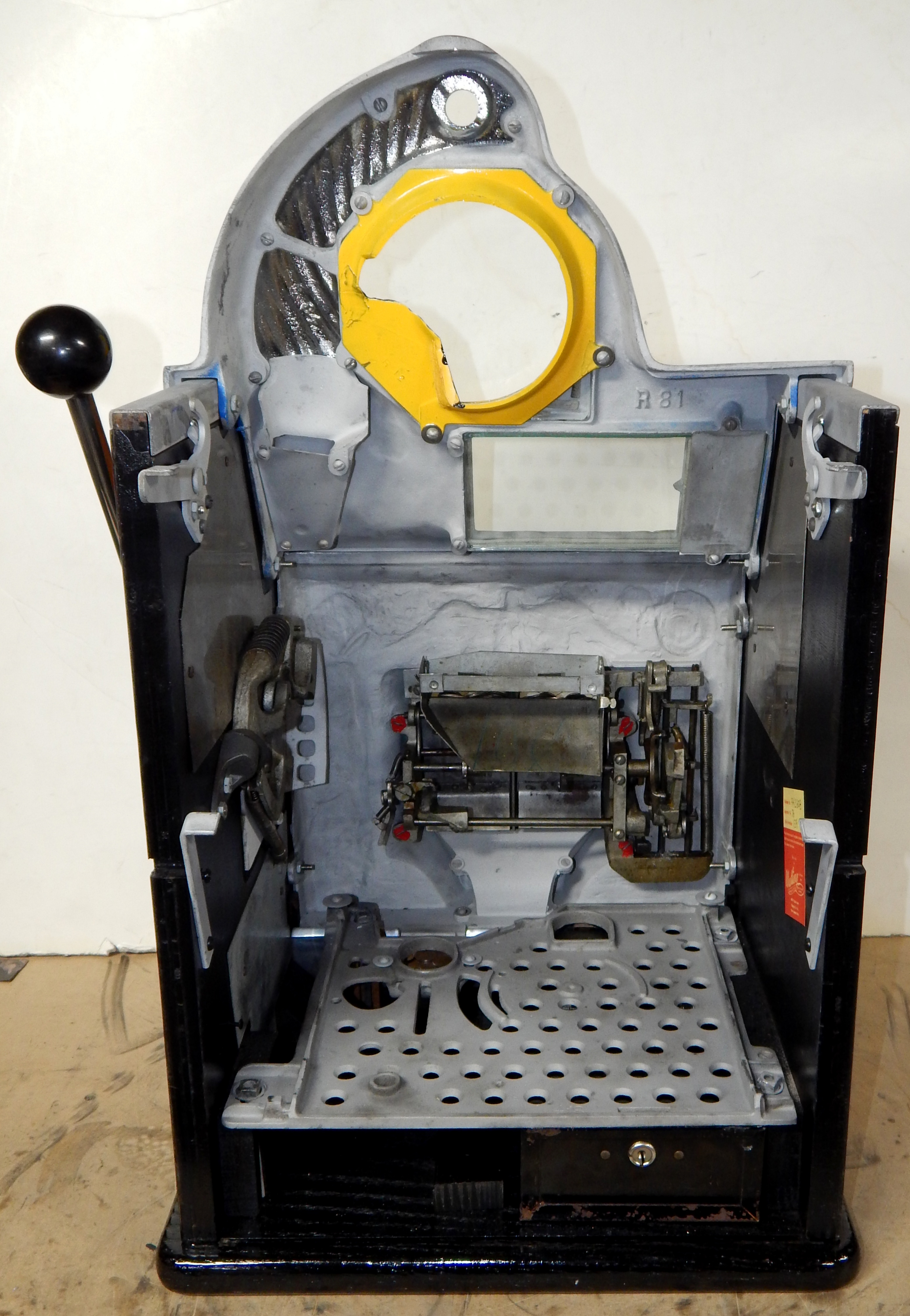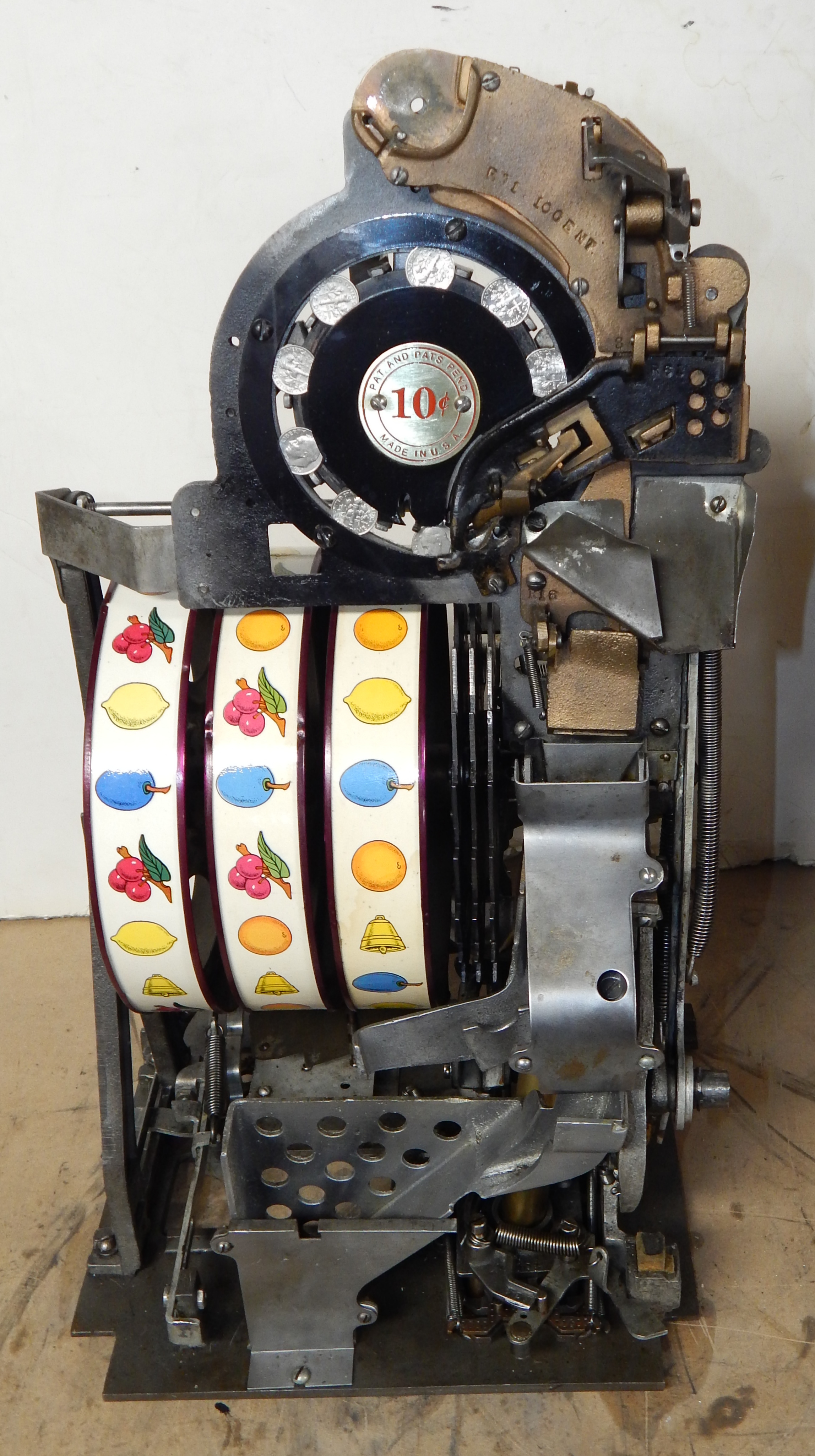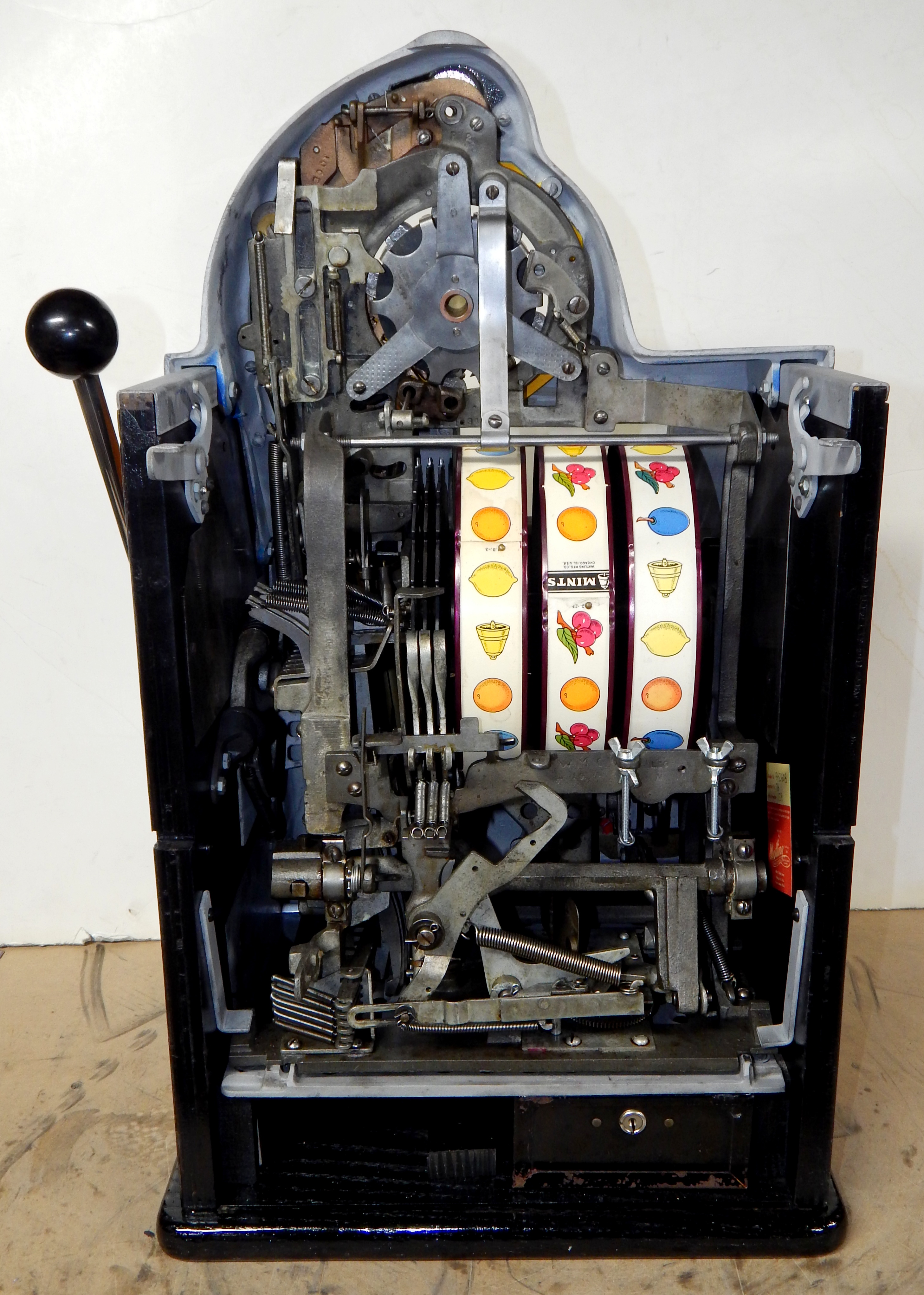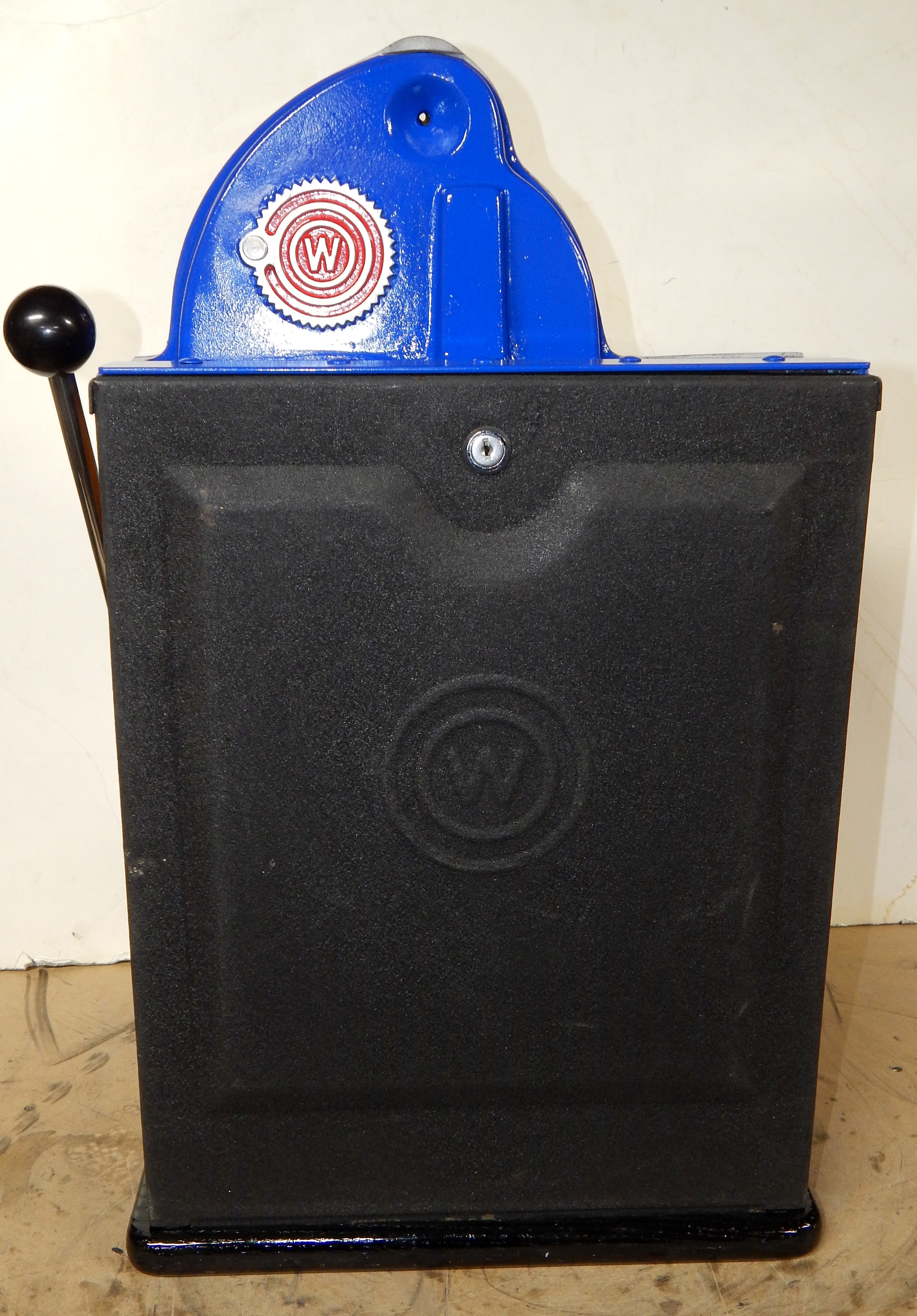 1947 Watling Rolatop "Coin Front" 10 cent, restored back to it original colors, tinted gold coins trim in Yellow, red and blue. Mint original reel strips, original back door with lock and key, very nice cabinet, twin Jackpots, original cash box with original Watling lock and key.