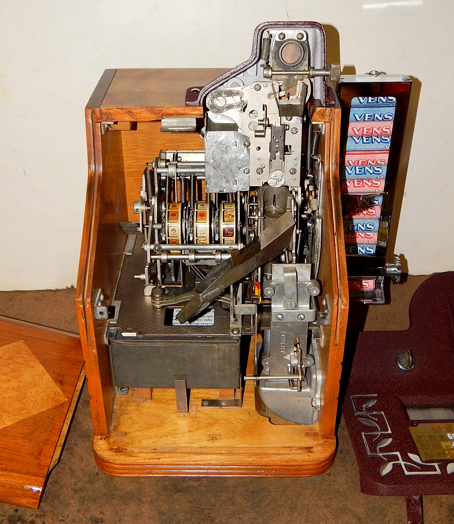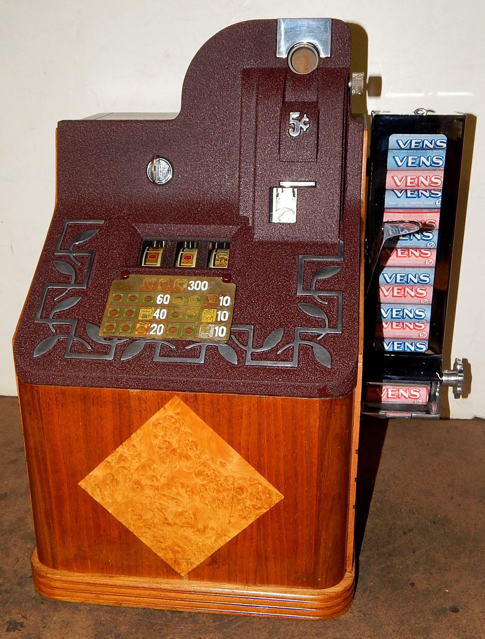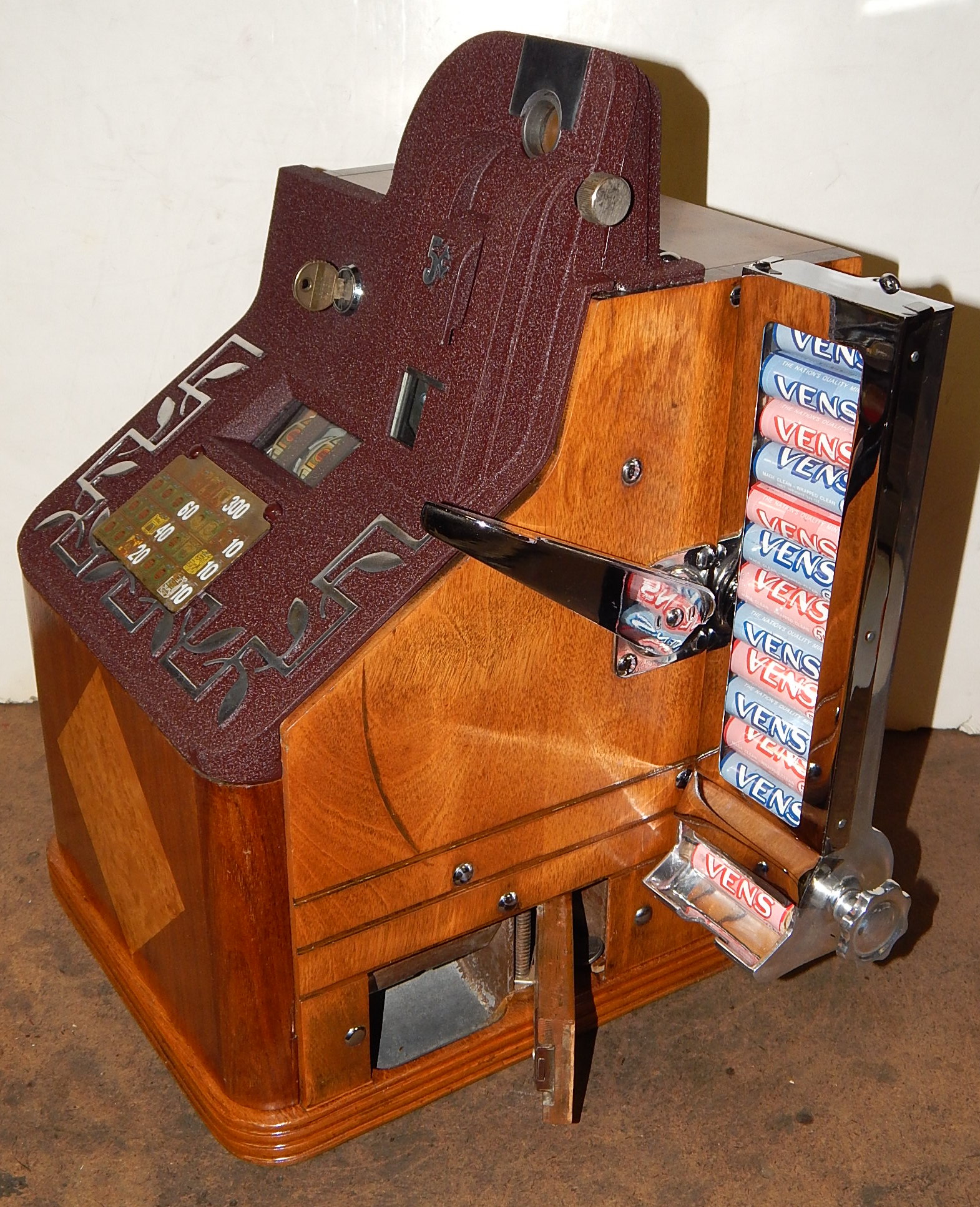 One of the most scarcest QT models, Introduced in 1938, with an estimated 25 to 50 known to exist. A very elegant design having a Birchwood front with diamond design inlay in place of the jackpot which was paid out by dispensed token (3 of which are included). Jackpot was achieved by lining up three packages of Wings cigarettes.The QT Smoker paid out on other winning combinations thru a concealed side payout tray (see picture). Reel strips symbols are cigarette pack of various poplular brands of the day.