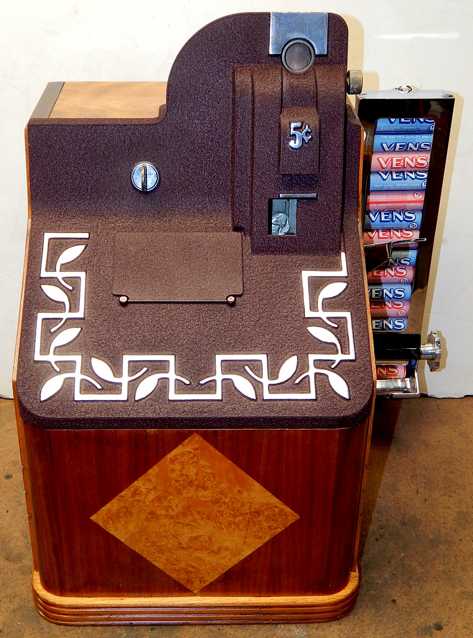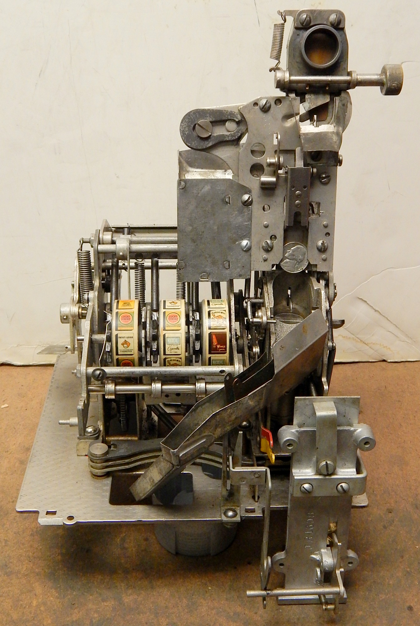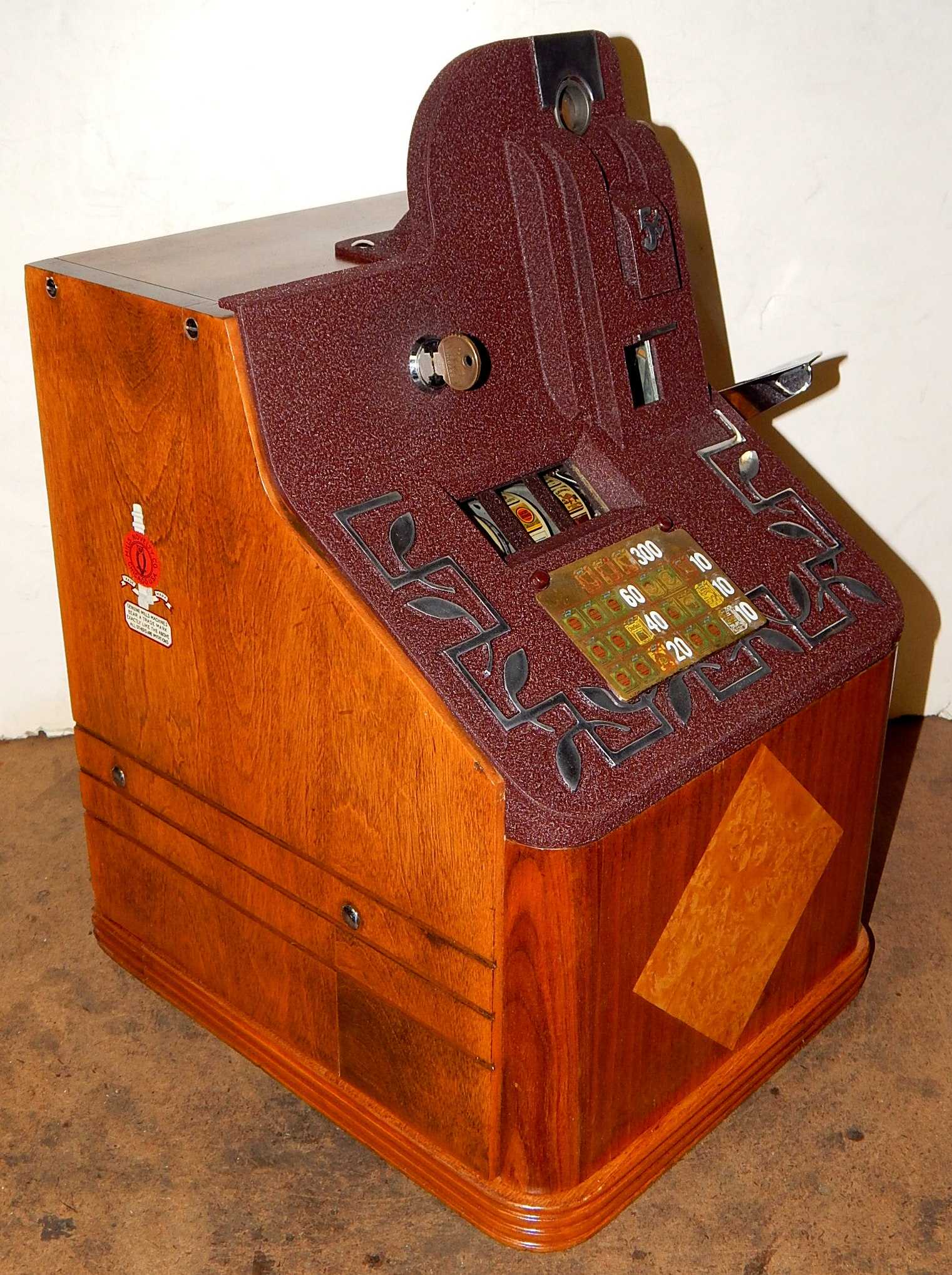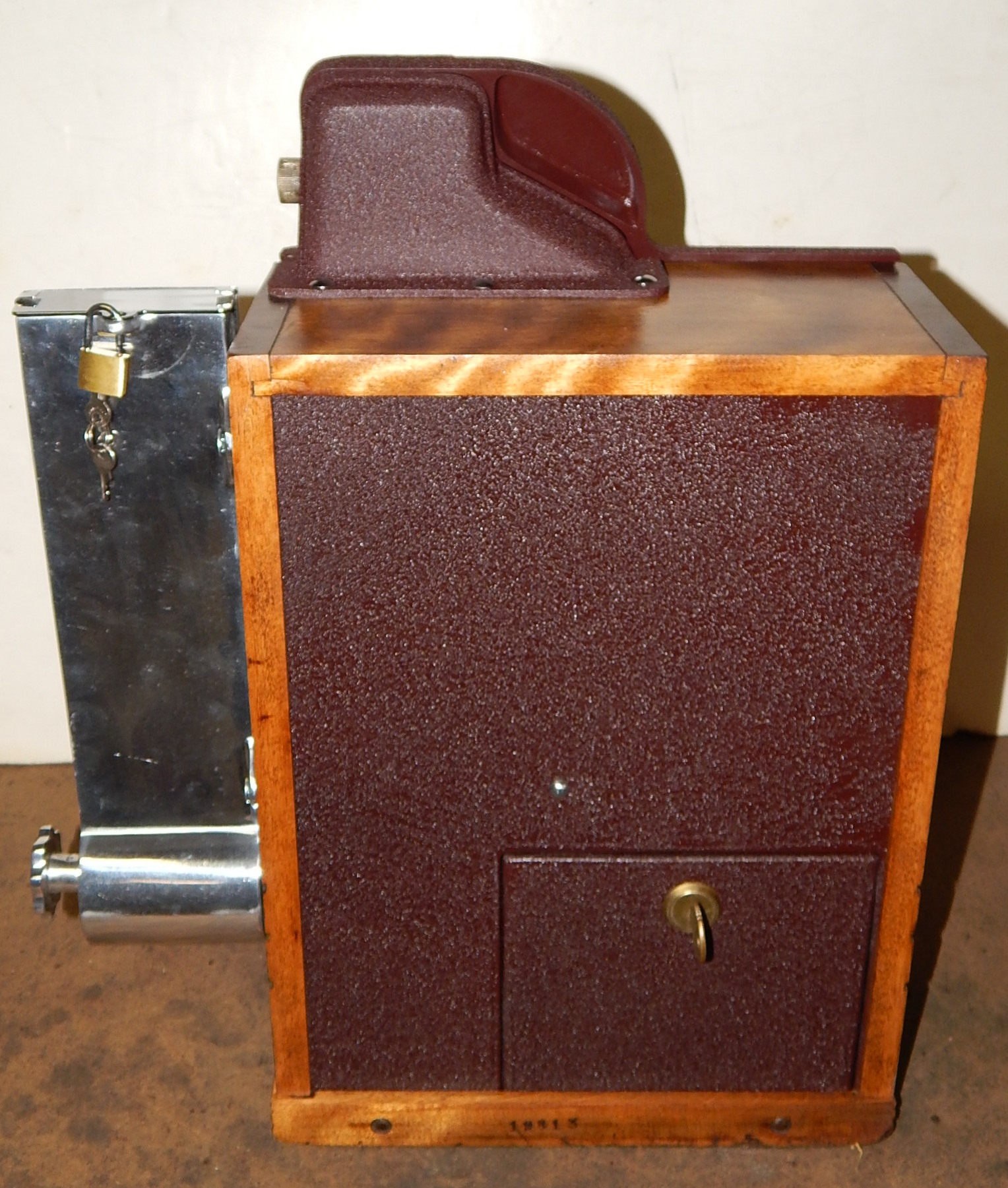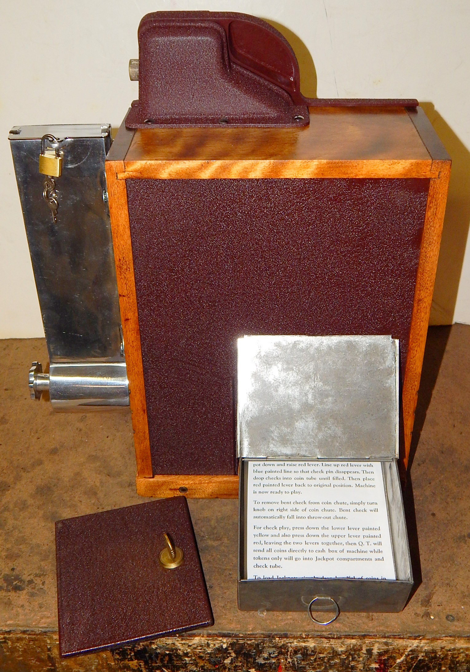 1938 Mills QT "Smoker" 5 cent, with side vendor. This is a very scarce machine. Wrinkle Brown in color. Original cash box, original award card, original reel strips, original Mills front and back door locks with Mills keys, side vendor. Side money tray door has the original lock and key.