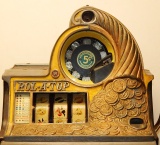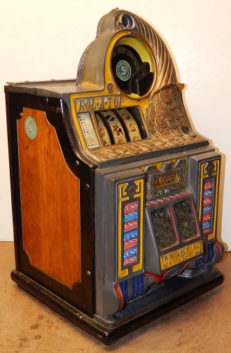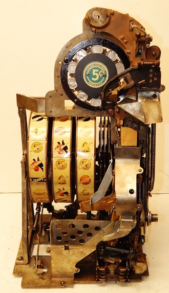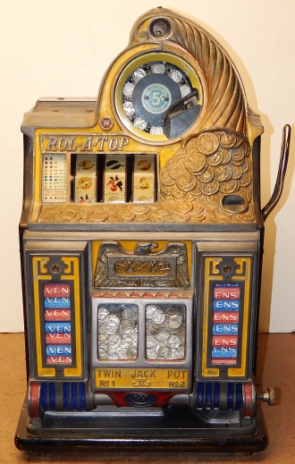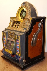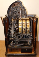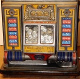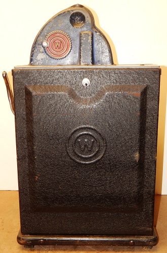 1935 Watling Coin Front, 5 cent with Gold award. Original Condition with American coins on the top casting. Tin fortune reel strips, original back door, original Watling back door lock with two keys, Original mint vendors with Watling lock and key. Twin Jackpots, original cash box with lock and key# Bap8, four Gold Award tokens. Plays very easy and pay as it should. If you are looking for a very nice original Watling slot machine here it is, the way you want to find them.