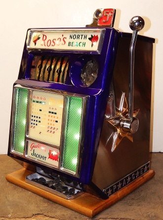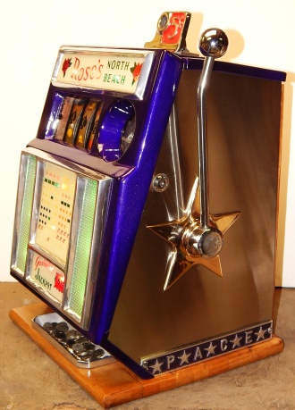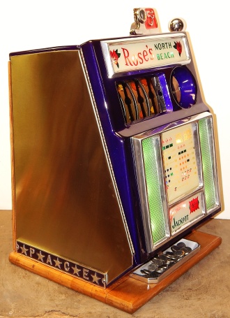 1963 Pace "Aces" four reel "light-up" 5c restored. A little story about this machine. This machine was built in Glenburnie, Maryland in the 60s. What is so interesting about this machine is that it was operated in North Beach Maryland, at a restaurant called Rose's just out side of Chesapeake Beach. North Beach was a place my family would spend a week vacation at when I was a kid. I can still remember all the slot machines in all the stores and restaurants in North Beach. This machine was just purchased in a local auction in Maryland a couple weeks ago and bought to us for restoration. Funny how things seem to stay in the same place over its life time.