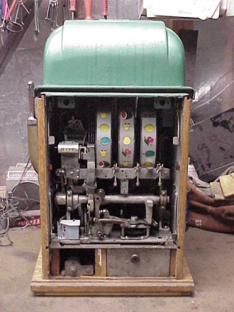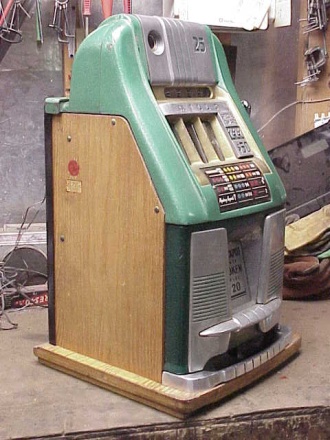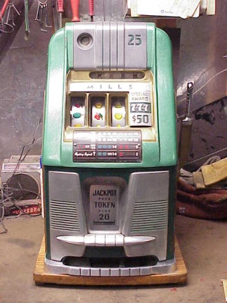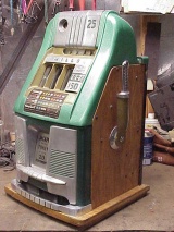 25 cent Mills 21 Token Bell in original condition, reel strips are in mint condition. This machine comes with both, 7-7-7 token vendor and Jack-pot token vendor. Both Vendor have original tokens, the 7-7-7 tokens still have the original envelope they came in. The back door and money box door have original Mills locks keyed alike. This machine has been cleaned, lube and adjusted . Ready for many years of trouble free play.