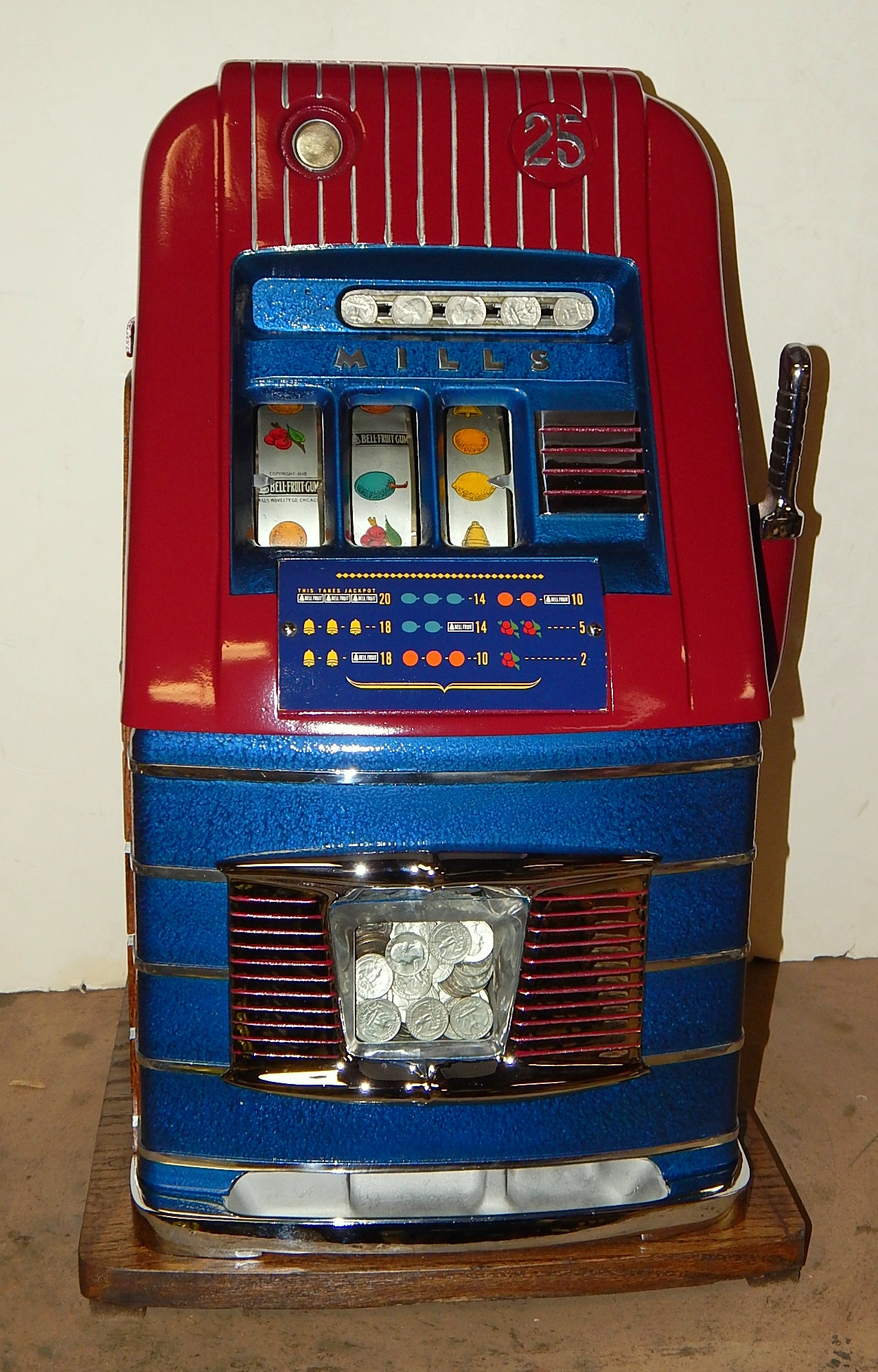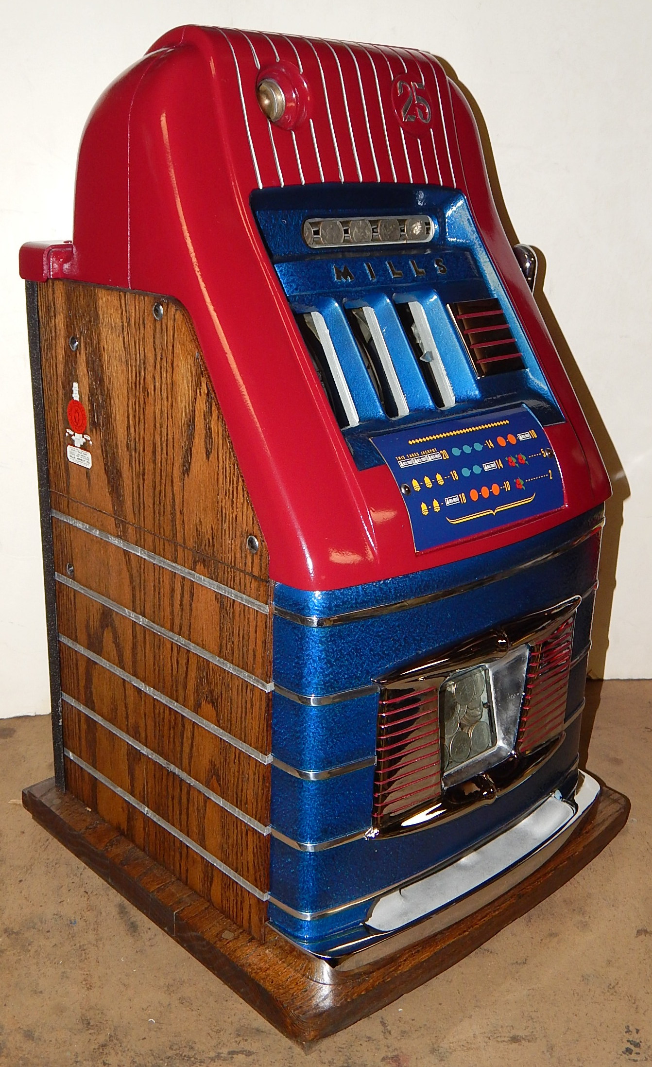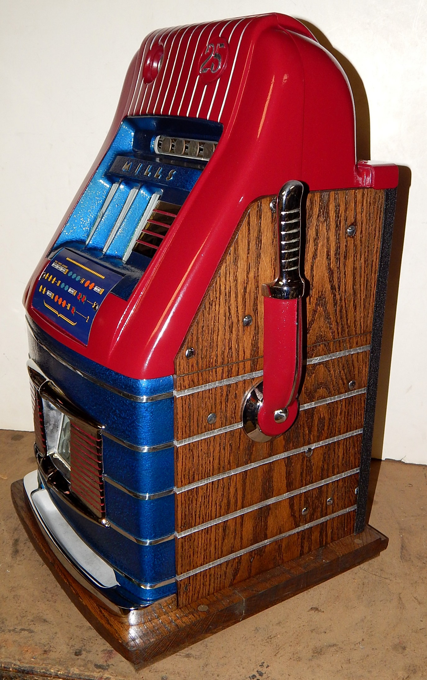 Mills 1946 Jewel Bell Hi-Top 25 cent, "restored" back to the original colors. Full Jackpot with original award card, original reel strips, original back door, original cash box, original oak cabinet, all trim on this machine is chrome plated. Plays very easy.