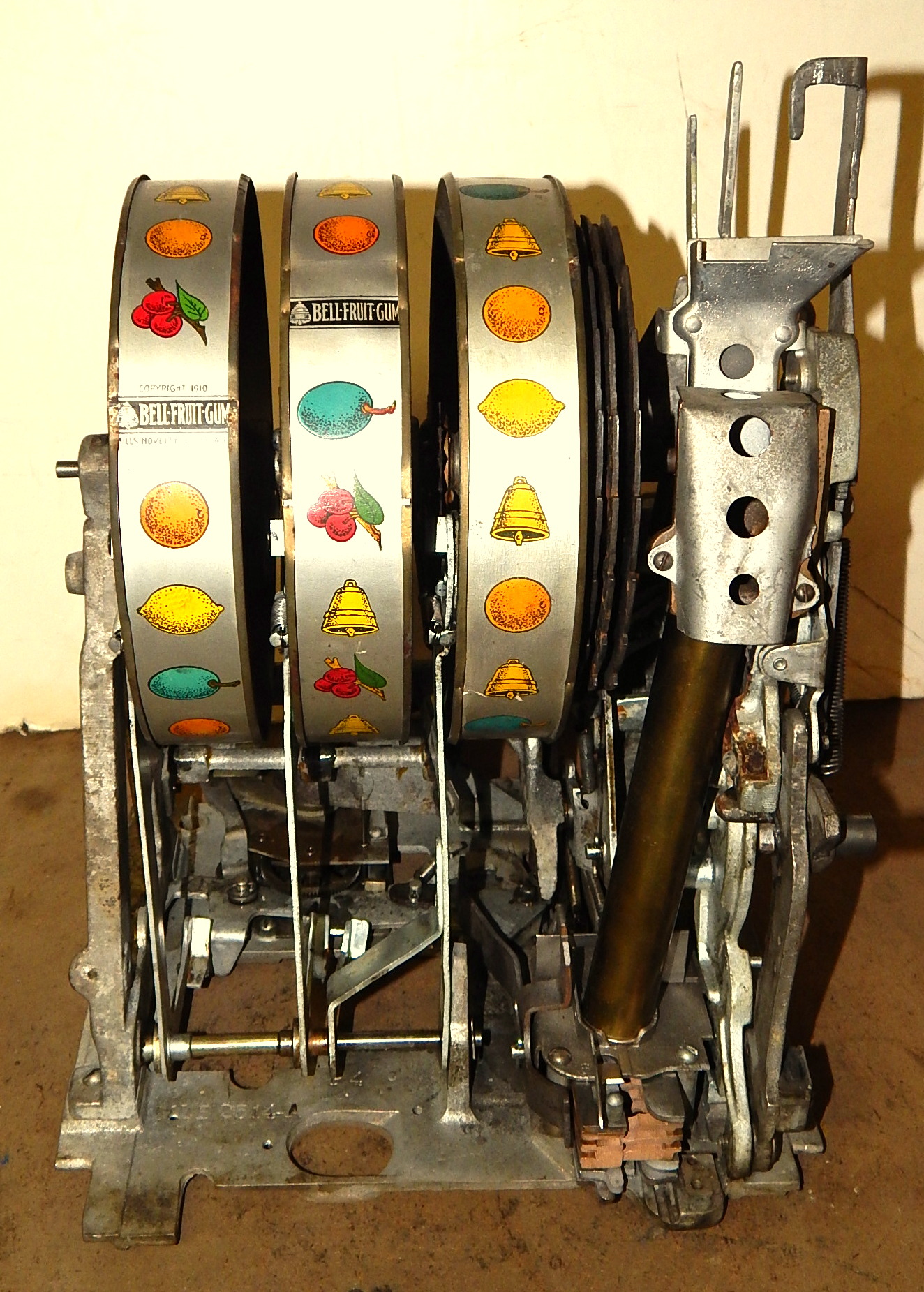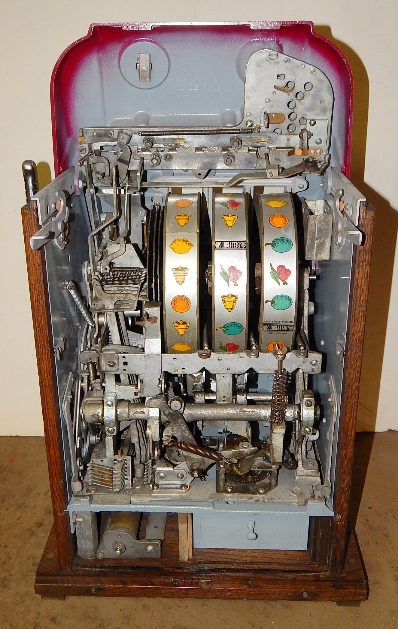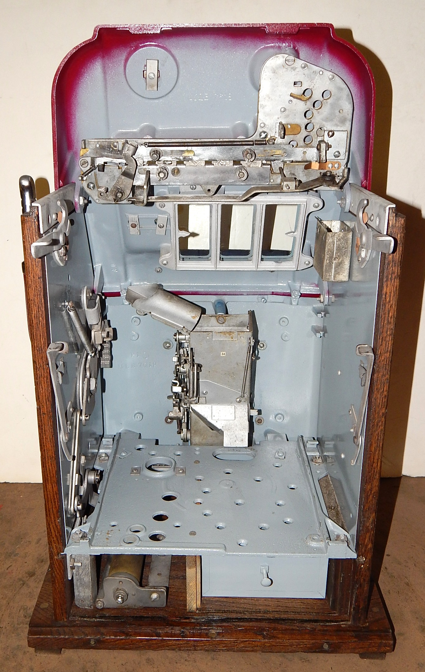 Mills 1946 Jewel Bell Hi-Top 25 cent, "restored" back to the original colors. Full Jackpot with original award card, original reel strips, original back door, original cash box, original oak cabinet, all trim on this machine is chrome plated. Plays very easy.