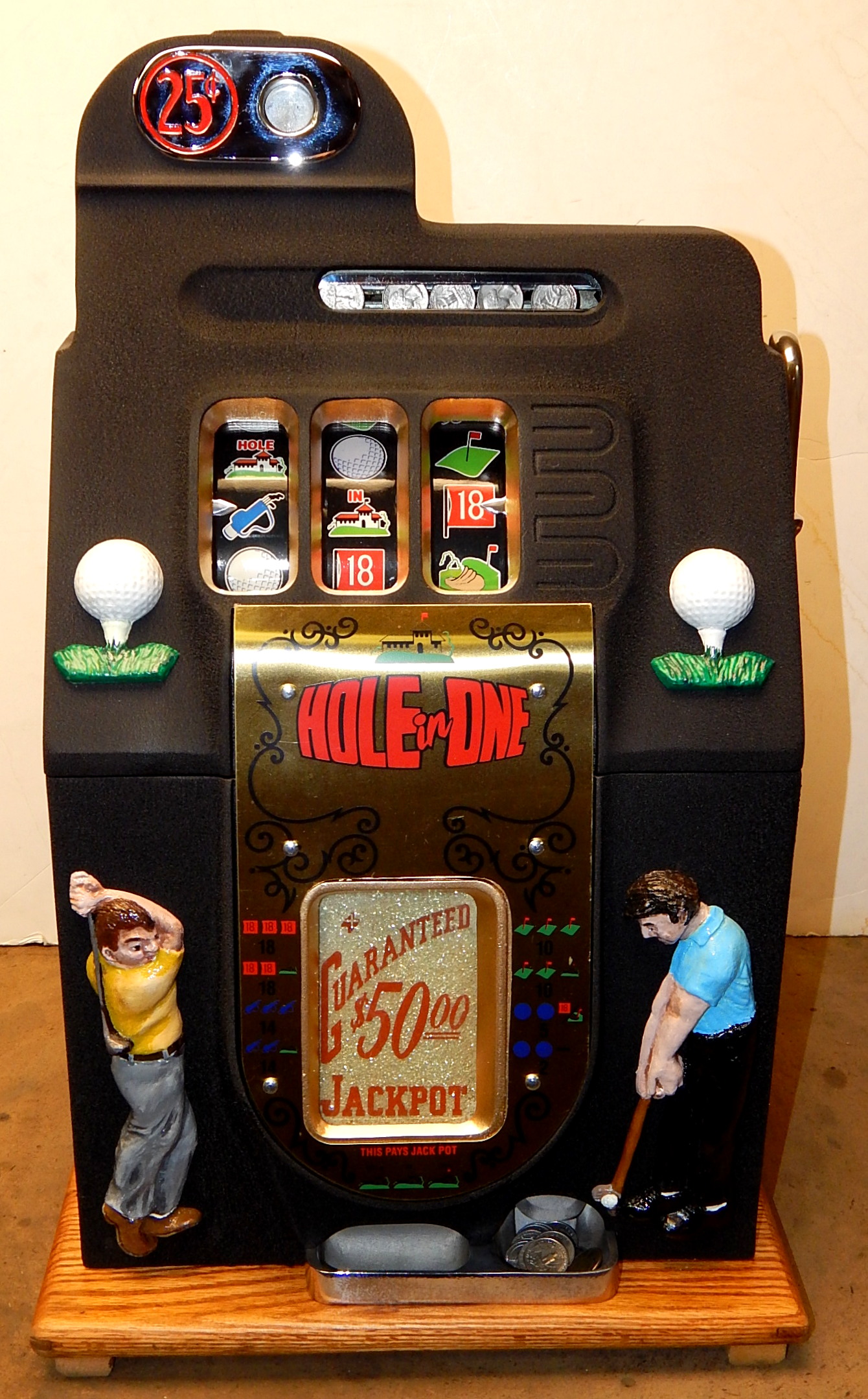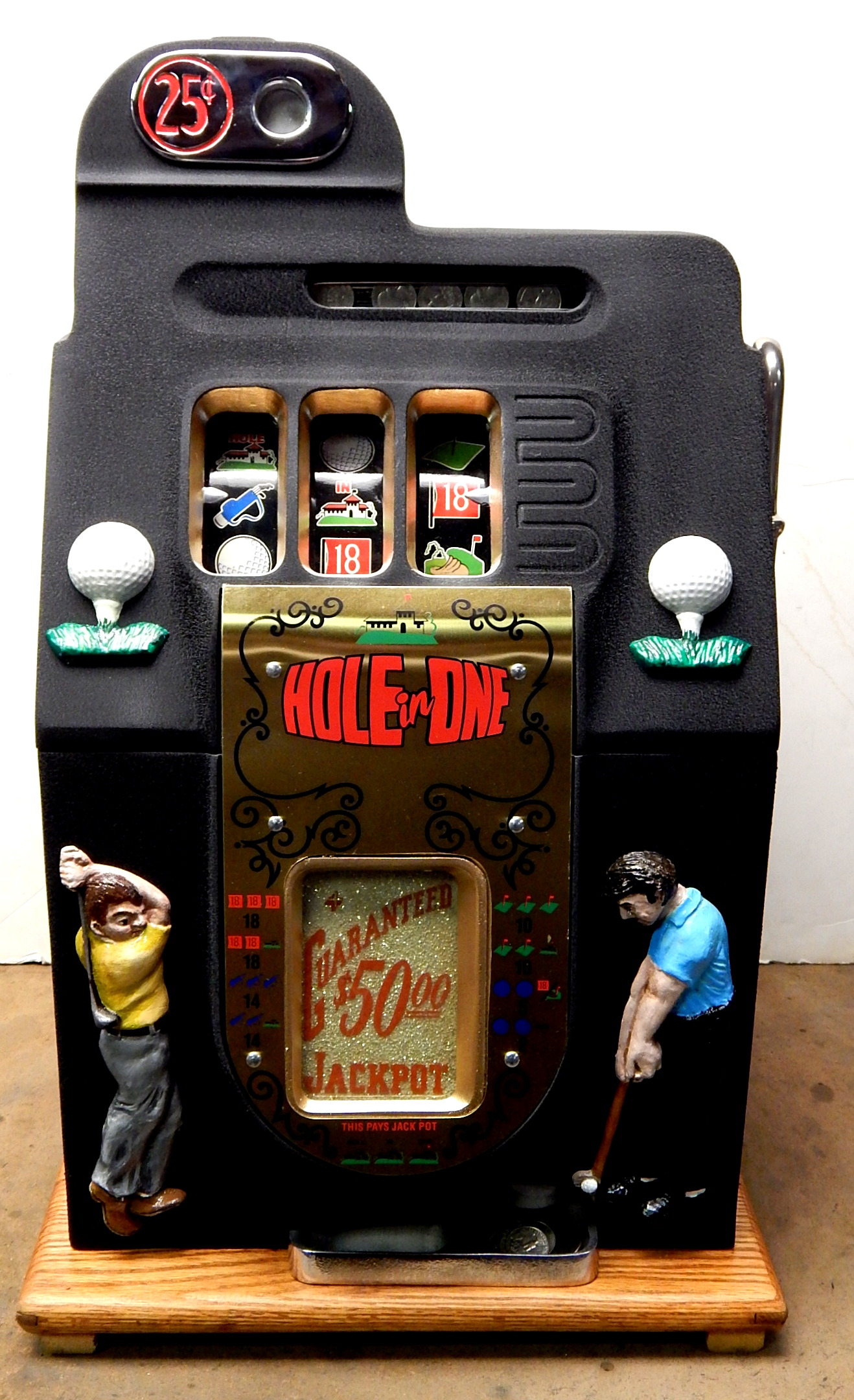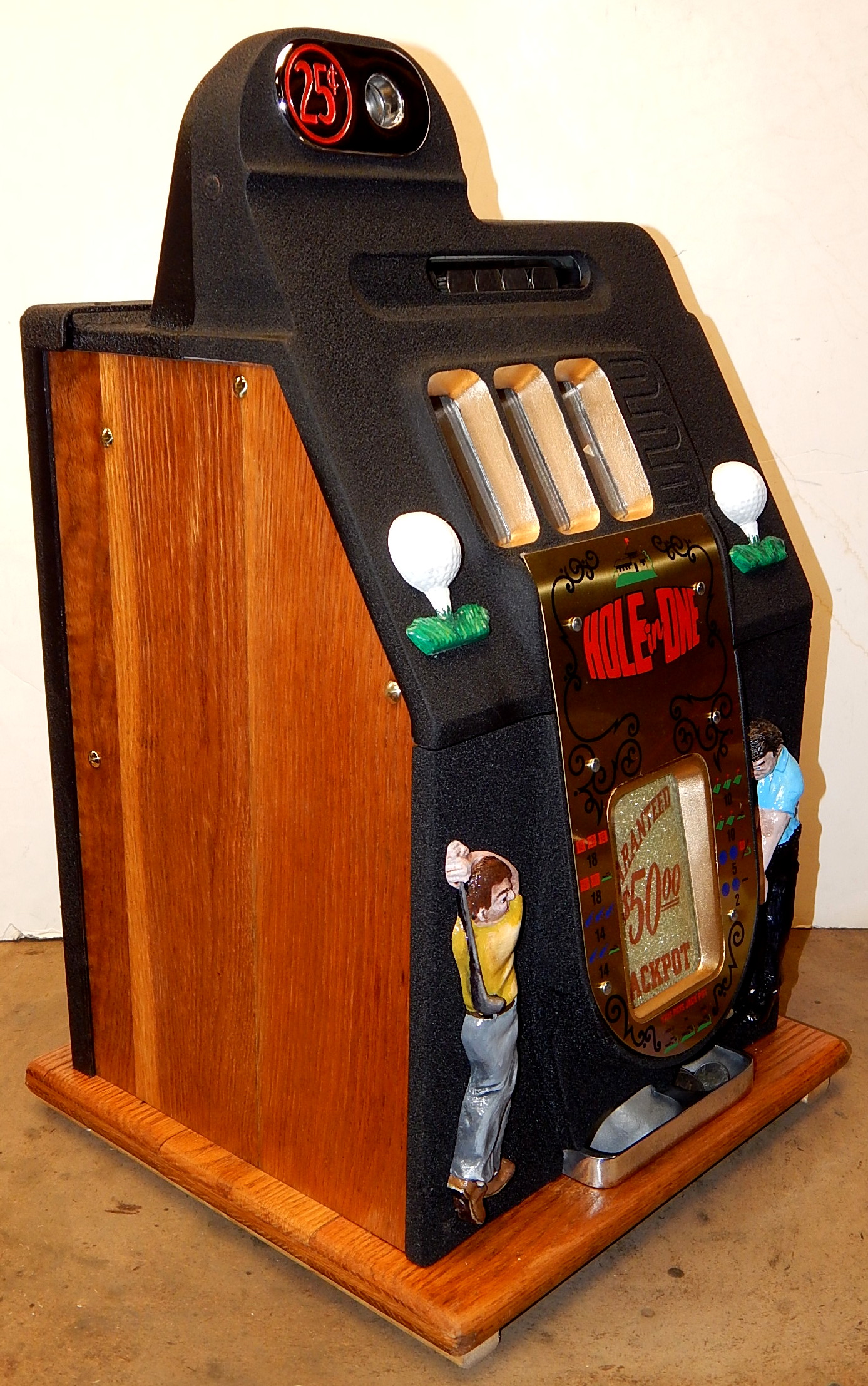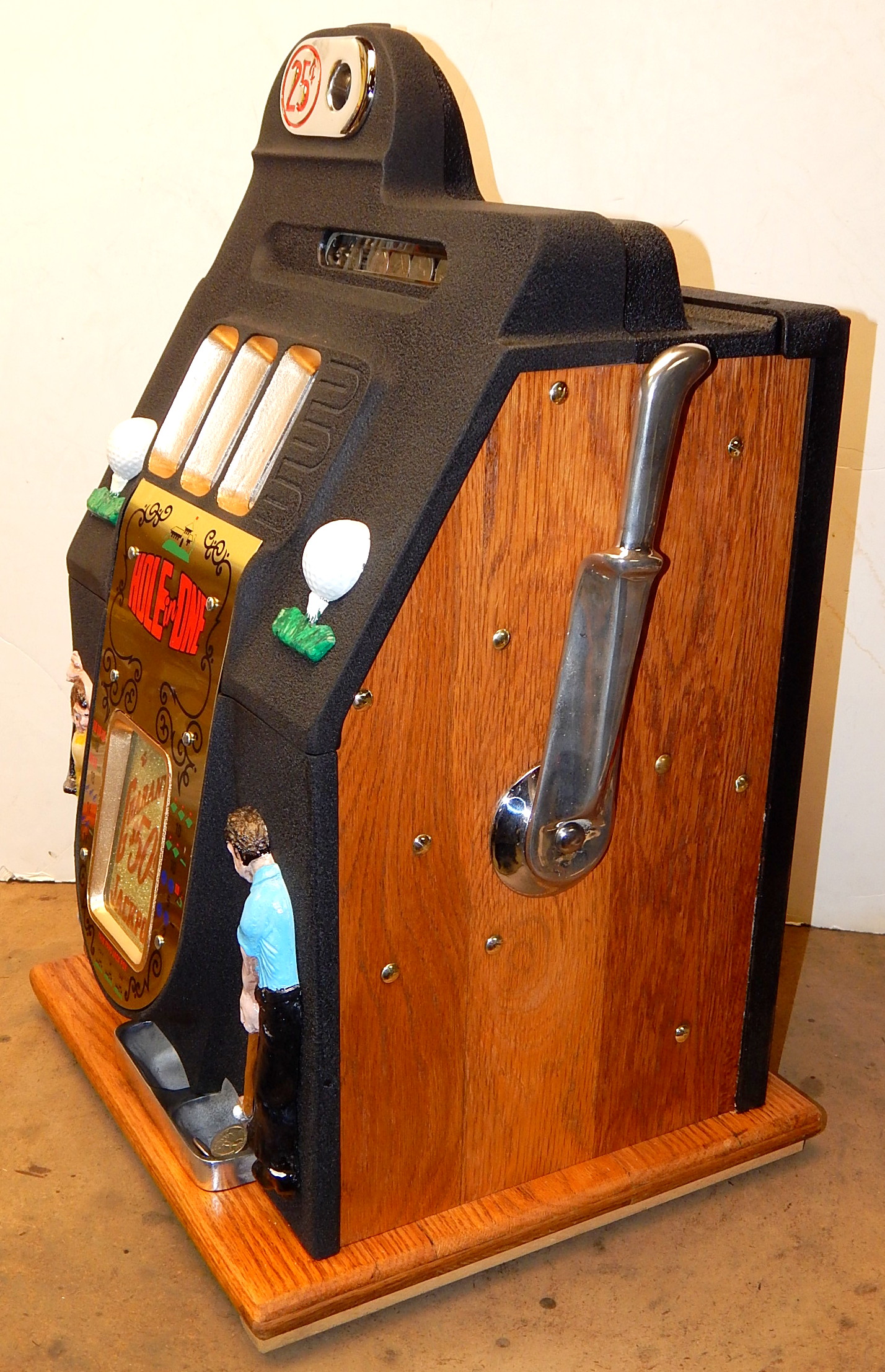 1949 Buckley "Golfer" 25 cent, restored, painted wrinkle black, trimmed in gold with oak cabinet This is a very nice original machine with a golfer kit added. New award card, new reel strips, original back door, original cash box. The jackpot on this machine is a token vendor and comes with five original $50 tokens. Plays very easy. A great rec-room machine.