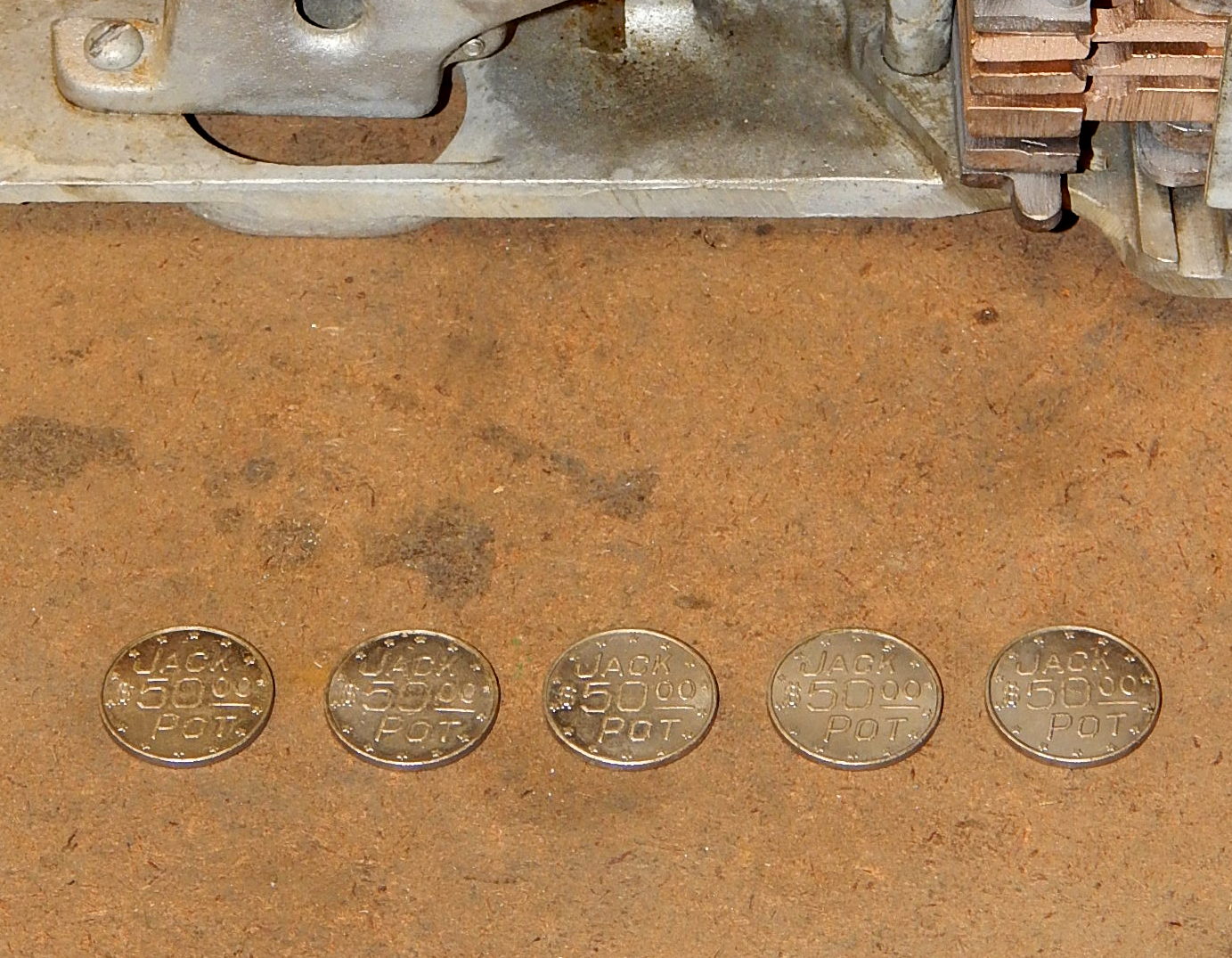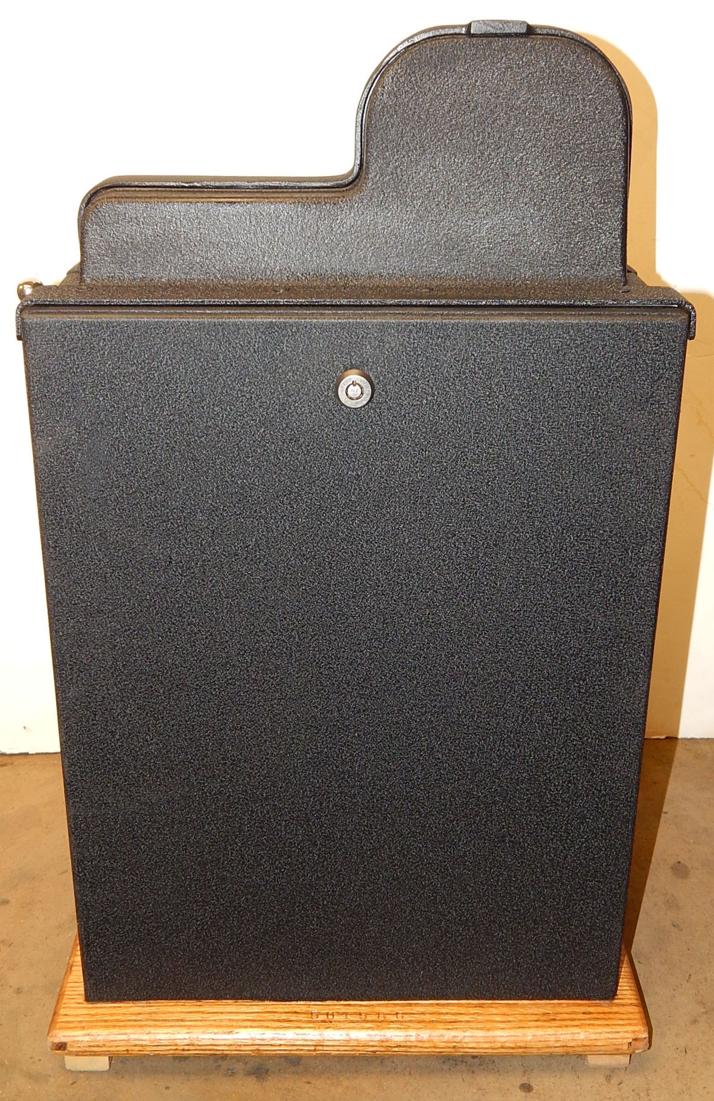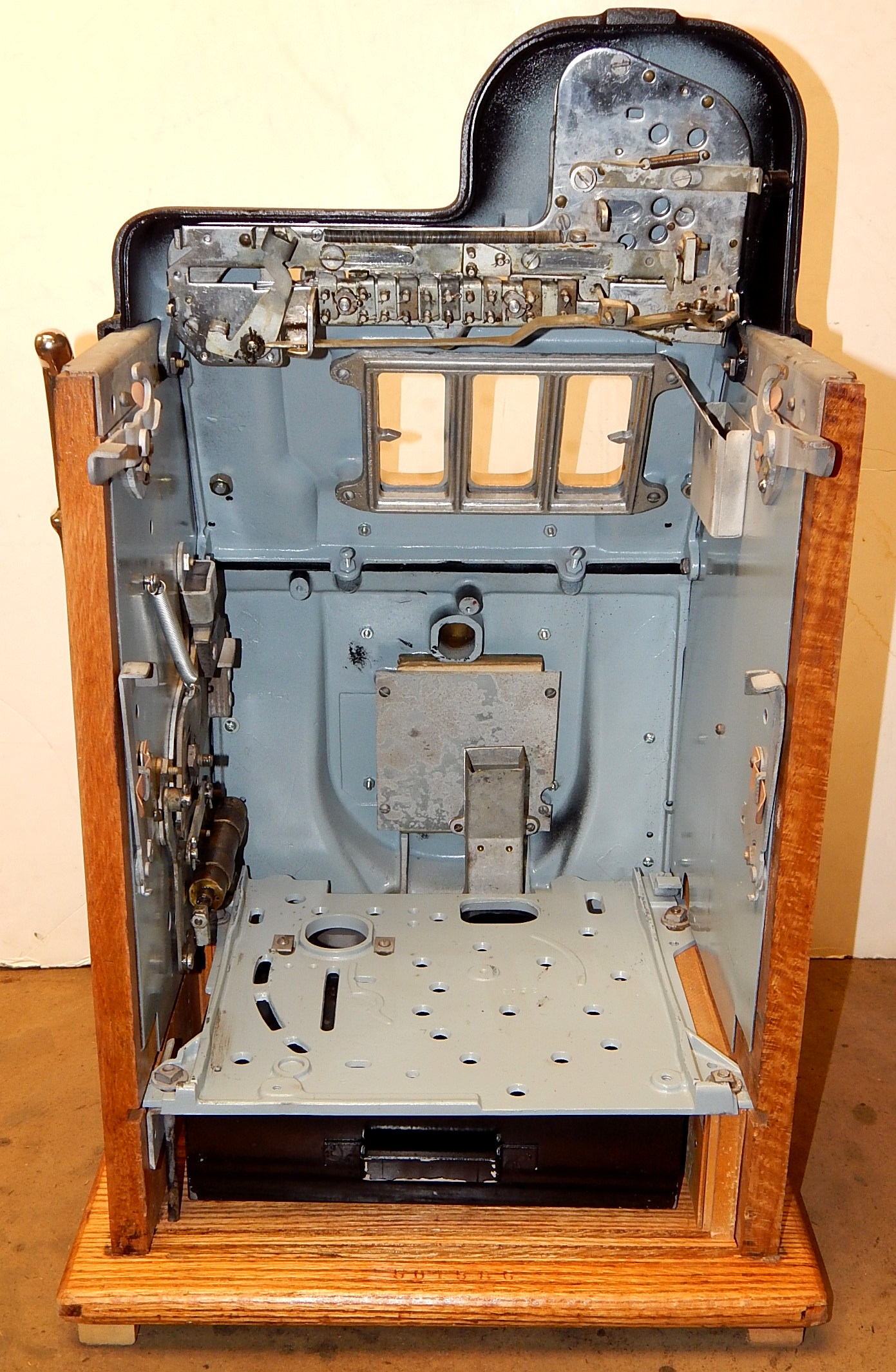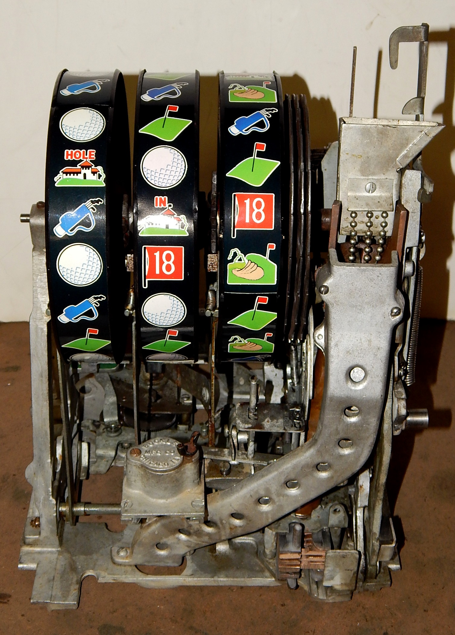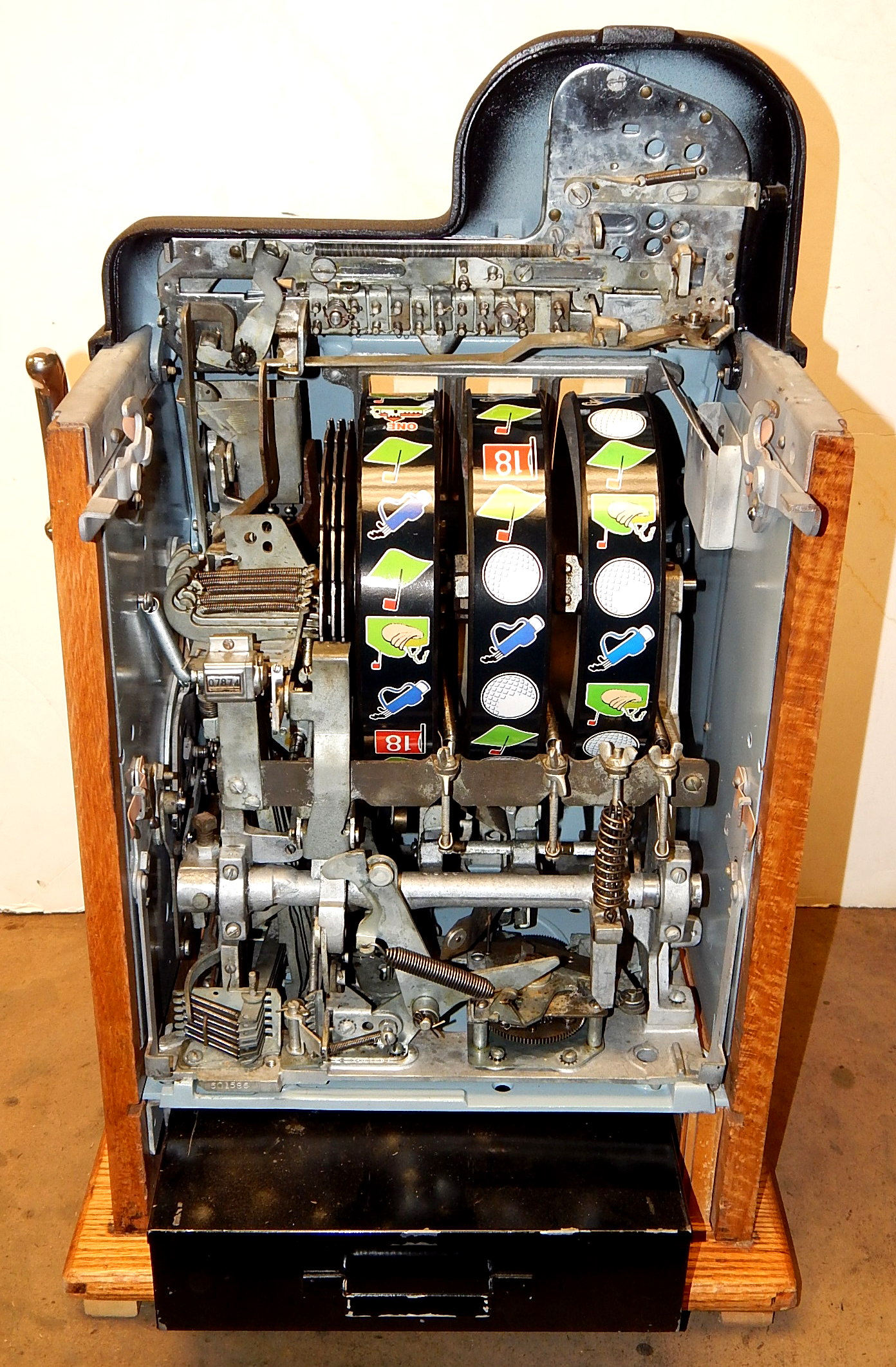 1949 Buckley "Golfer" 25 cent, restored, painted wrinkle black, trimmed in gold with oak cabinet This is a very nice original machine with a golfer kit added. New award card, new reel strips, original back door, original cash box. The jackpot on this machine is a token vendor and comes with five original $50 tokens. Plays very easy. A great rec-room machine.