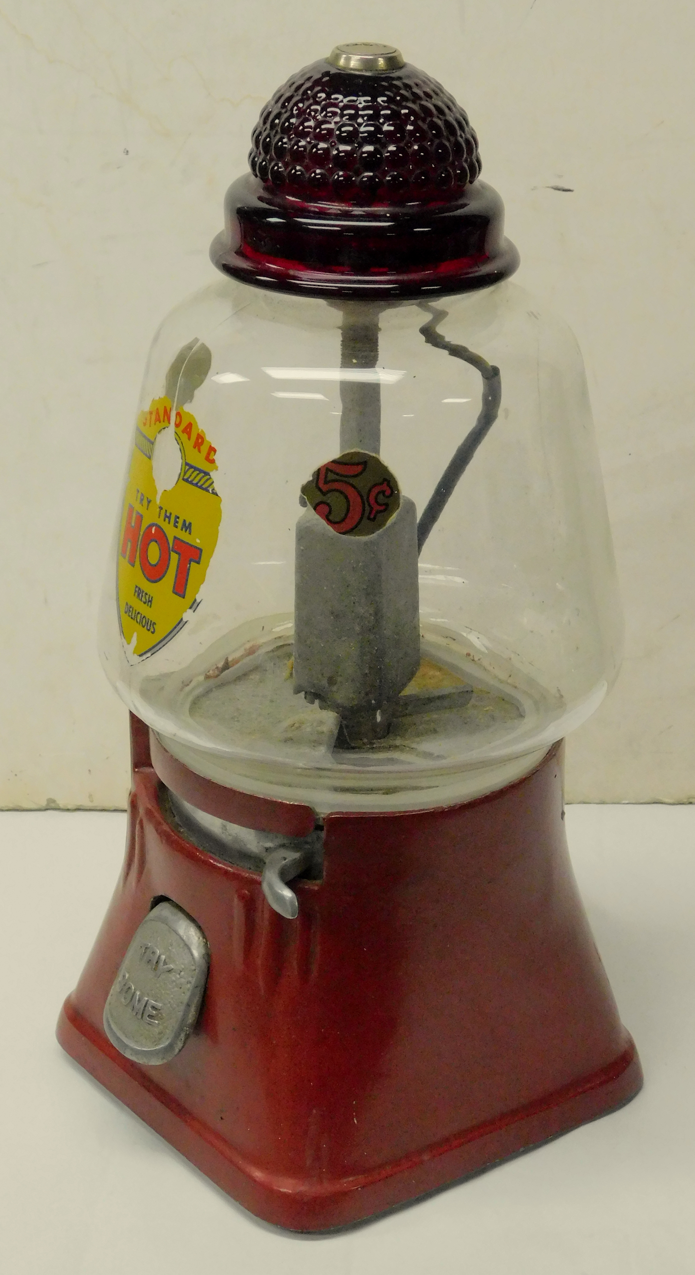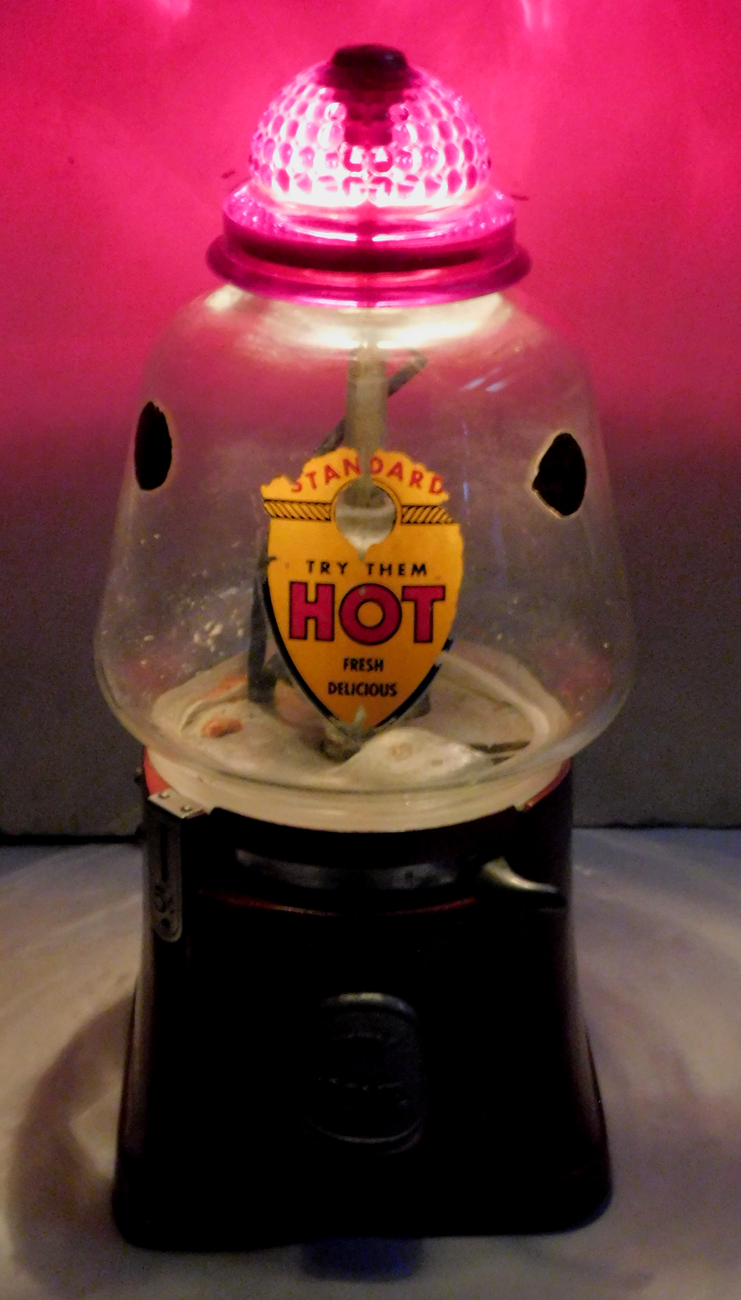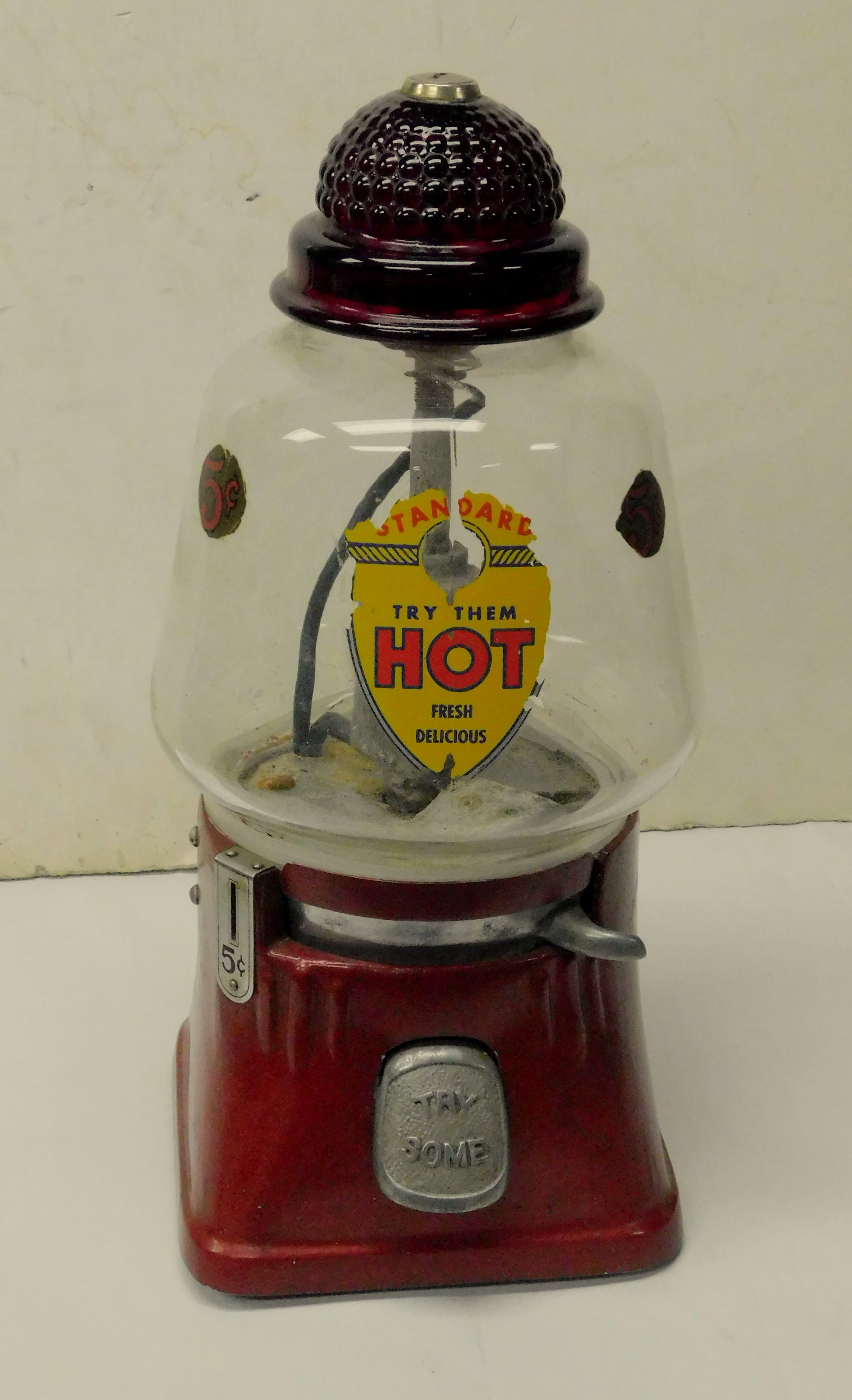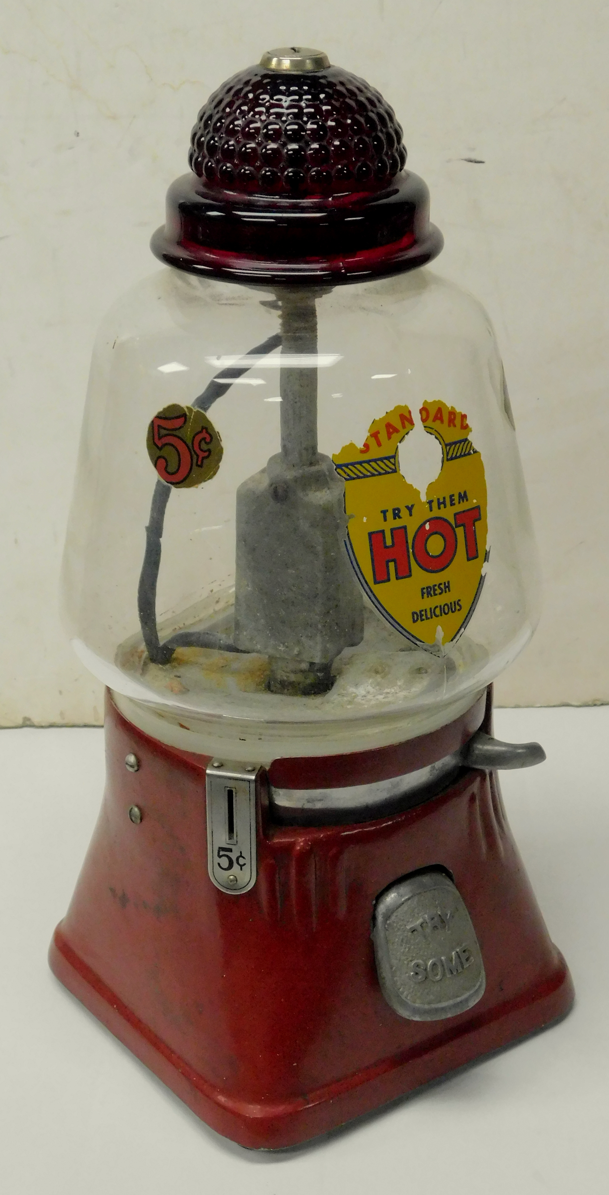 1947 Silver King Hot Nuts vendor nickel, With original Patina. Has a Ruby hobnail glass top lights atop this machine. Red in color with "Try Some", works fine, come with lock and key. 15" Tall If your looking for an original Hot Nut machine in original condition with original patina here you are.