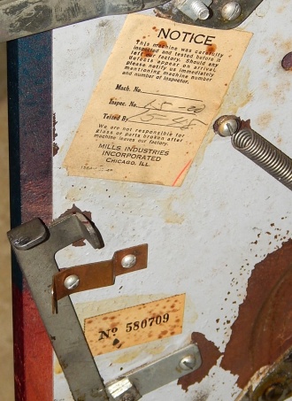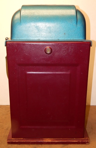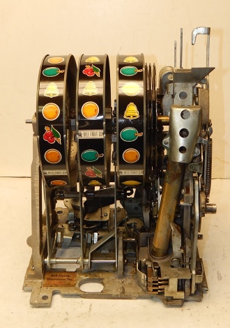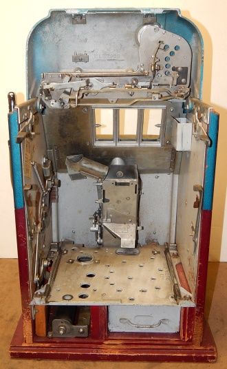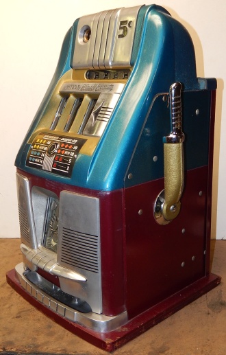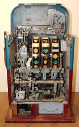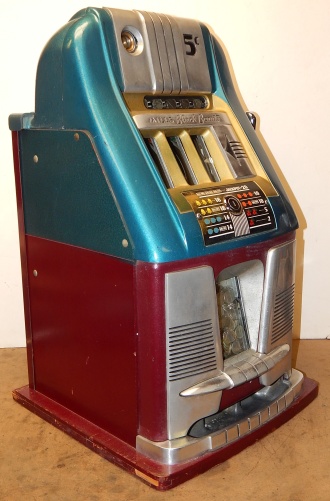 Mills Black Beauty, 5 cent. In original condition, original reel strips, front load Jackpot, original back door, money box door, original cash box, all locks are Mills locks with one key. Front loader lock and cash box door lock are keyed alike. If you are looking for a nice original machine untouched here you are. This machine has been cleaned, lube and adjusted . Ready for many years of trouble free play.