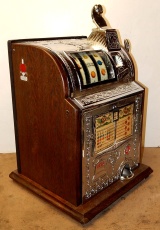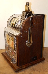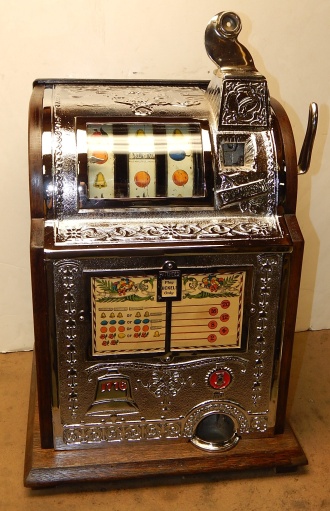 Mills Operator Bell 5 cent1918. Here is an old one, The castings on this machine are cast iron, the nickel is close to mint condition. This machine needs nothing, has the original back door and lock, Tin reel strips on this machine are a 9 out of a 10 in condition. For a goose neck machine it plays very easy. 2-4 pay out.