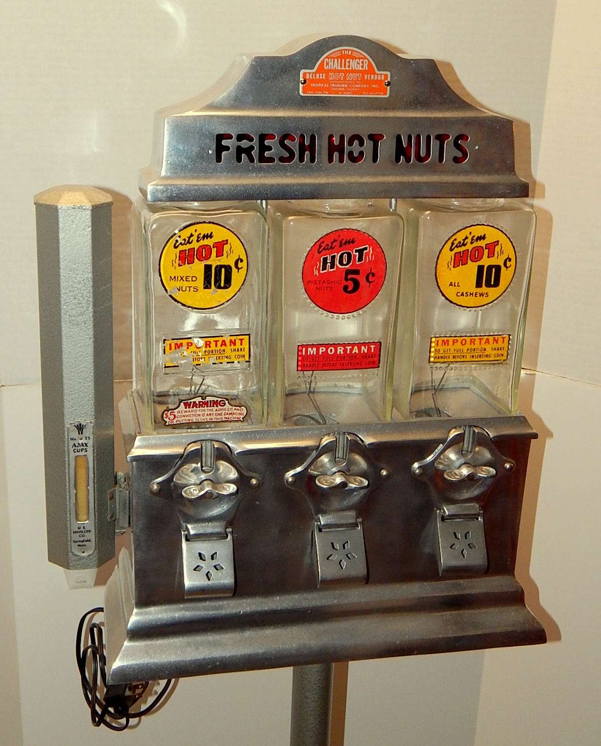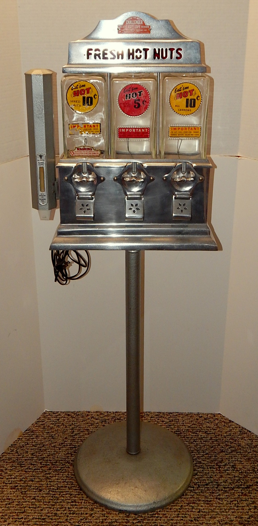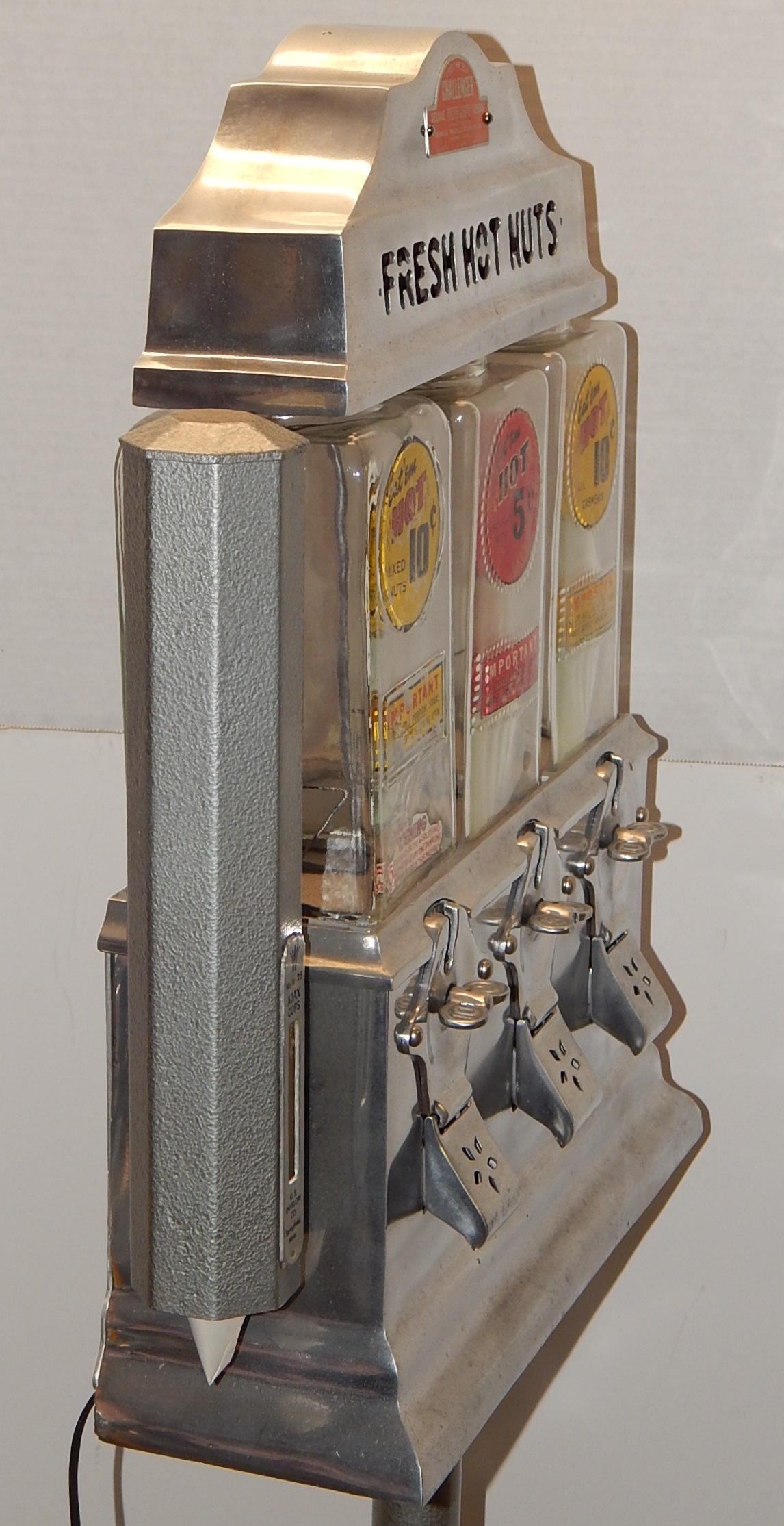 1947 The Challenger Deluxe Hot Nut Vendor, with 27" stand. Three separate coin entries on this machine were designed to be reveriable. 10c on one side and 5c on the other side. It is made of brused Aluimnum and has blinking light inside its top. Has cup holder on the side.