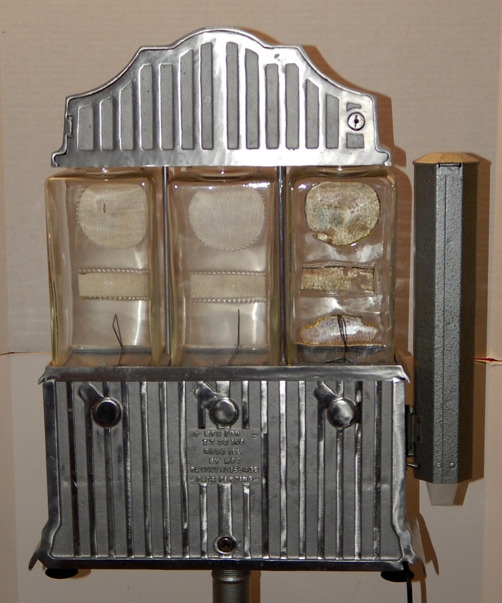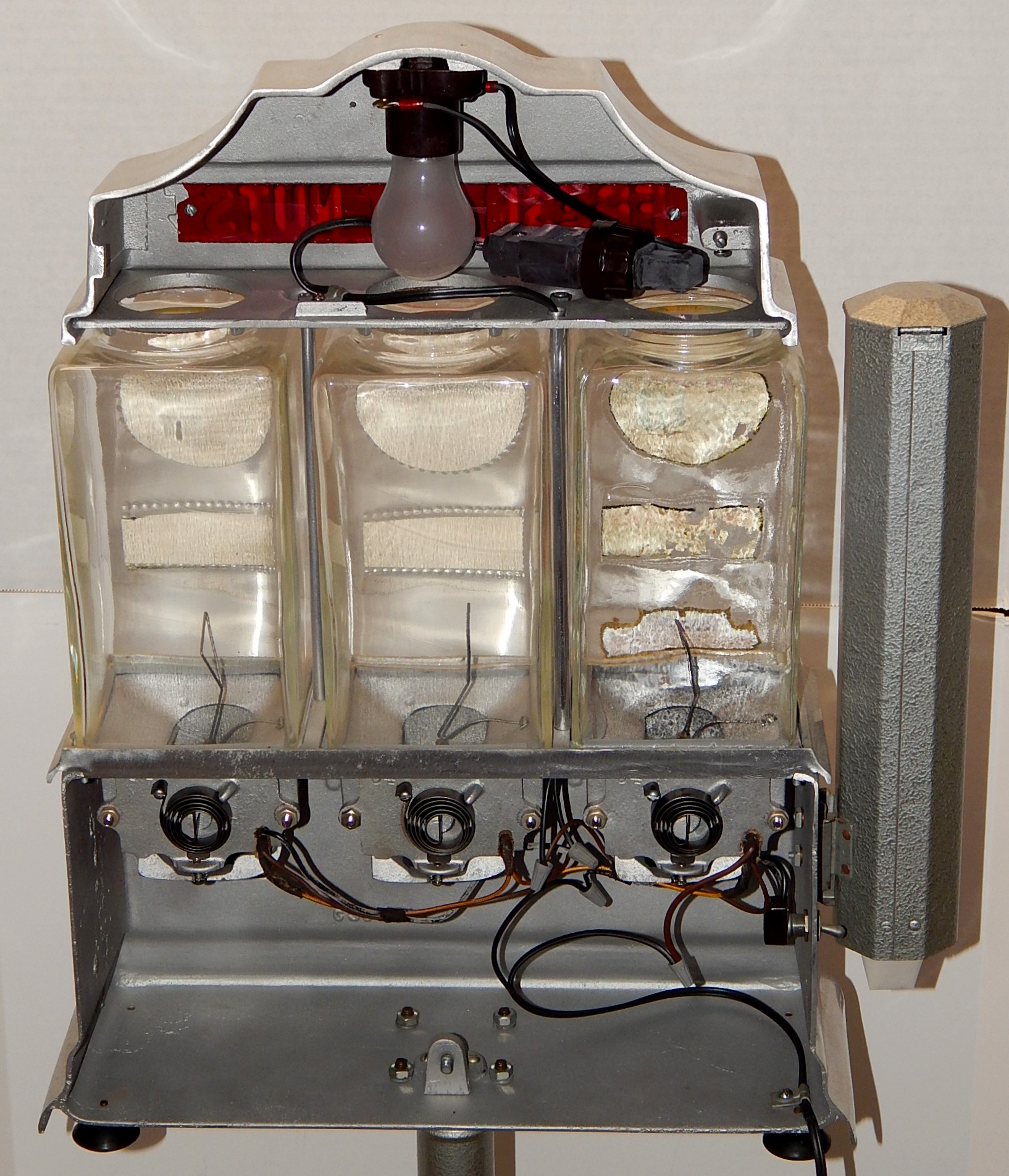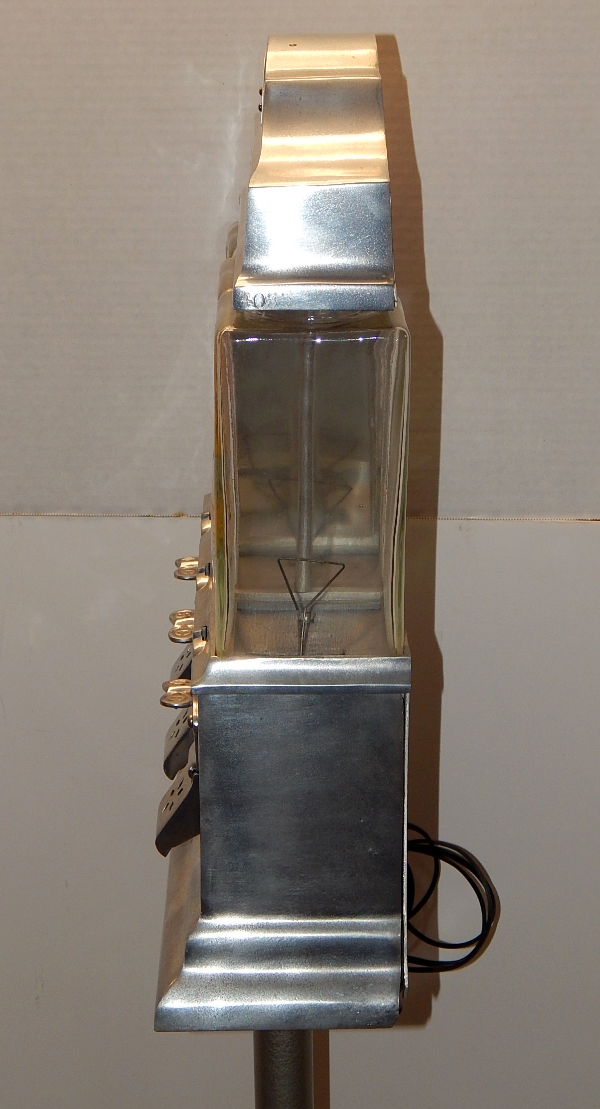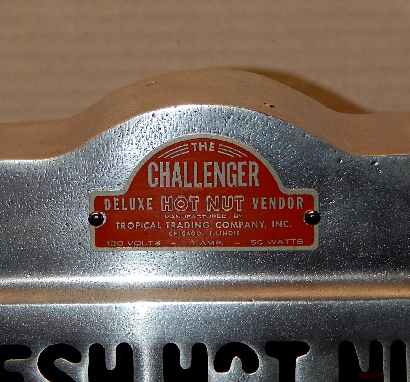 1947 The Challenger Deluxe Hot Nut Vendor, with 27" stand. Three separate coin entries on this machine were designed to be reveriable. 10c on one side and 5c on the other side. It is made of brused Aluimnum and has blinking light inside its top. Has cup holder on the side.