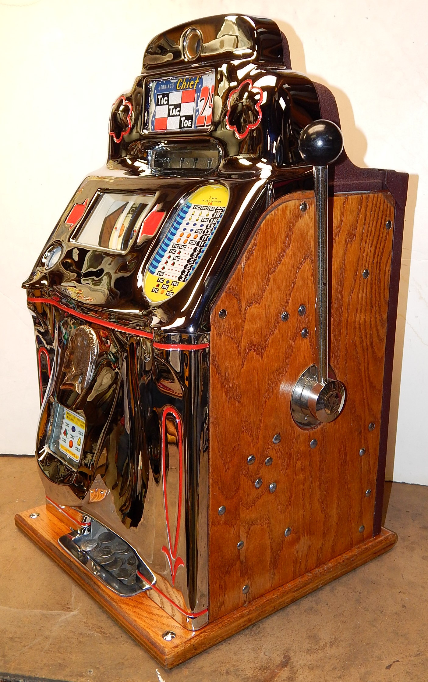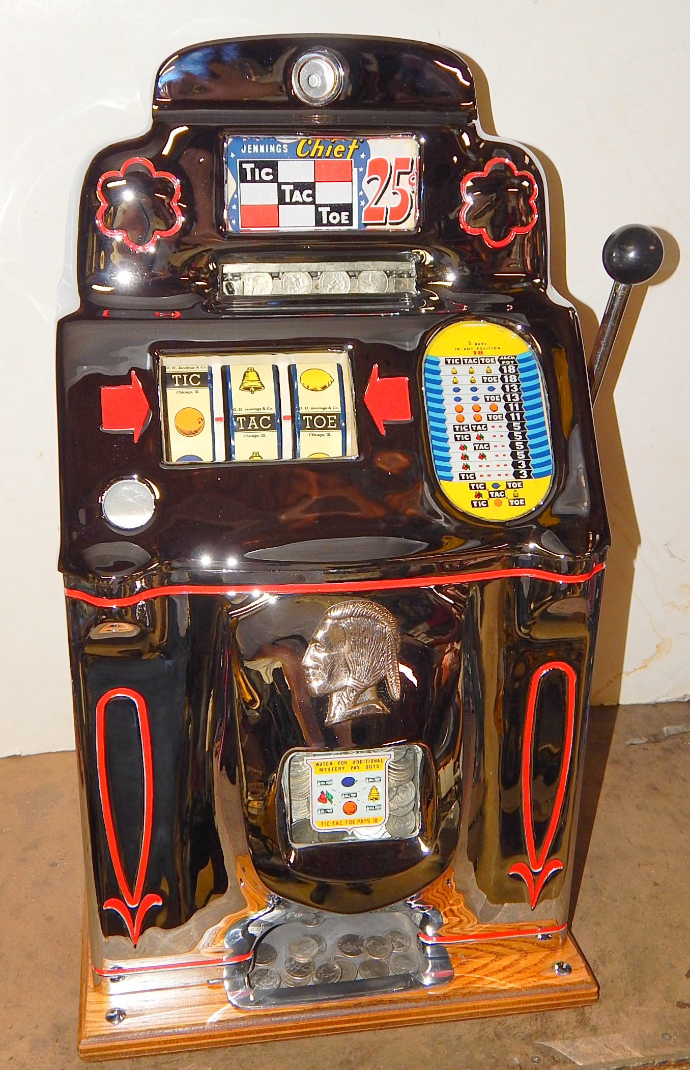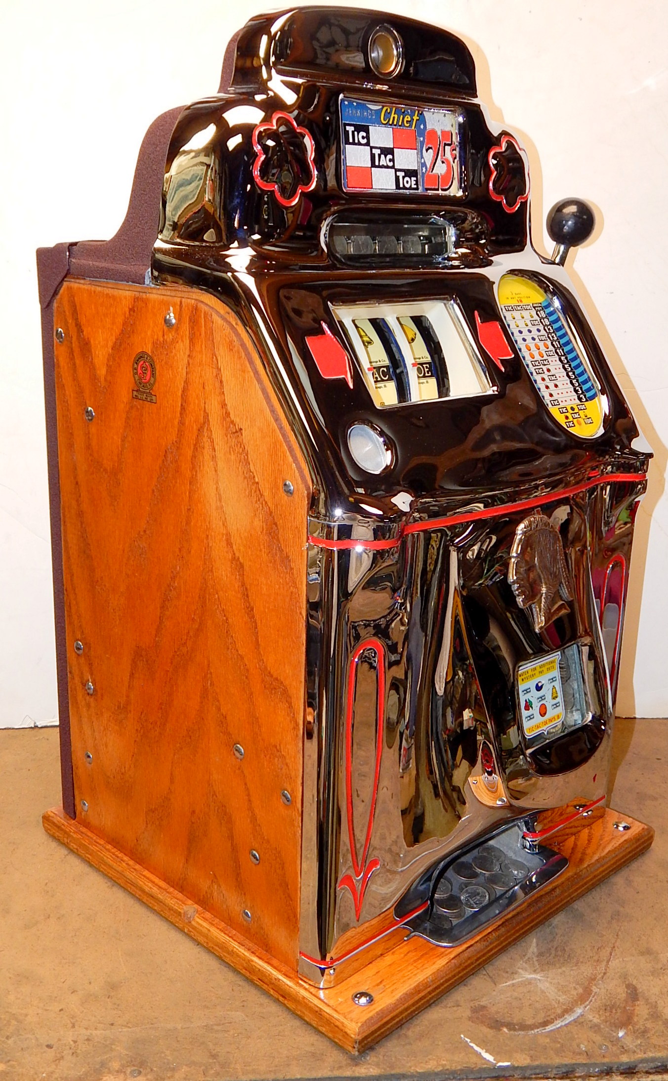 1947 Jennings "Chrome" Standard Chief 25 cent "Tic Tac Toe", a very nice machine. The chrome plating on this machine is a 9 out of 10, just beautiful. Oak cabinet has been changed out at some point but the replacement looks very nice as you can see. Original cash box, back door with original ODJ Jennings lock. original award card and marquee. Plays easy