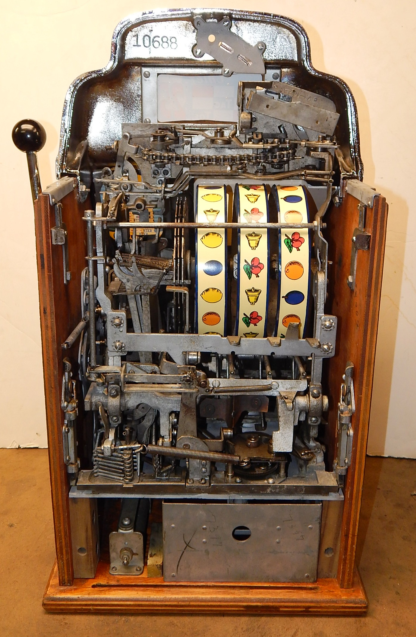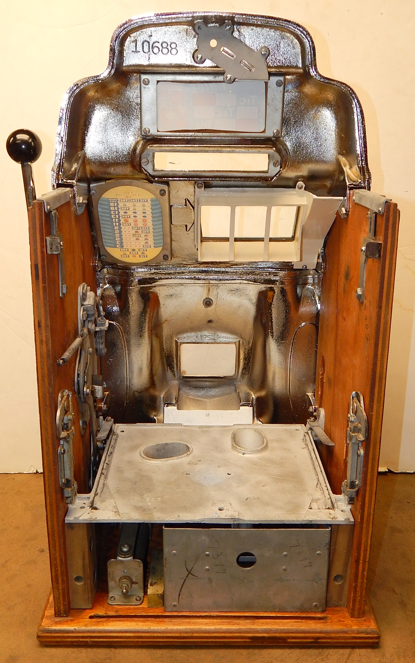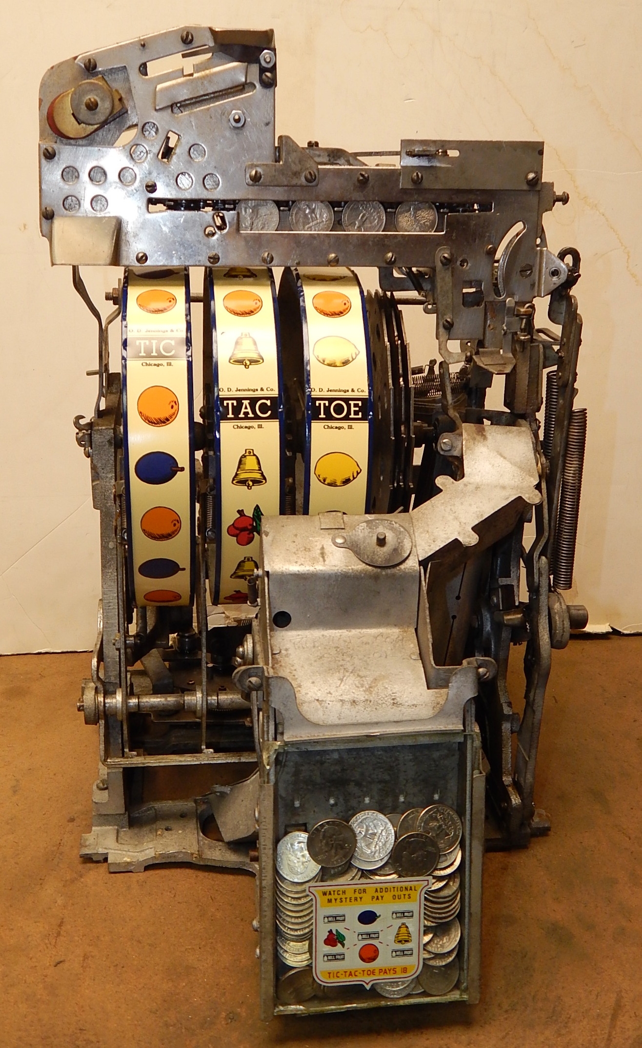 1947 Jennings "Chrome" Standard Chief 25 cent "Tic Tac Toe", a very nice machine. The chrome plating on this machine is a 9 out of 10, just beautiful. Oak cabinet has been changed out at some point but the replacement looks very nice as you can see. Original cash box, back door with original ODJ Jennings lock. original award card and marquee. Plays easy