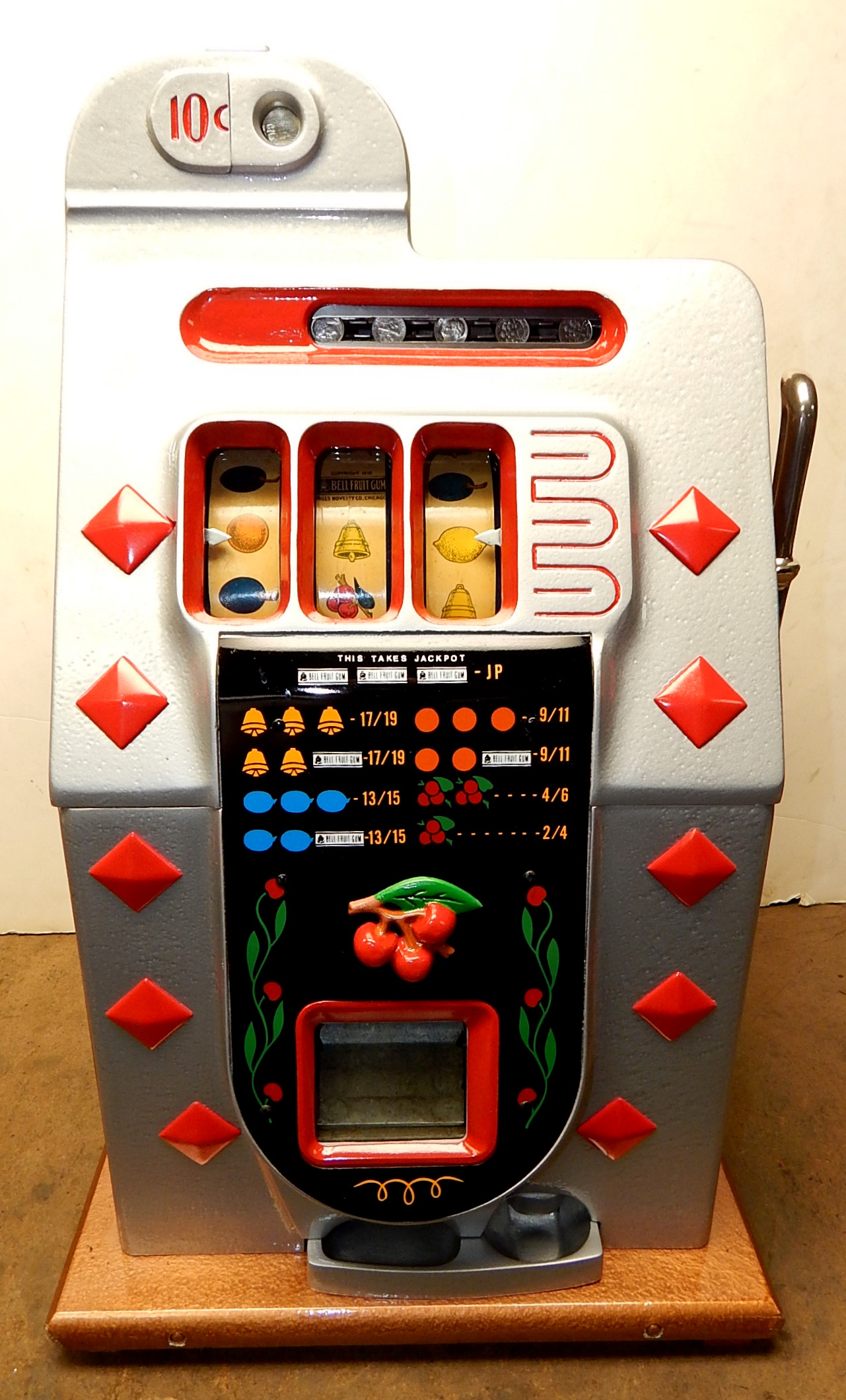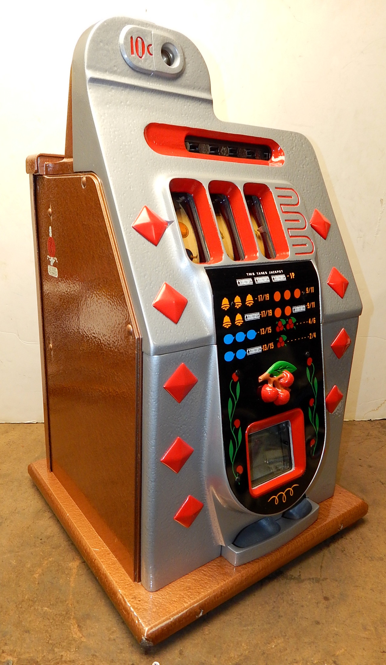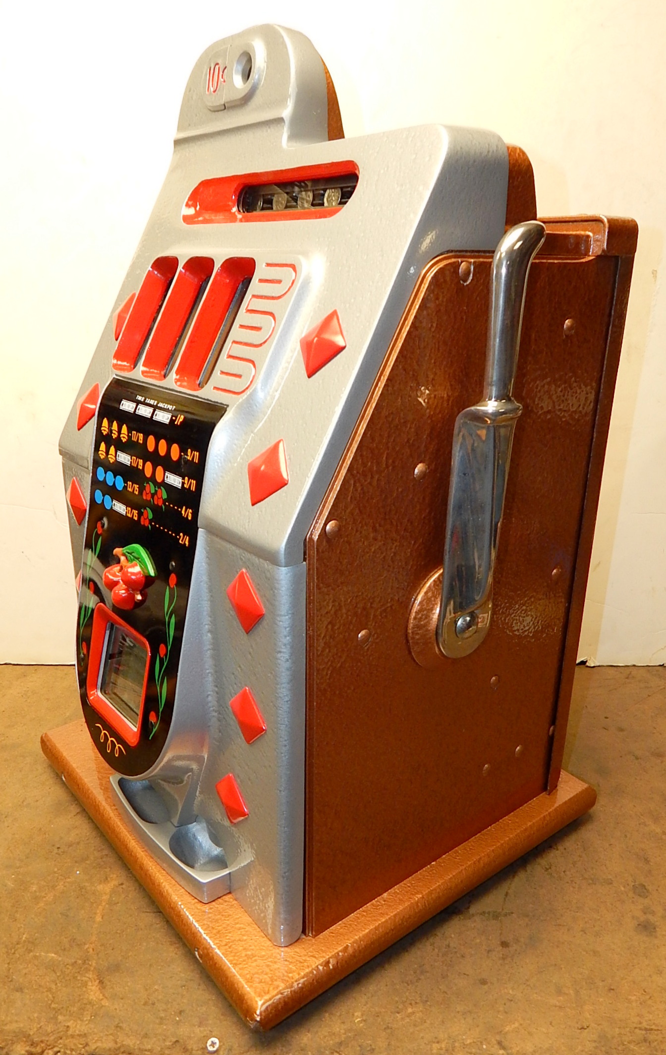 1940 Mills Diamond Front, 10 cent. This is a very nice cast iron machine restored. Powder Coated Silver metal flake, trimmed in red. New original award card, original back door with lock, original cash box, original reel strips. Plays and pay as it should, 2-5 payout.