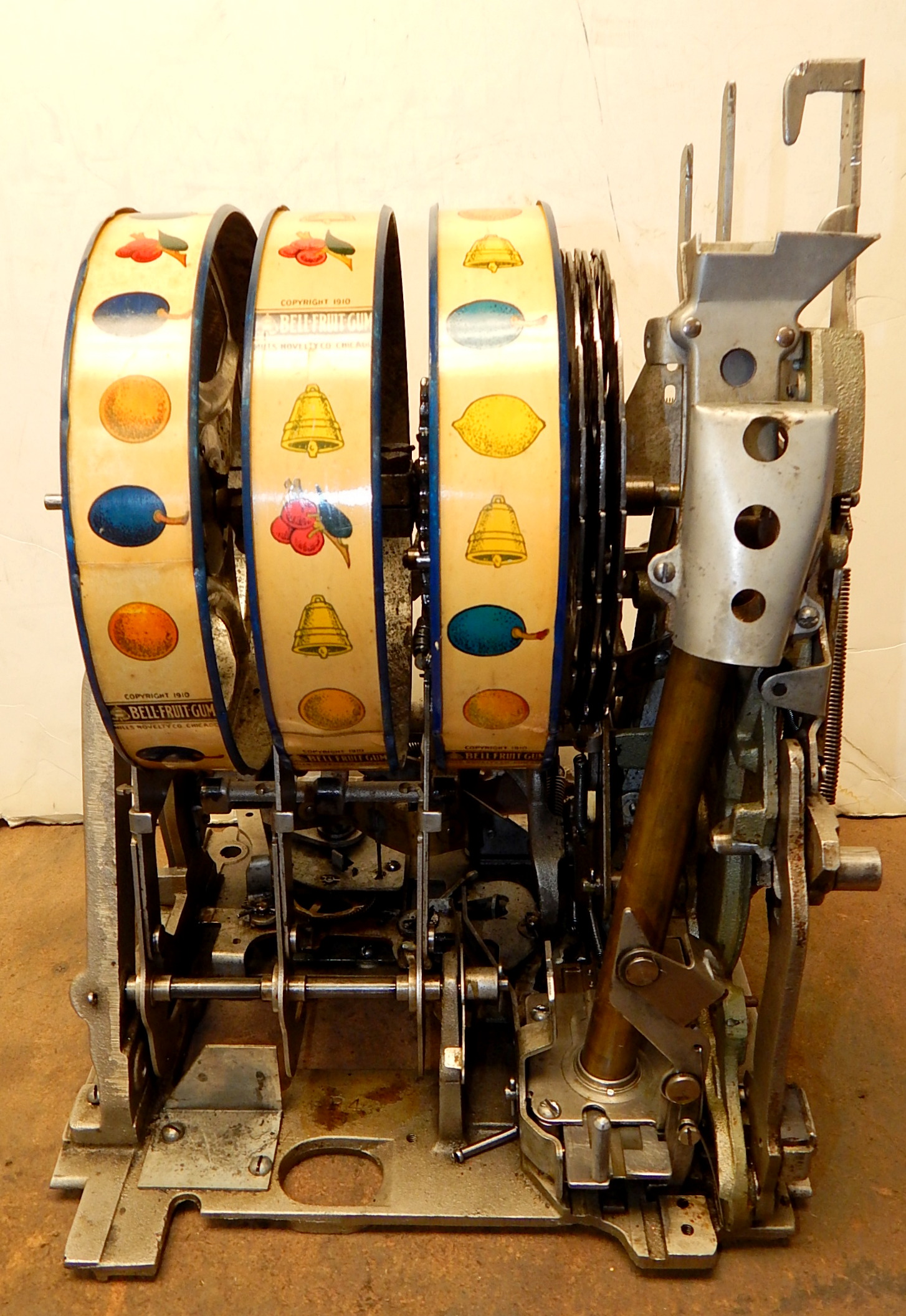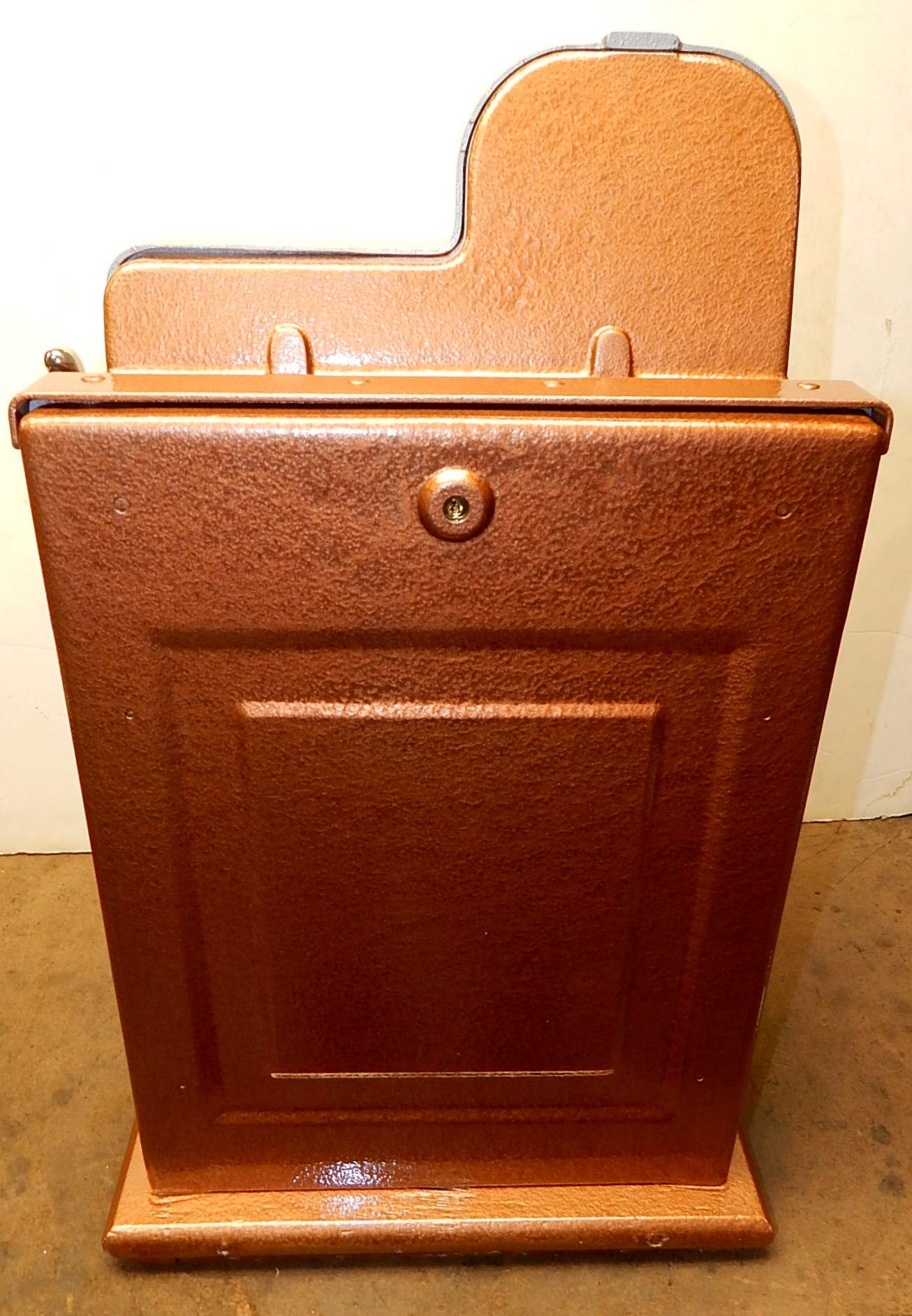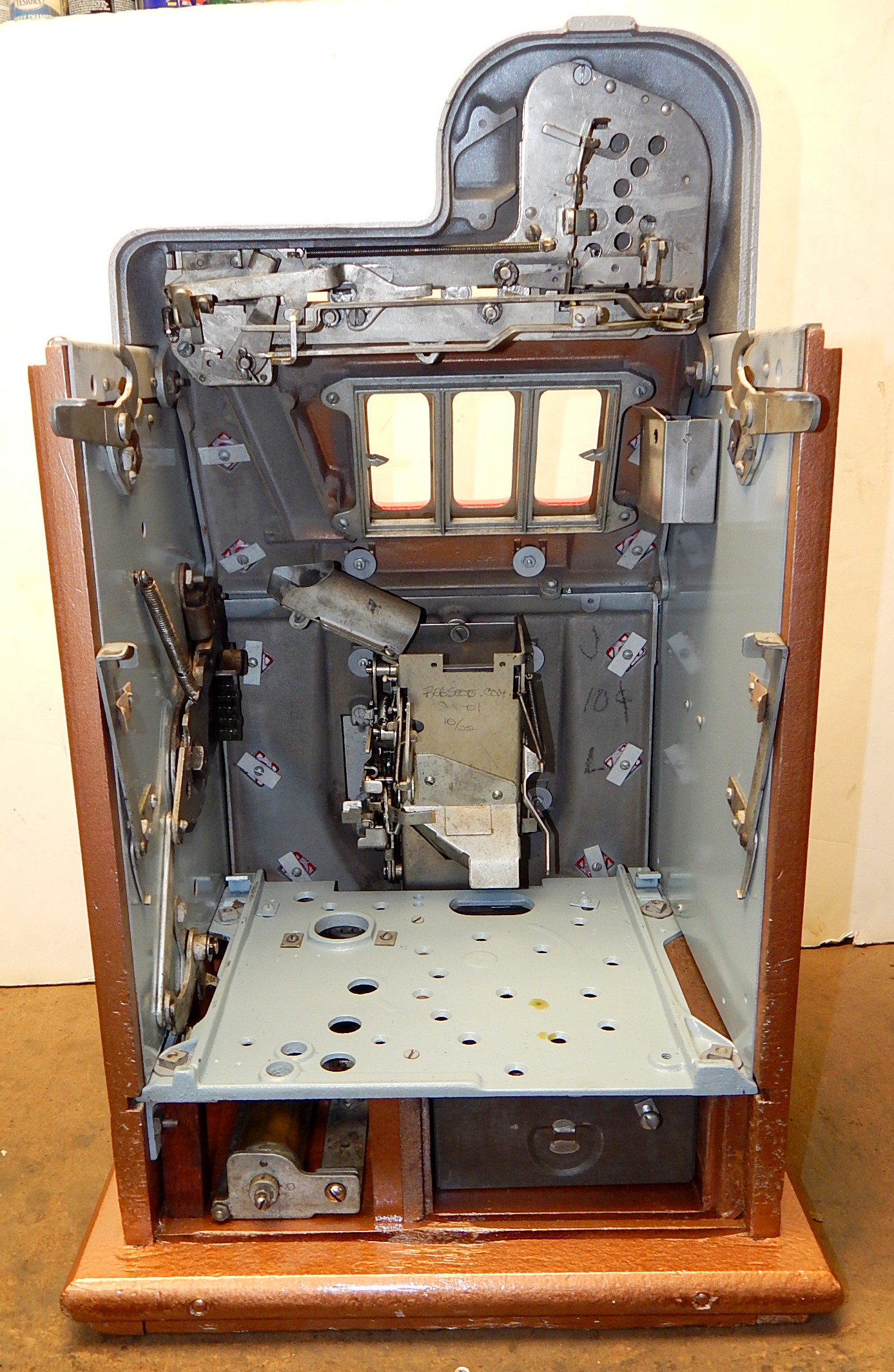 1940 Mills Diamond Front, 10 cent. This is a very nice cast iron machine restored. Powder Coated Silver metal flake, trimmed in red. New original award card, original back door with lock, original cash box, original reel strips. Plays and pay as it should, 2-5 payout.