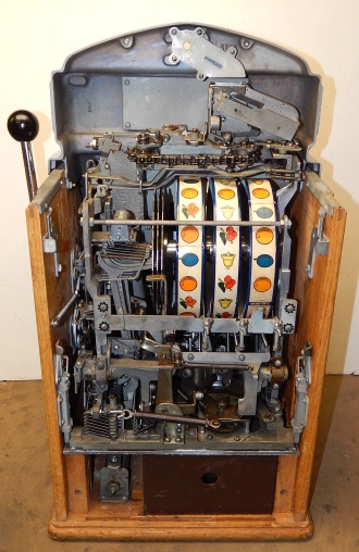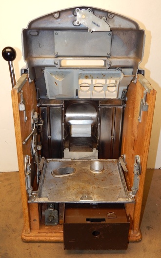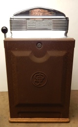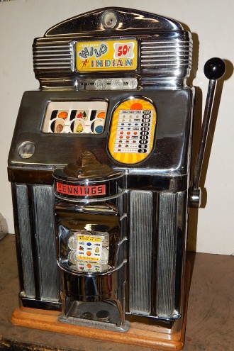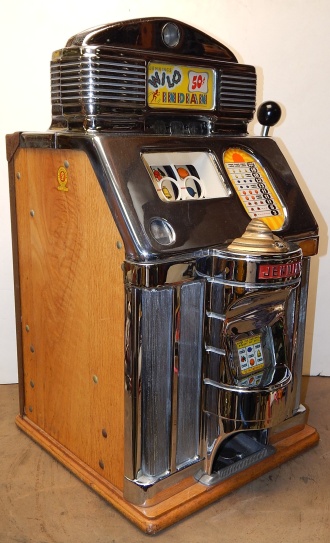 1949 Jennings Club Chief "Wild Indian" 50 cent, Another large coin machine, all original condition, not restored. Serial numbers match. Has full functional front loading Jack-Pot. Original condition Reel strips. Original Award card and Marquee, original back door, original Cash box. Chrome on this machine is a 9 out of a 10, not bad for 68 years old. If you are looking for untouched original then here it is. Plays very nice.