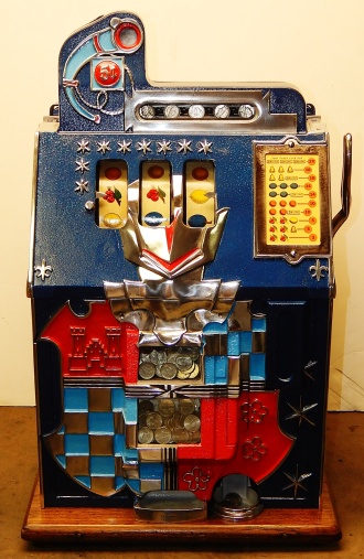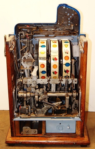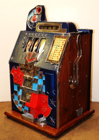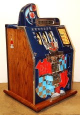1934 Mills Castle Front 5 cent, in restored condition with working Jackpot and reserve, original Reel Strip in mint condition, original back door, original lock with one key, original cash box. 3-5 play out. Plays very easy.