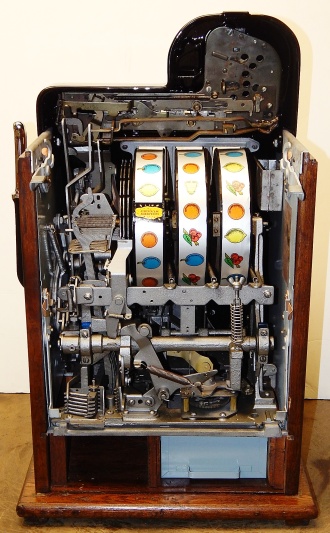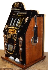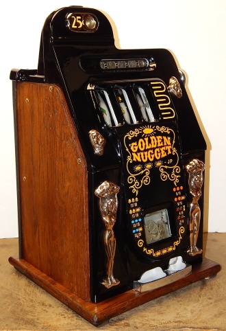 Mills 1947 Black Cherry "Golden Nugget" 25 cent. High Gloss Black, trim in yellow. Complete Jackpot with reserve, original back door, oak cabinet. Reel strips, award card, cashbox are replacements. Plays very easy, pays as it should. This machine was never used in the Golden Nugget casino in Las Vegas. There were only a hundred or so Golden Nugget machines made for the casino back in the 50s. I don't want any one to think this is a original machine from that casino. The Golden Nugget kit was added to an original 1947 Black Cherry which only consist of two dolls, two nuggets, reel strips, award card. The machine it self is all original Mills black Cherry. This is the same way they made them for the casino back in the 50s.