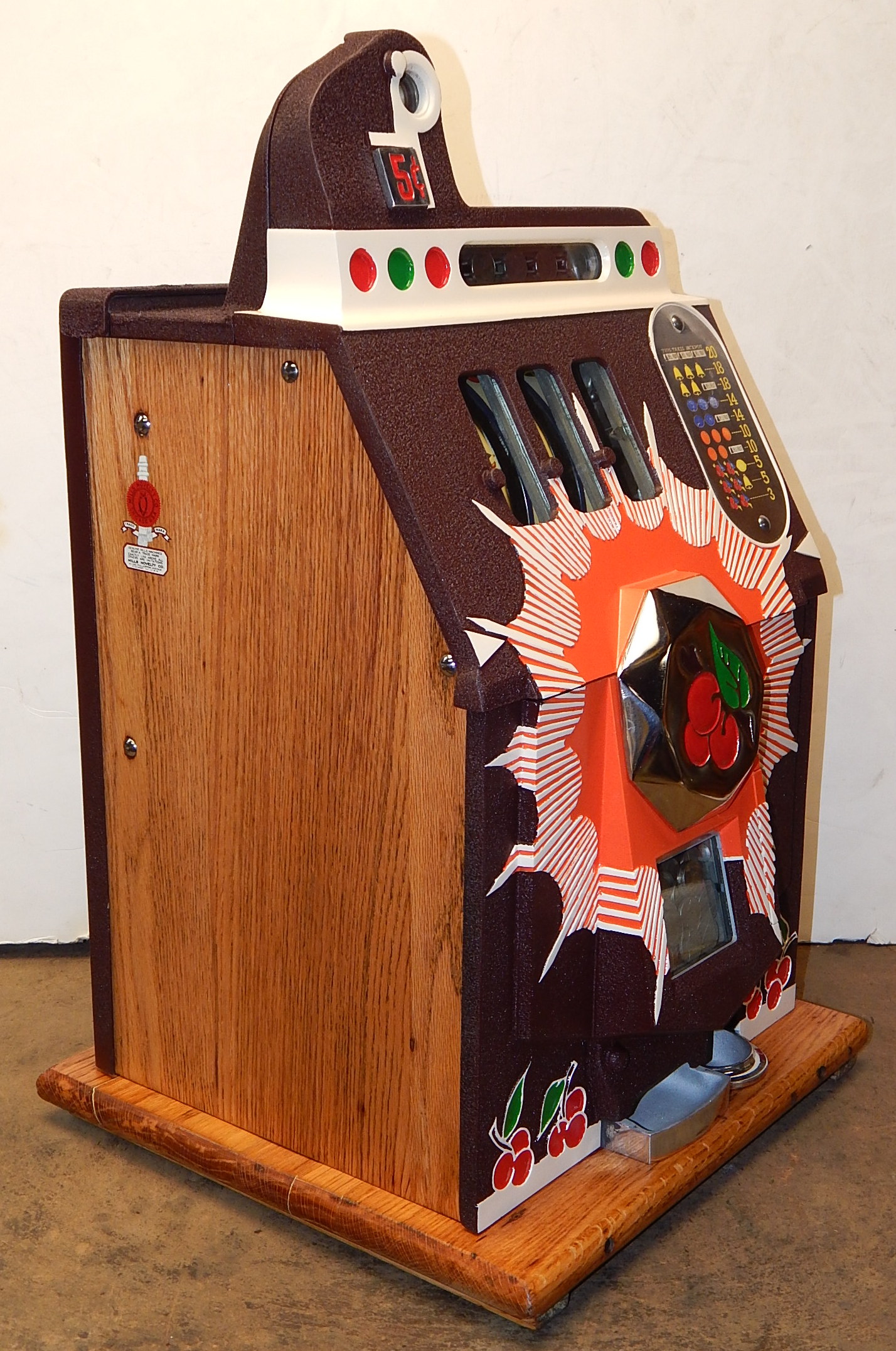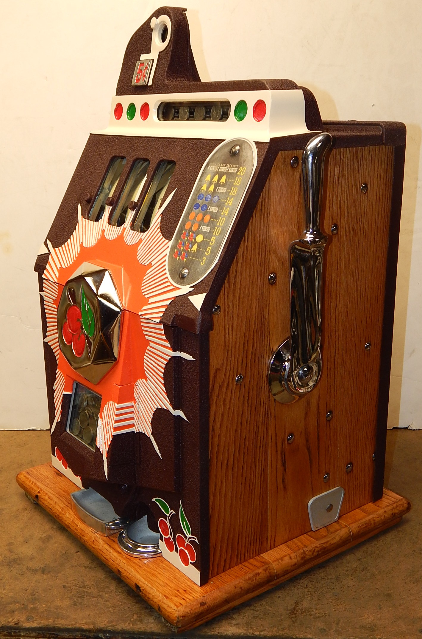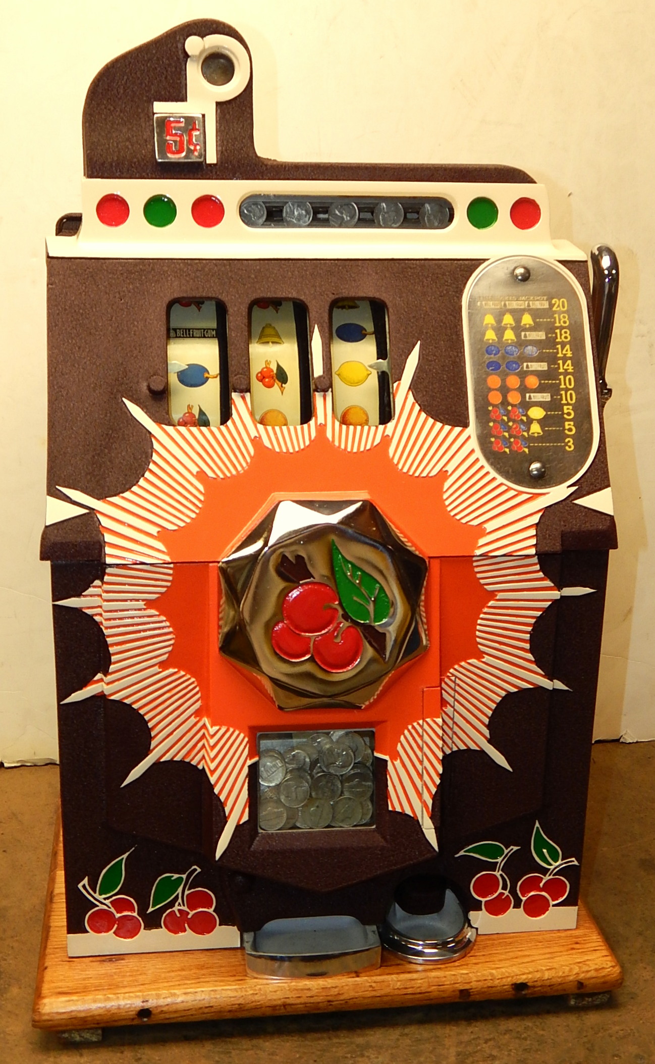 1935 Mills Bursting Cherry 5 cent . This is a very nice cast iron machine restored back to it original colors, Wrinkle brown and Orange, with white, red and green trim colors. Original condition award card, Jack pot with reserve, original back door and original Mills lock with one key, original cash box. Plays very easy, pays as it should.