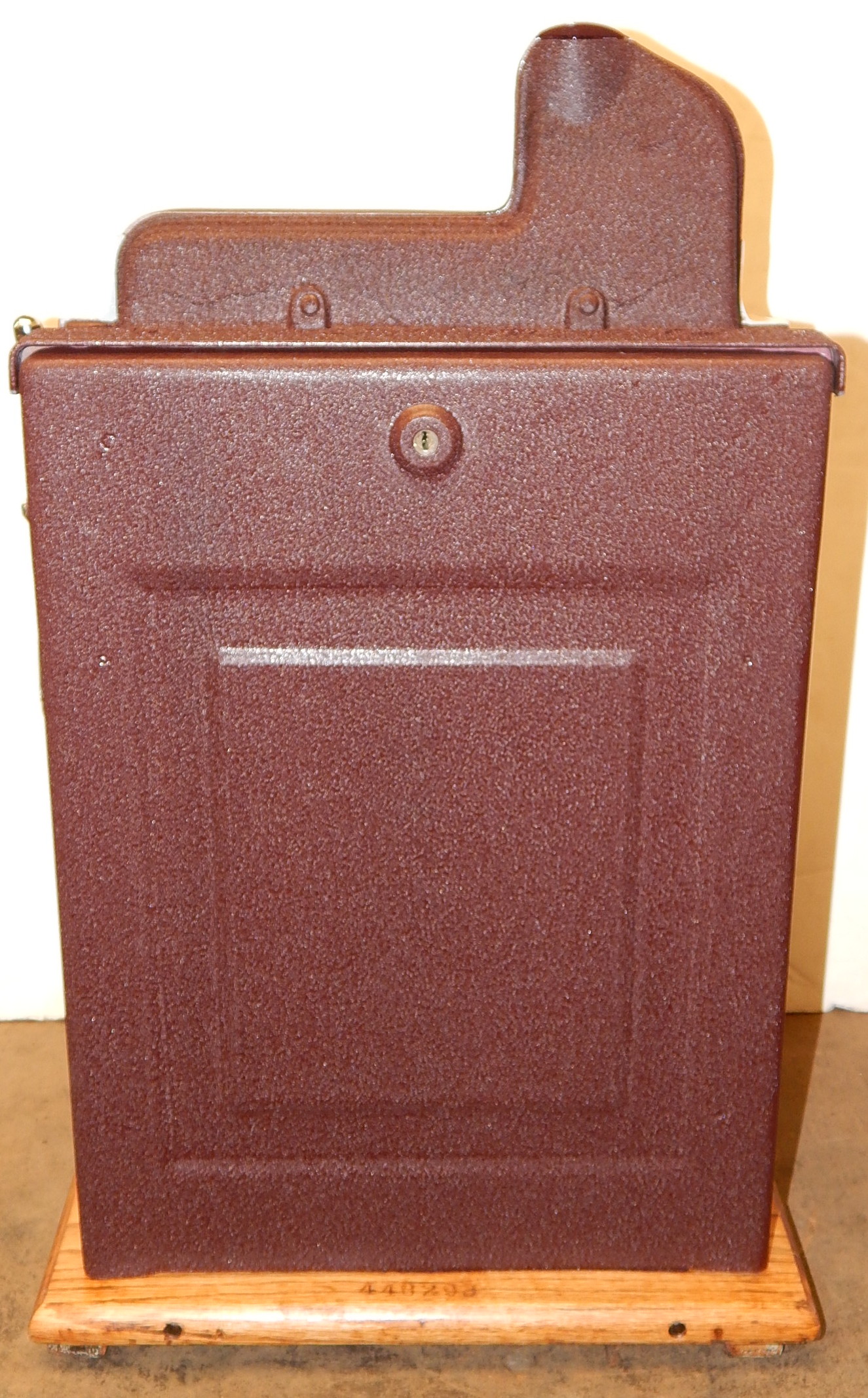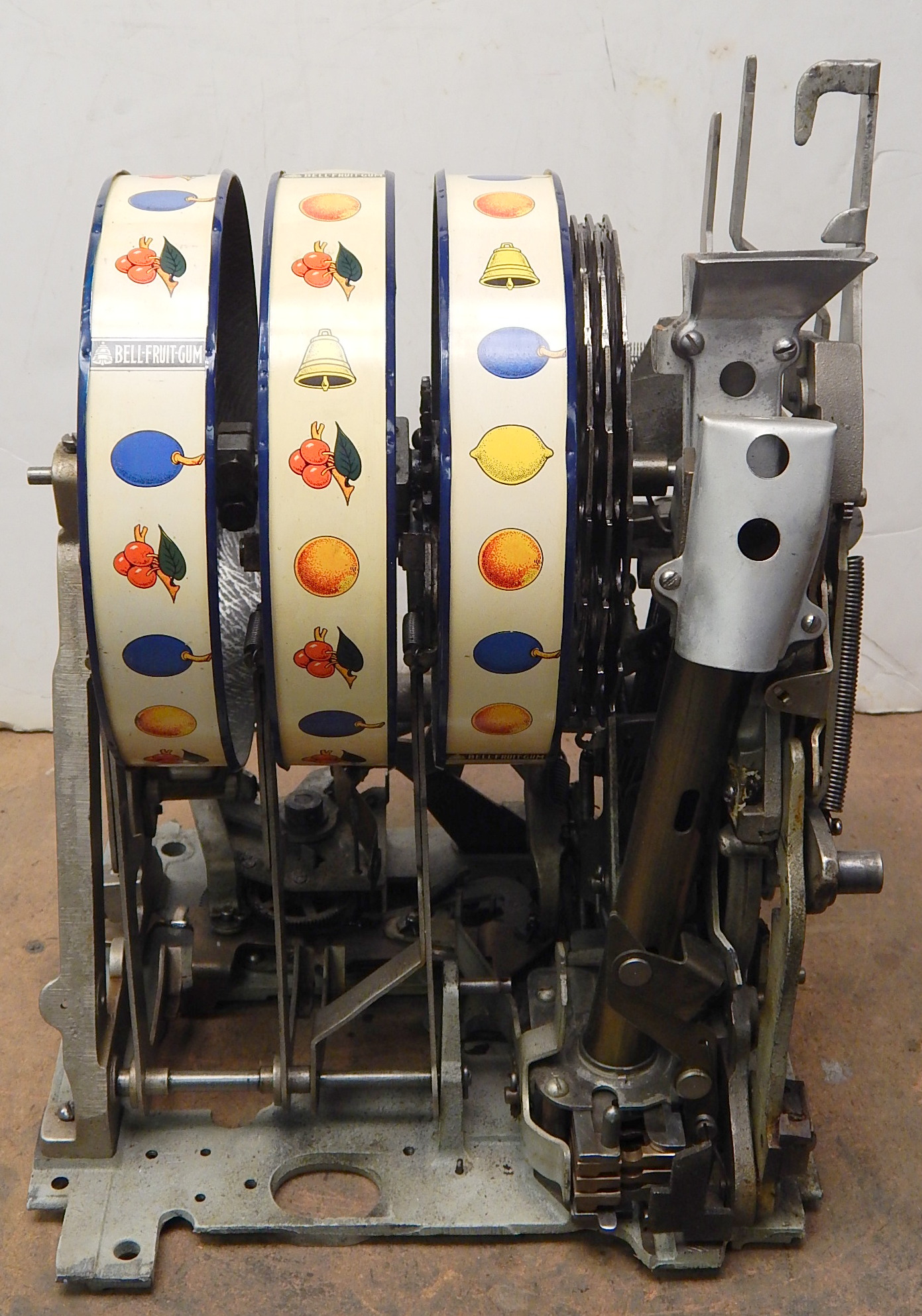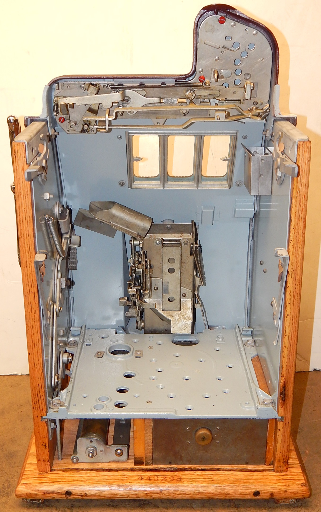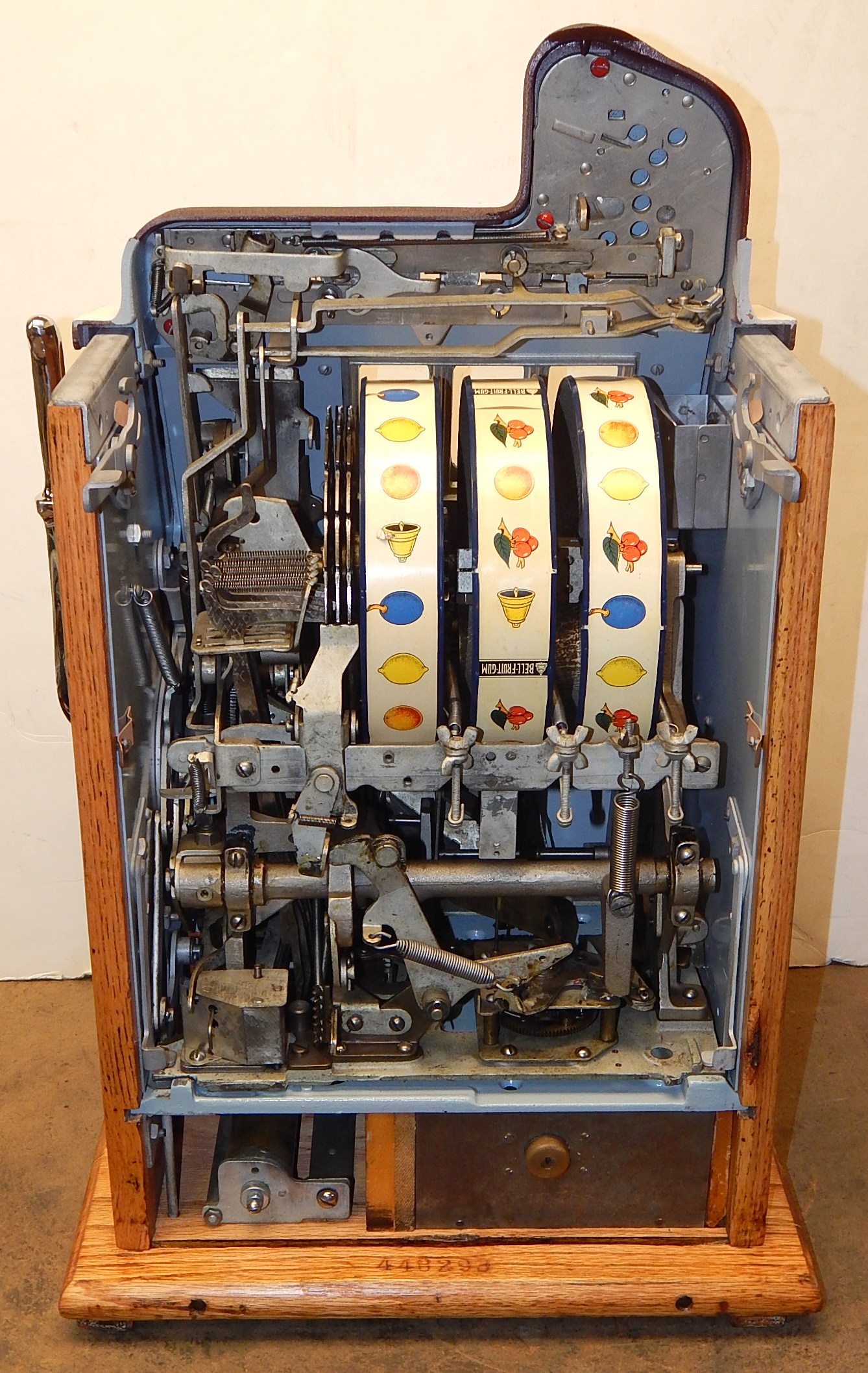 1935 Mills Bursting Cherry 5 cent . This is a very nice cast iron machine restored back to it original colors, Wrinkle brown and Orange, with white, red and green trim colors. Original condition award card, Jack pot with reserve, original back door and original Mills lock with one key, original cash box. Plays very easy, pays as it should.