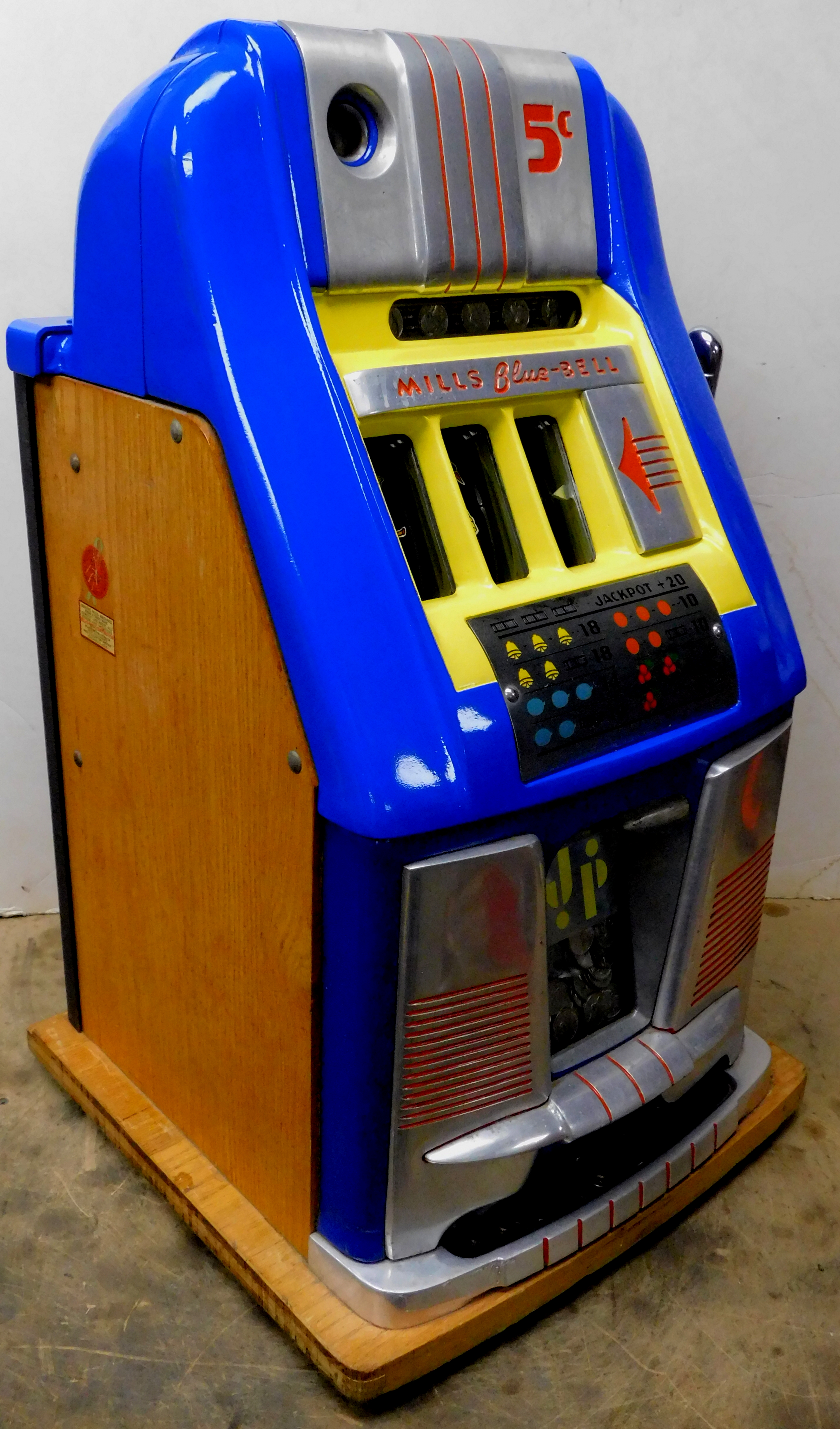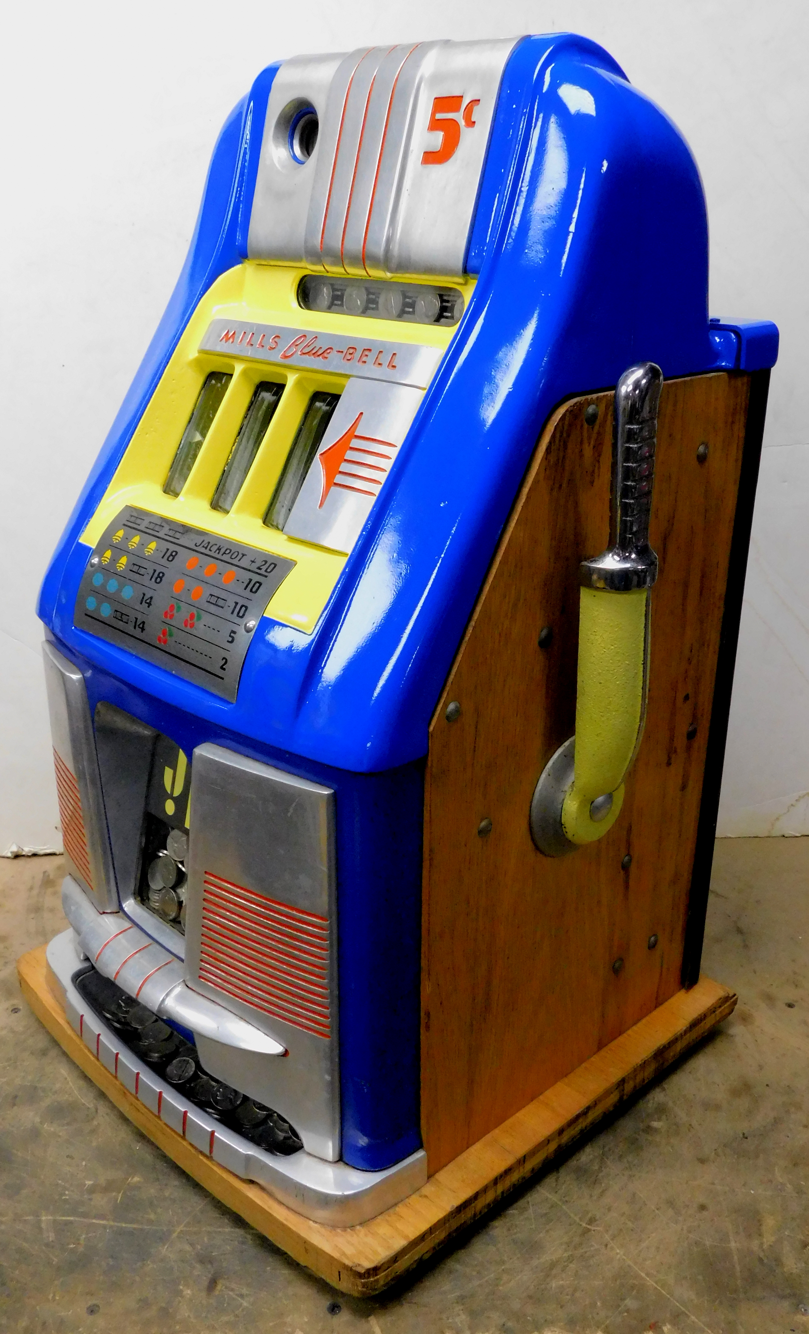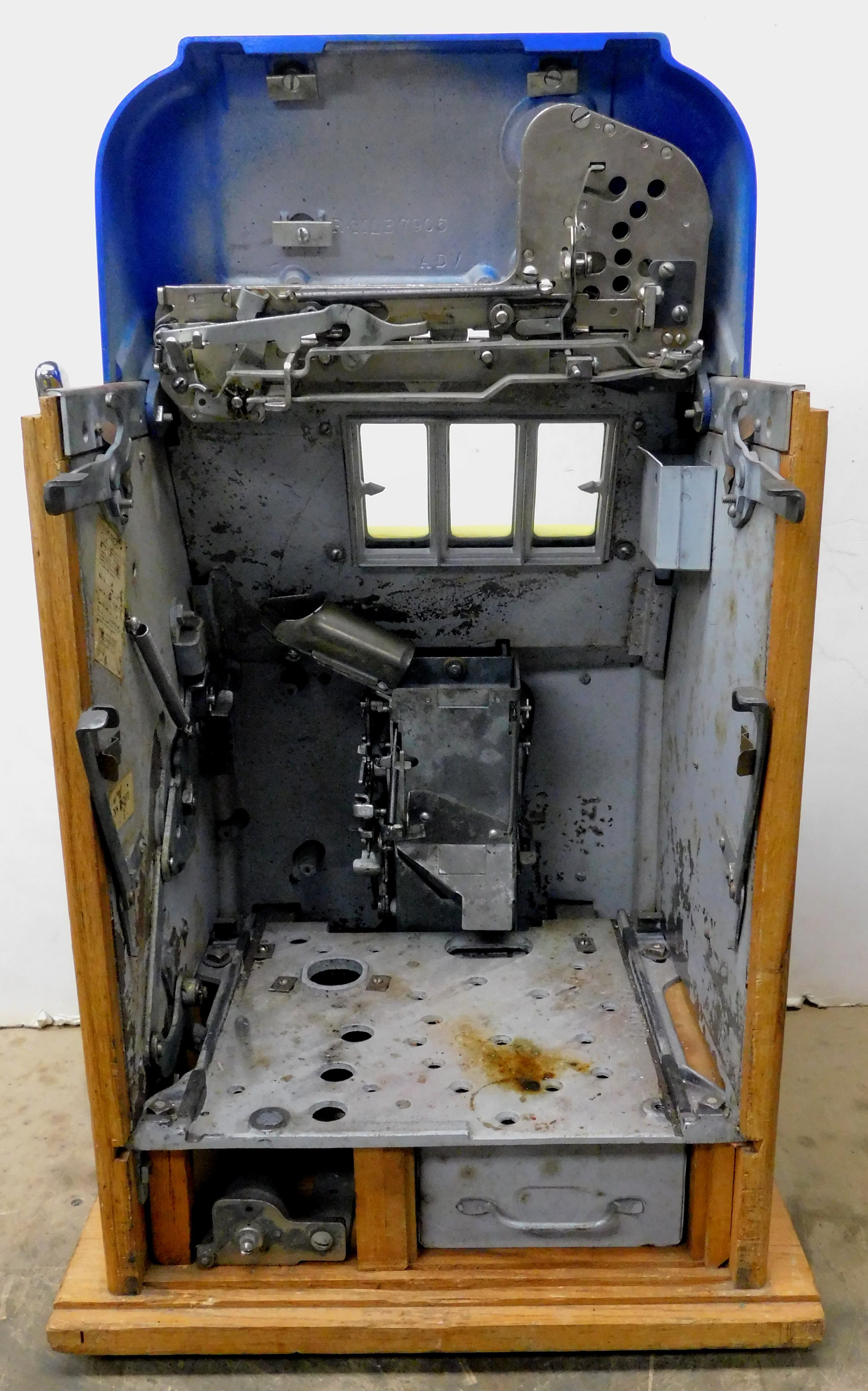 Mills 1948 Blue Bell Hi-Top 5 cent, "Not restore". Other than the top casting repainted blue it's all original condition. Original award card, original reel strips, Jackpot with reserve, original back door with Mills lock with one key, original cash box. Still has the original paper inspection tag and serial number on the inside of the cabinet. Plays very easy, 2-5 pay out.