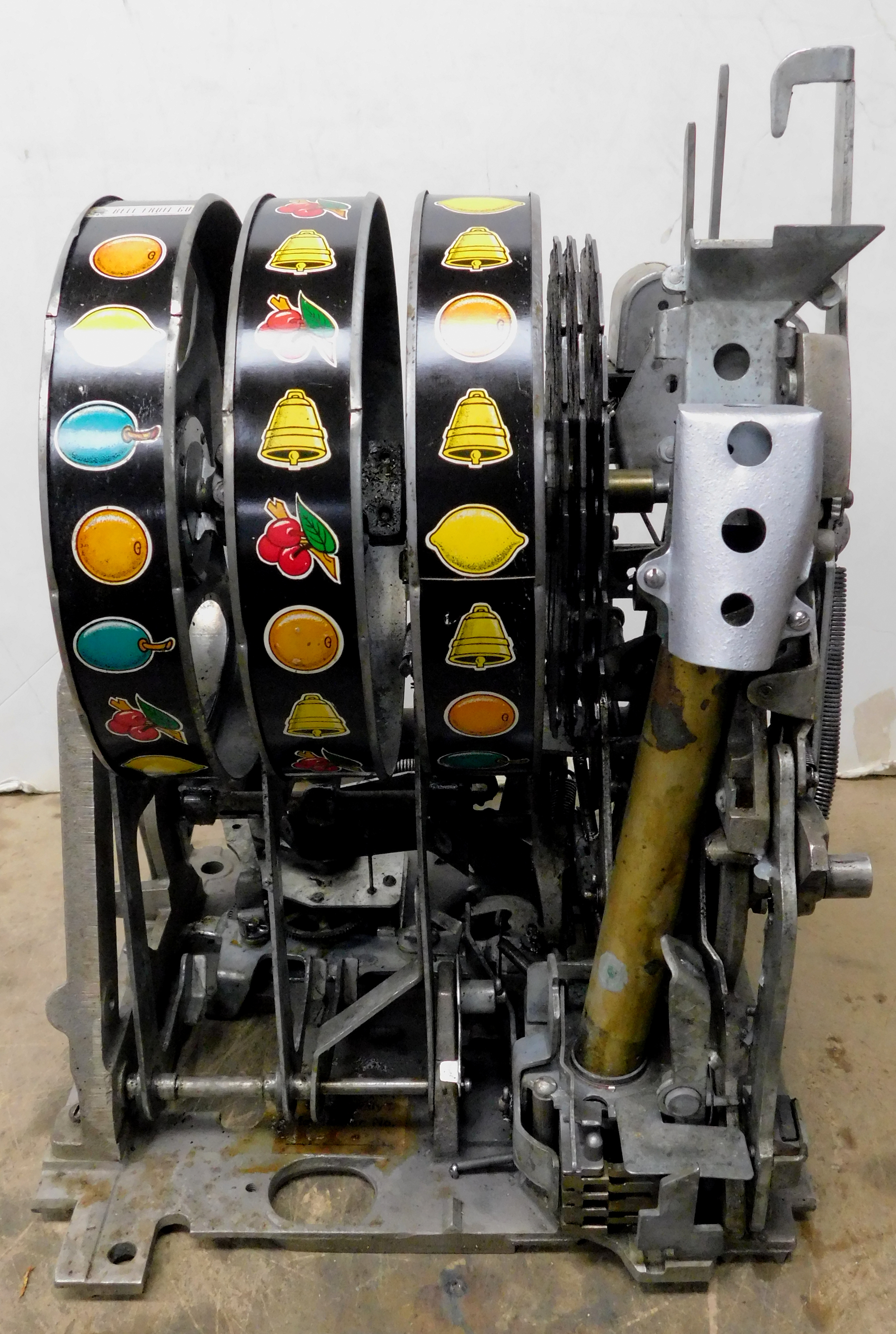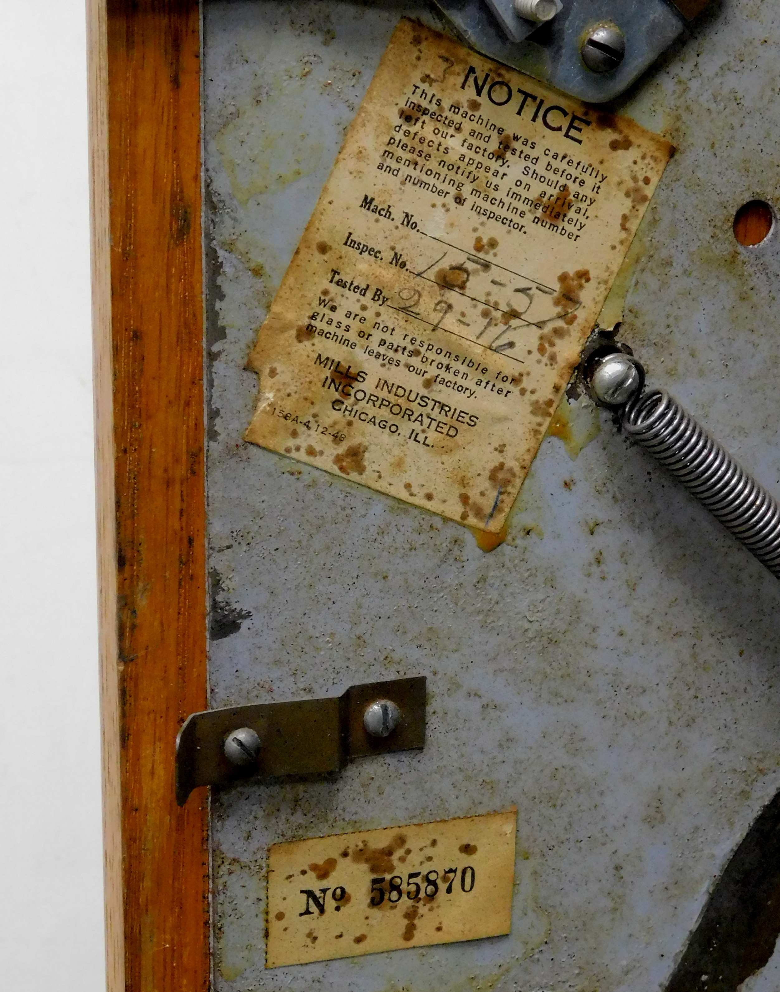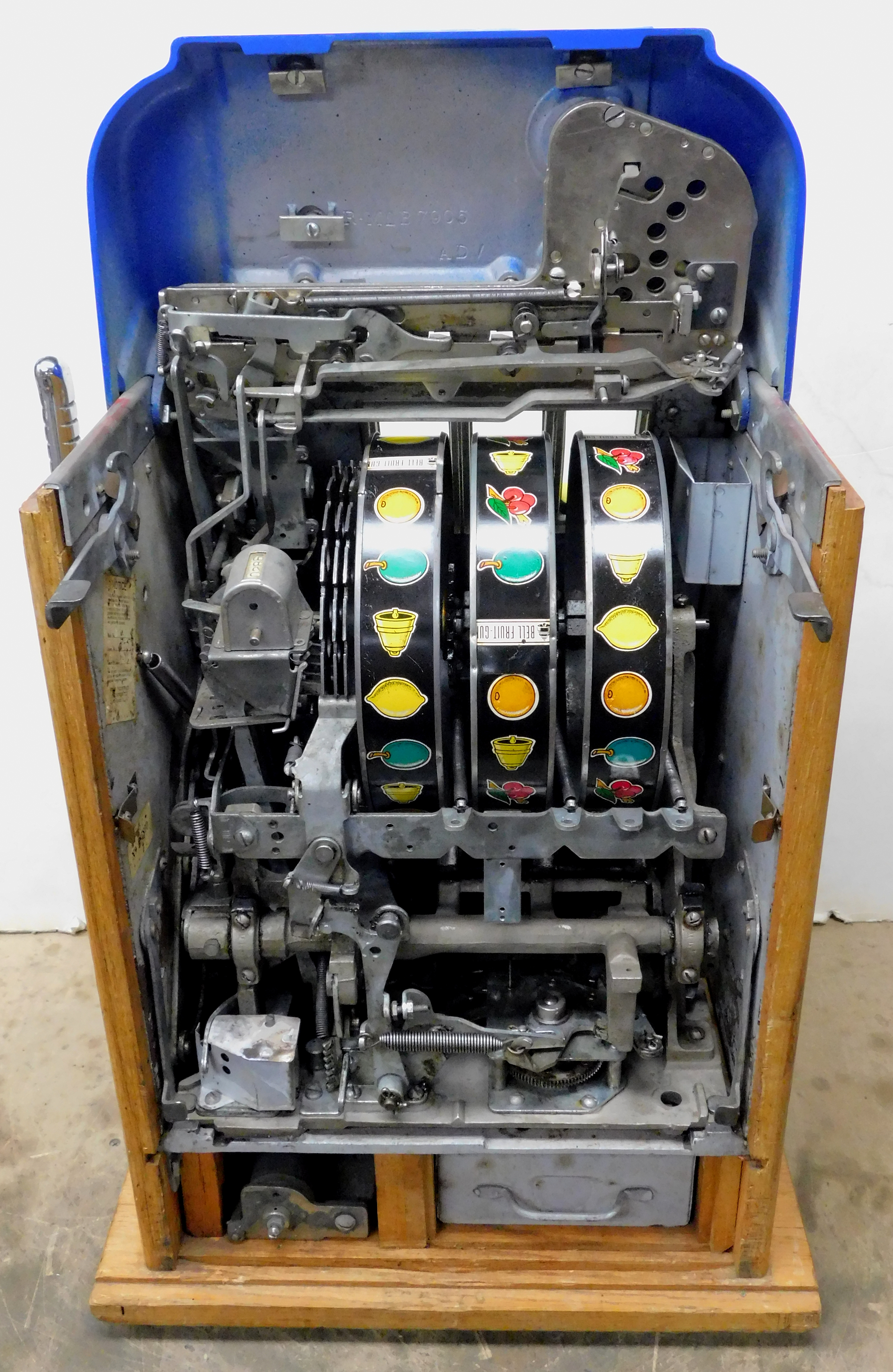 Mills 1948 Blue Bell Hi-Top 5 cent, "Not restore". Other than the top casting repainted blue it's all original condition. Original award card, original reel strips, Jackpot with reserve, original back door with Mills lock with one key, original cash box. Still has the original paper inspection tag and serial number on the inside of the cabinet. Plays very easy, 2-5 pay out.