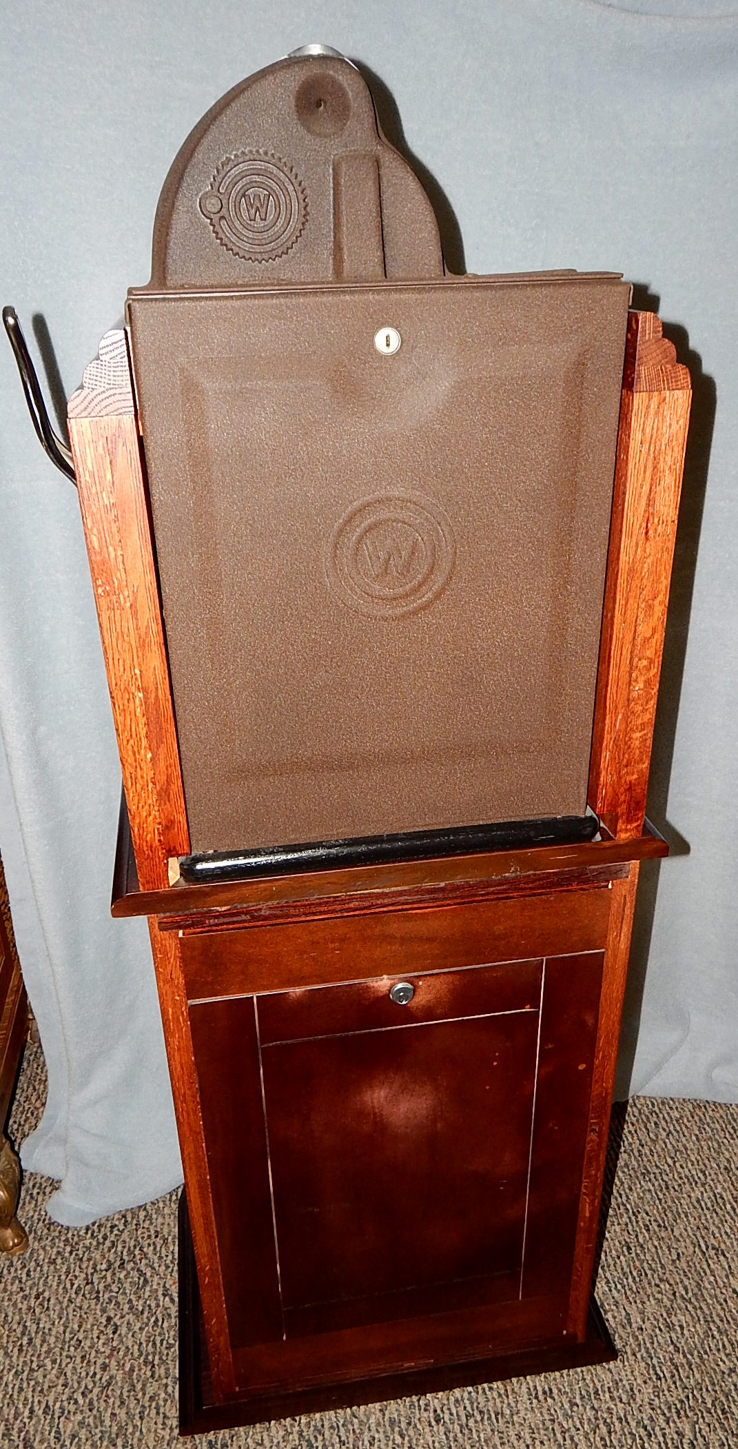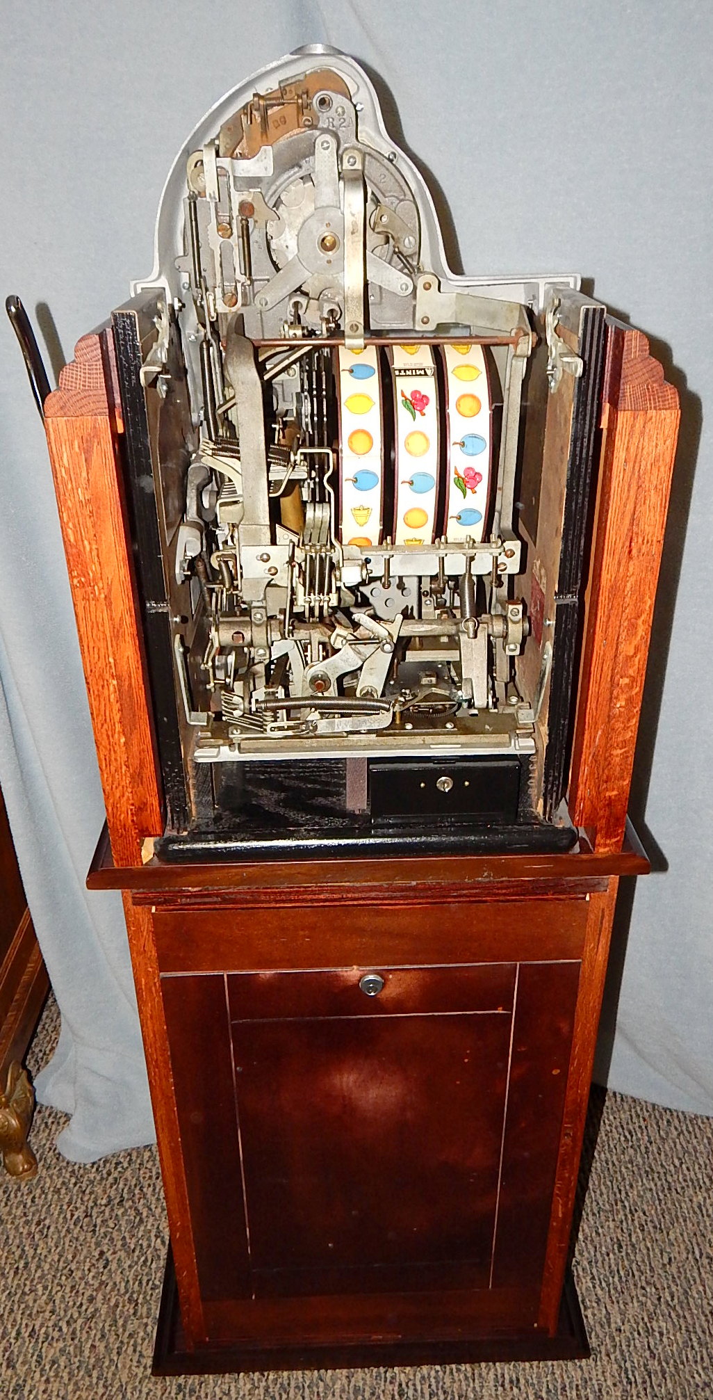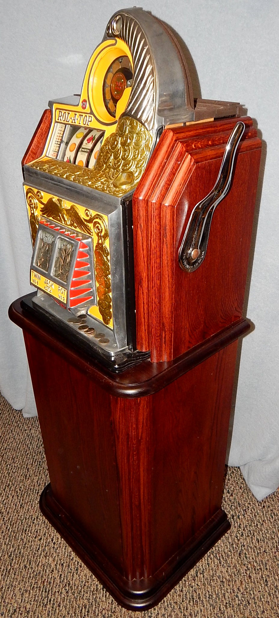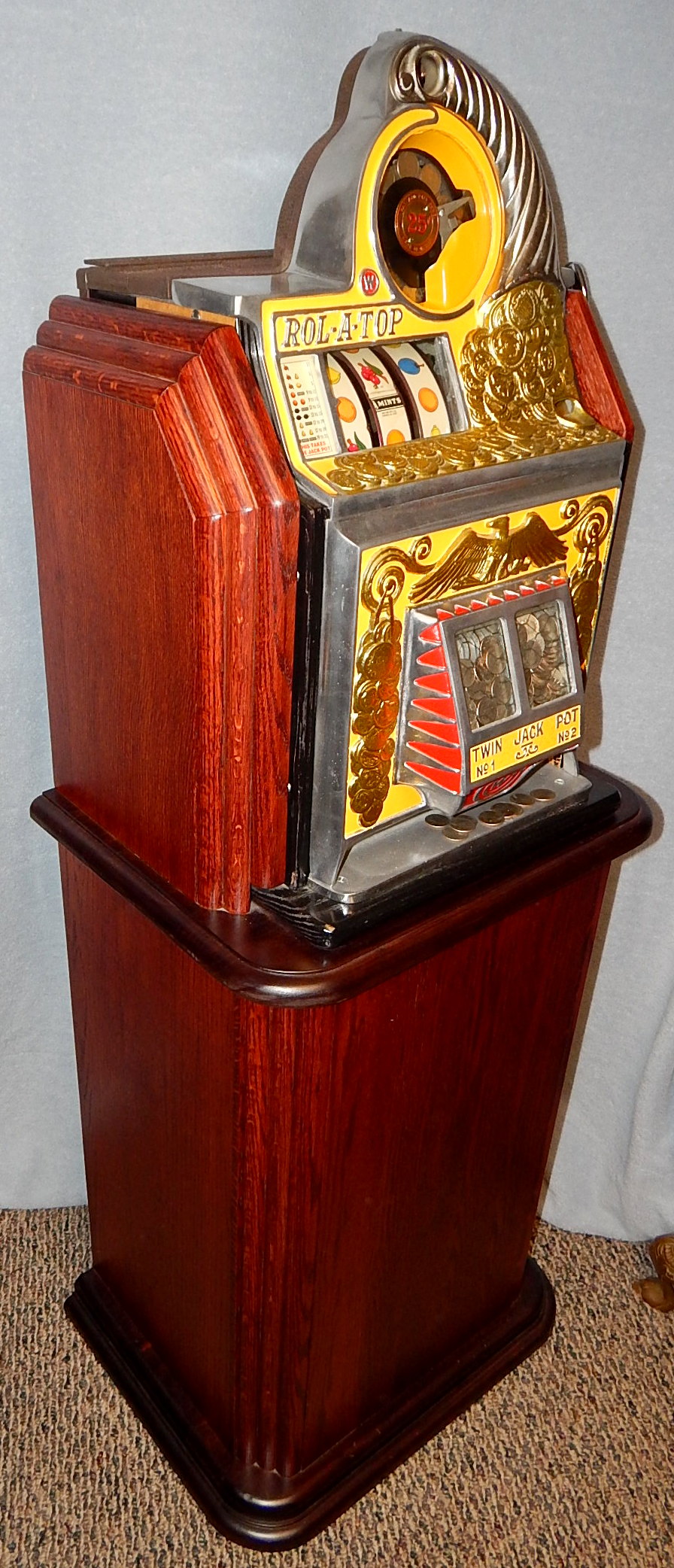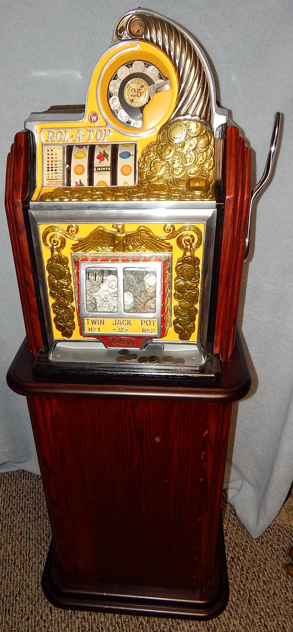 1941 Watling Rol-A-Top " Coin Front", 25 cent. Previously restored back to the original colors. All original other then the paint the way you want to find them. Comes in a very nice two piece mahogany cabinet. Polished casting not plated, original reel strips, twin Jackpot.