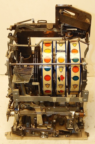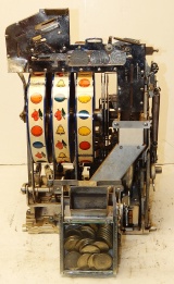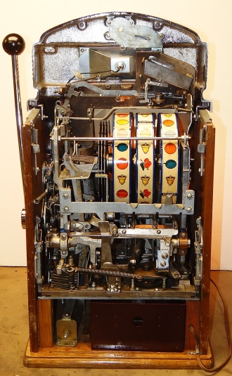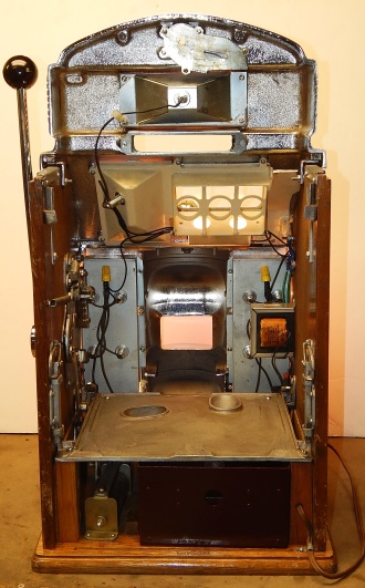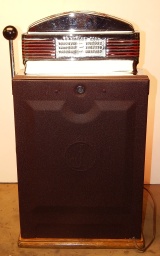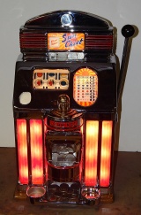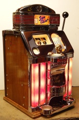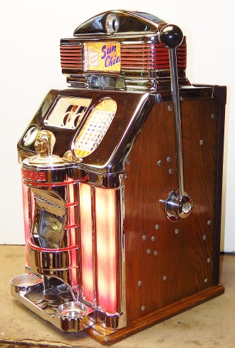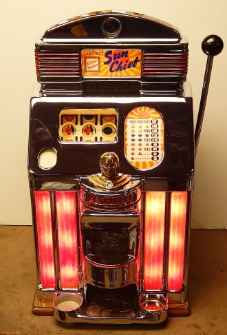 1950 Jennings Sun Chief (lite-up). Rare $1.00 denominations, with front-load functioning jackpot. Previously restored. The chrome plating on this machine is in mint condition. The cabinet is made of solid Oak Wood, not masonite. The machine comes with 100 various casino tokens. It plays and pays as it should.