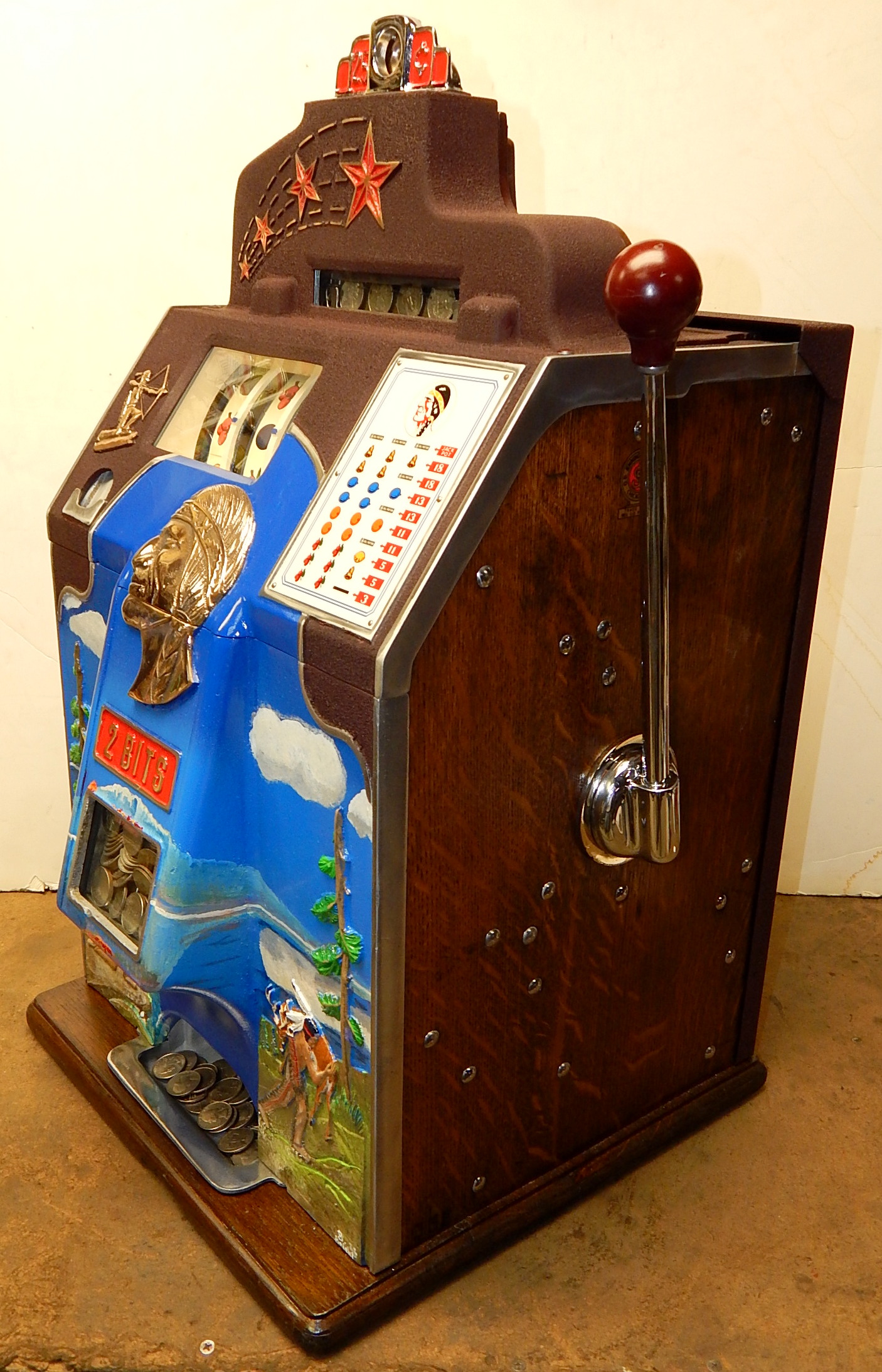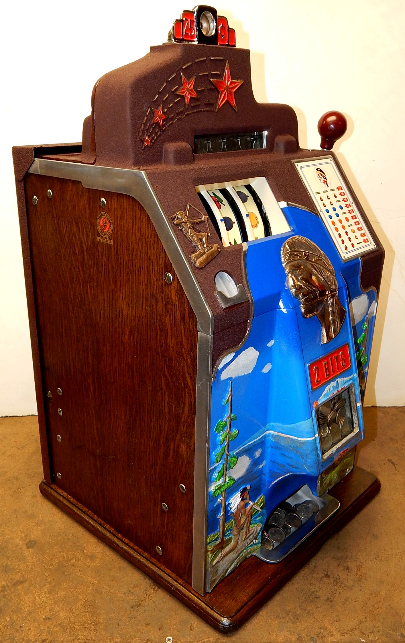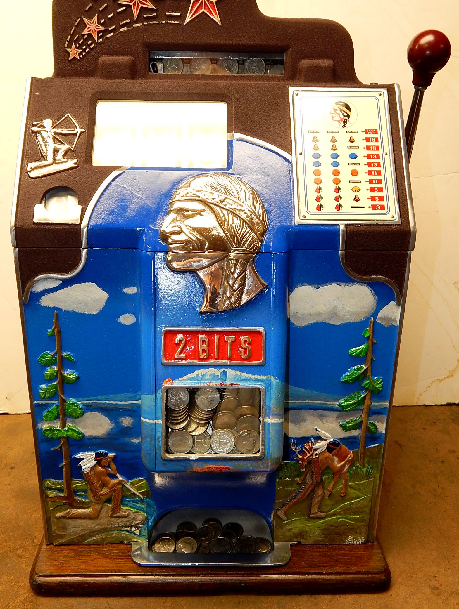 1936 Jennings "4 Star Hunting Scene" Chief, 25 cent. Painted wrinkle Brown. Trimmed in blue with hand painted hunting scene. Very nice original number matching machine. Casting are polished not plated. Very nice condition oak cabinet, new award card, original cash box, new back door, new reel stripes.