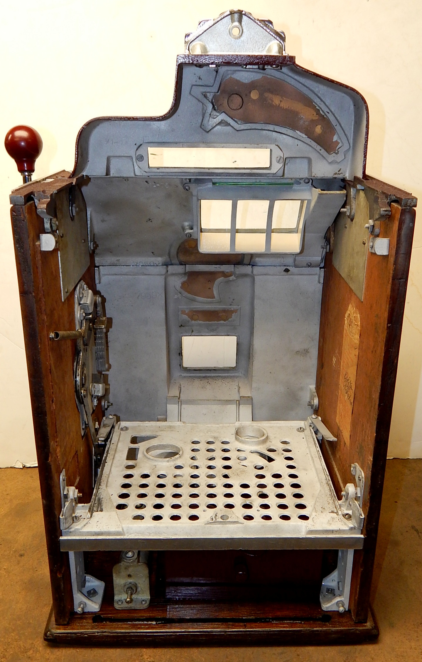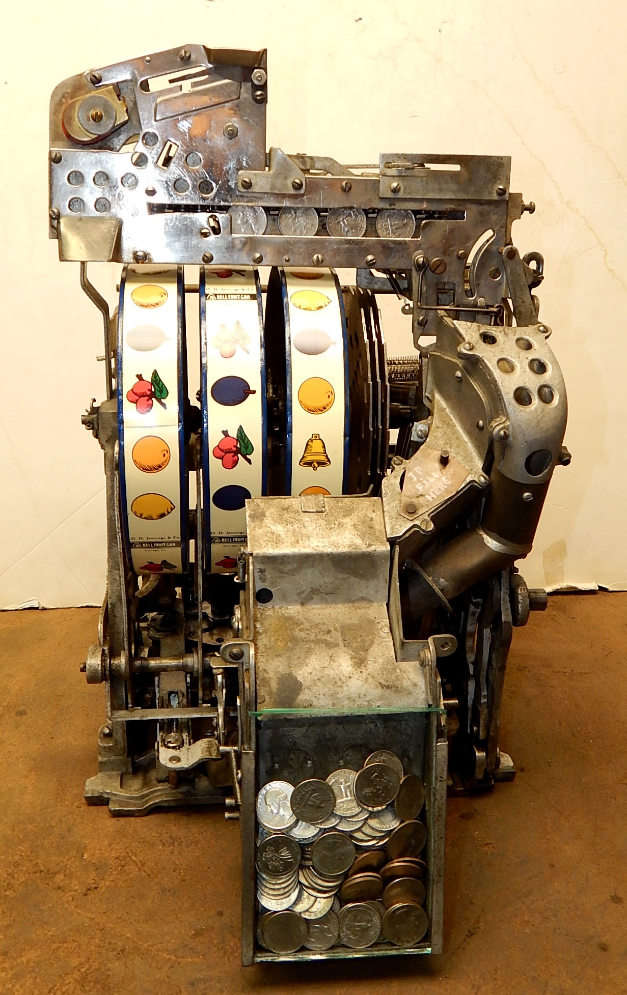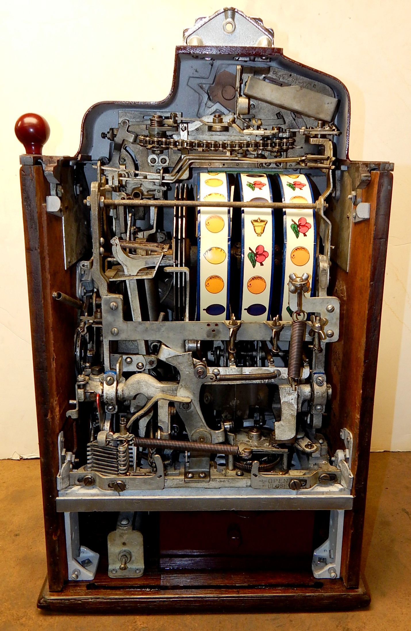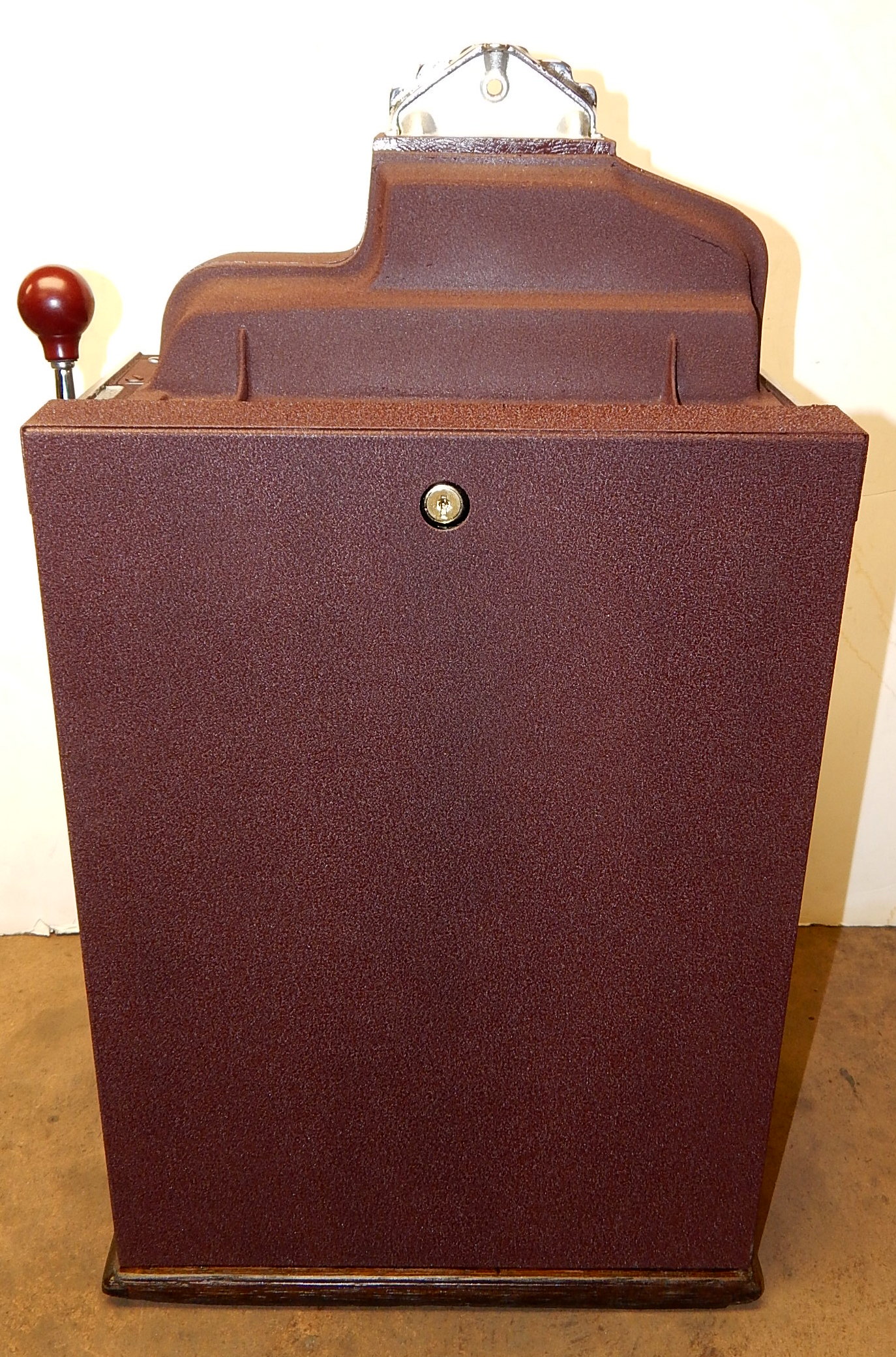 1936 Jennings "4 Star Hunting Scene" Chief, 25 cent. Painted wrinkle Brown. Trimmed in blue with hand painted hunting scene. Very nice original number matching machine. Casting are polished not plated. Very nice condition oak cabinet, new award card, original cash box, new back door, new reel stripes.