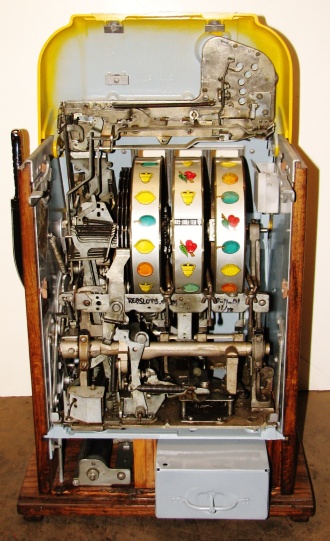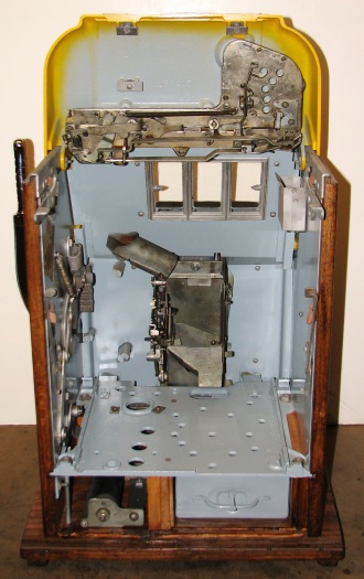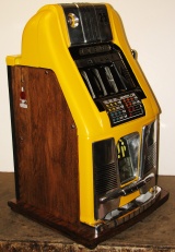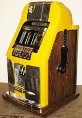 Mills 1950 Hi-Top 25 cent, This is a very nice machine restored in colors of Yellow, trimed in Black. Mint condition original award card, original reel strips, Jackpot with reserve, original back door with Mills lock with one key, original cash box. Still has the original paper inspection tag and serial number on the inside of the cabinet. Plays very easy, 2-5 pay out.