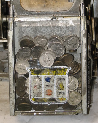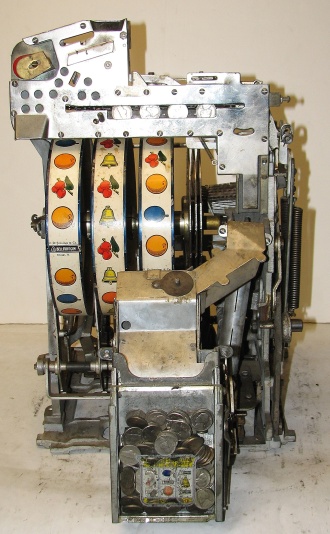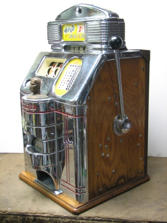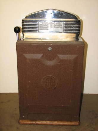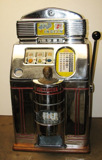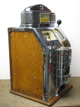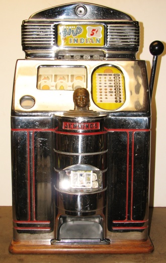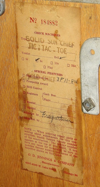 1948 Jennings Solid Sun Chief "Wild Chief" Tic, Tac, Toe, 5 cent. Original chrome in good shape for a 65 year old. Trimed in red. Very nice original machine not restored, original cash box, original back door, original reel stripes, very nice oak cabinet. All numbers match. Clean and adjusted, ready to play. Jennings Wild Chief machines were the awnser to Mills Deuce Wild. Anytime the Chief show up on the center line on the first reel, its wild and match any other symbol. This machine also has the Tic,Tac,Toe feature pays 18 coins making this machine a high payout machine.