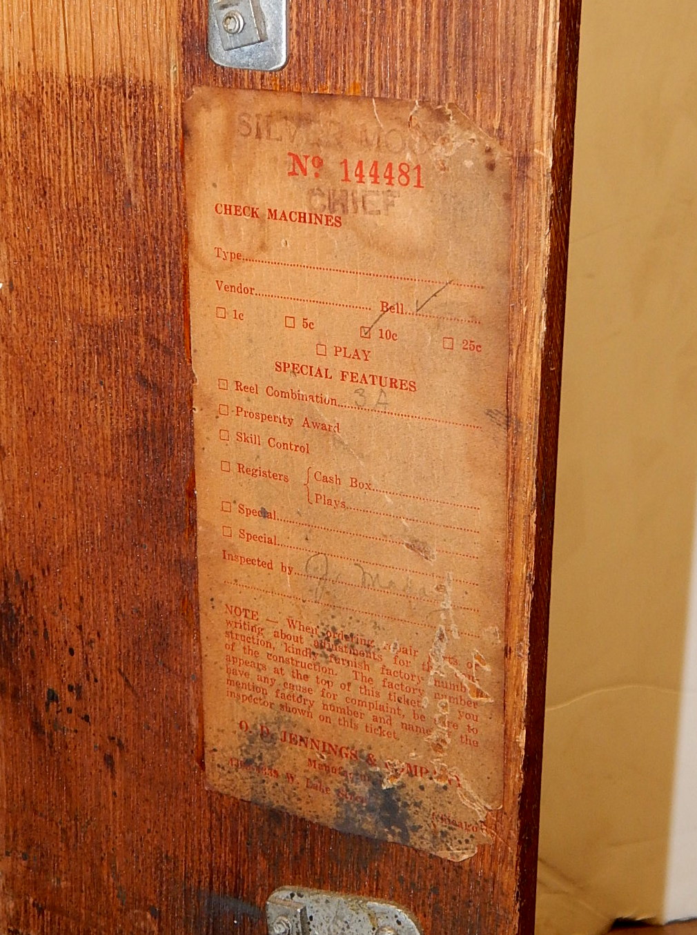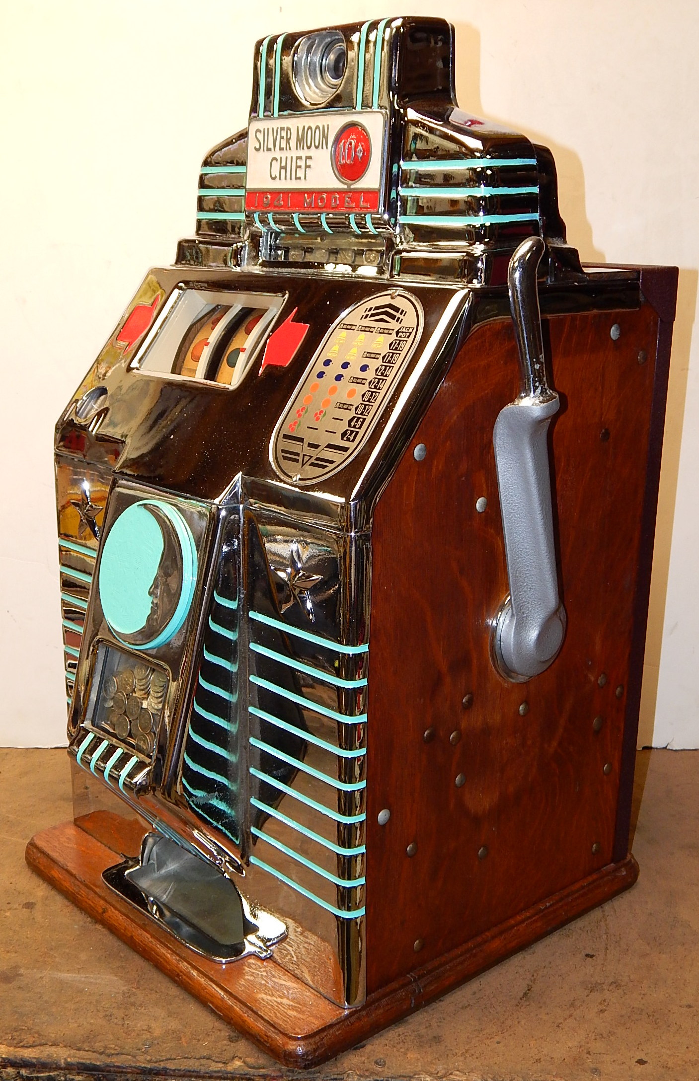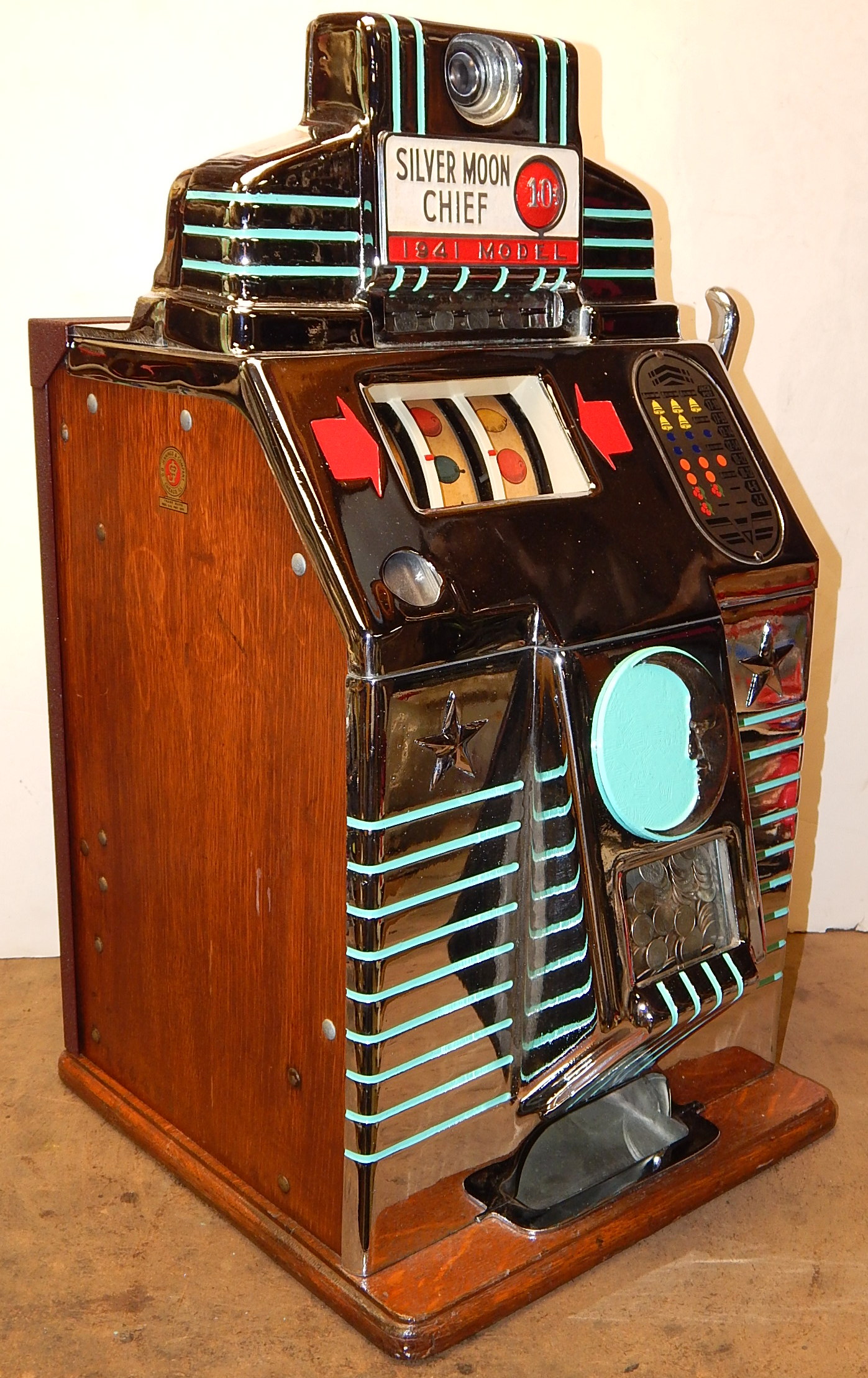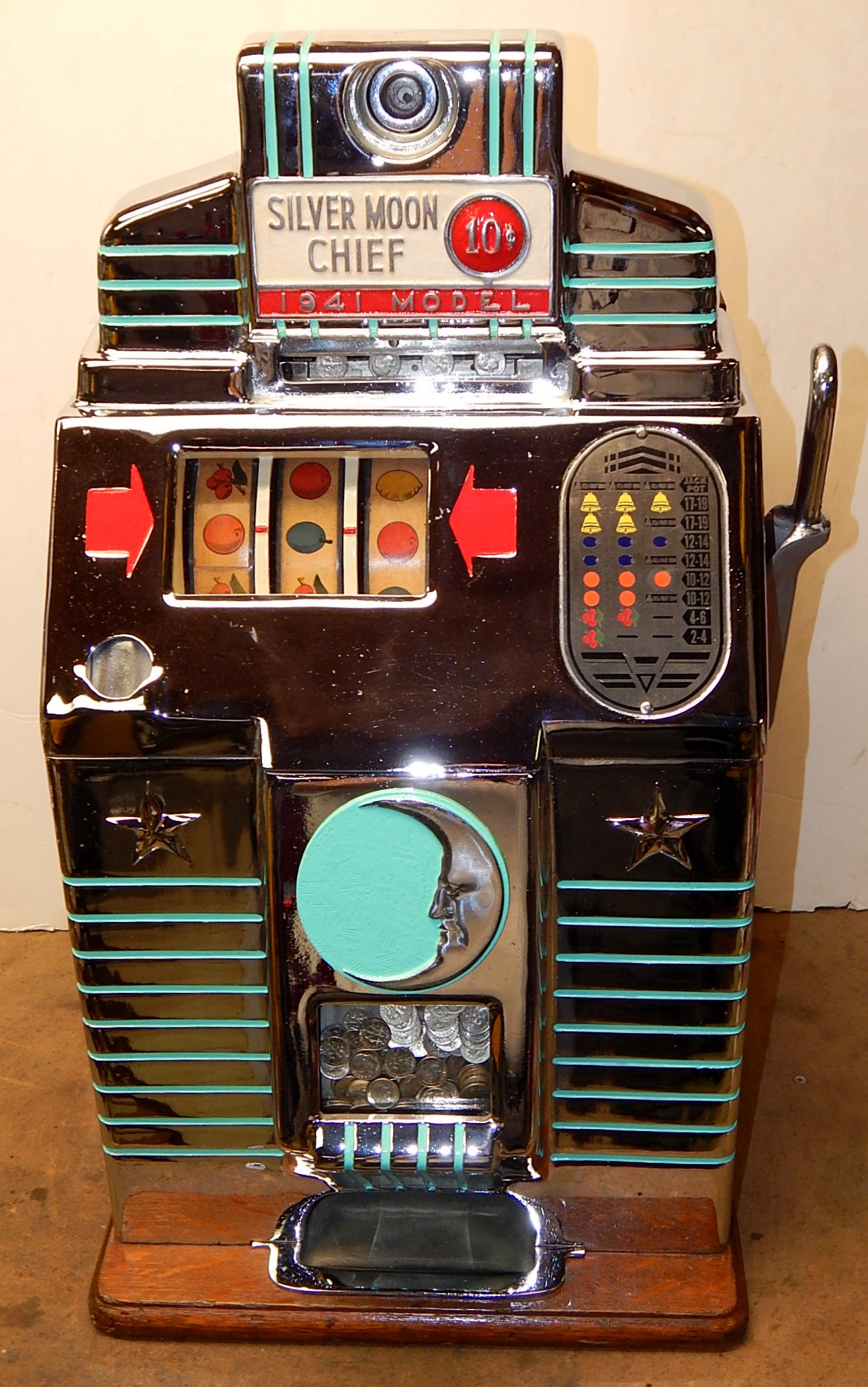 1941 Jennings Silver Moon Club Chief, 10 cent. Numbers matching. Previously restored back to the original colors, aqua, red, white with new chrome plating. The chrome is 9 out of a 10. on this machine. Plays nice. New cash box, All oak cabinet. Mint condition award card, new back door. Reel strips are original.