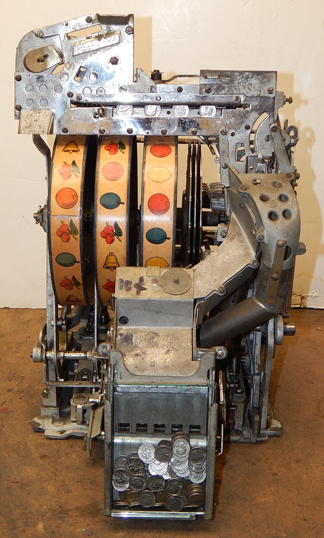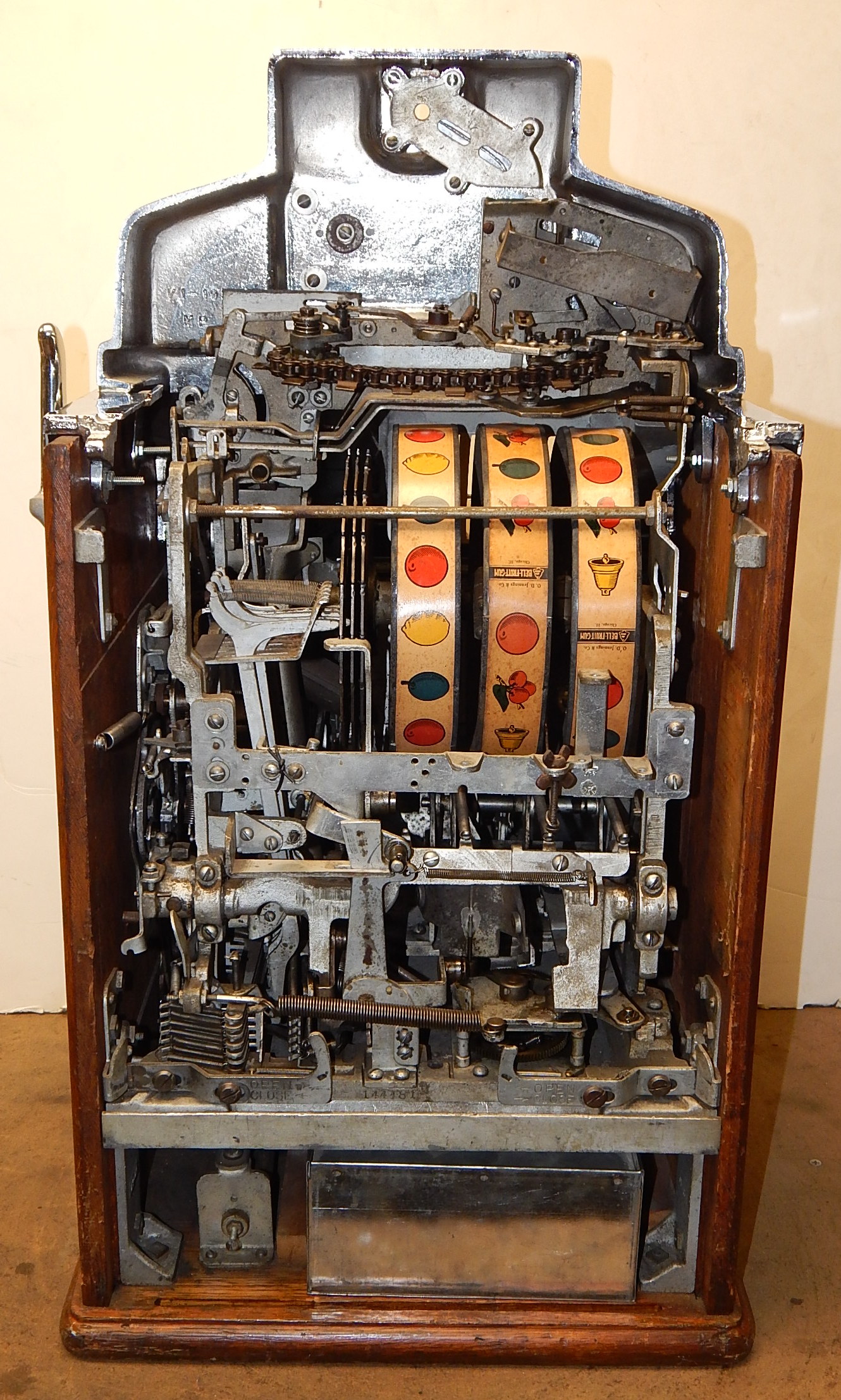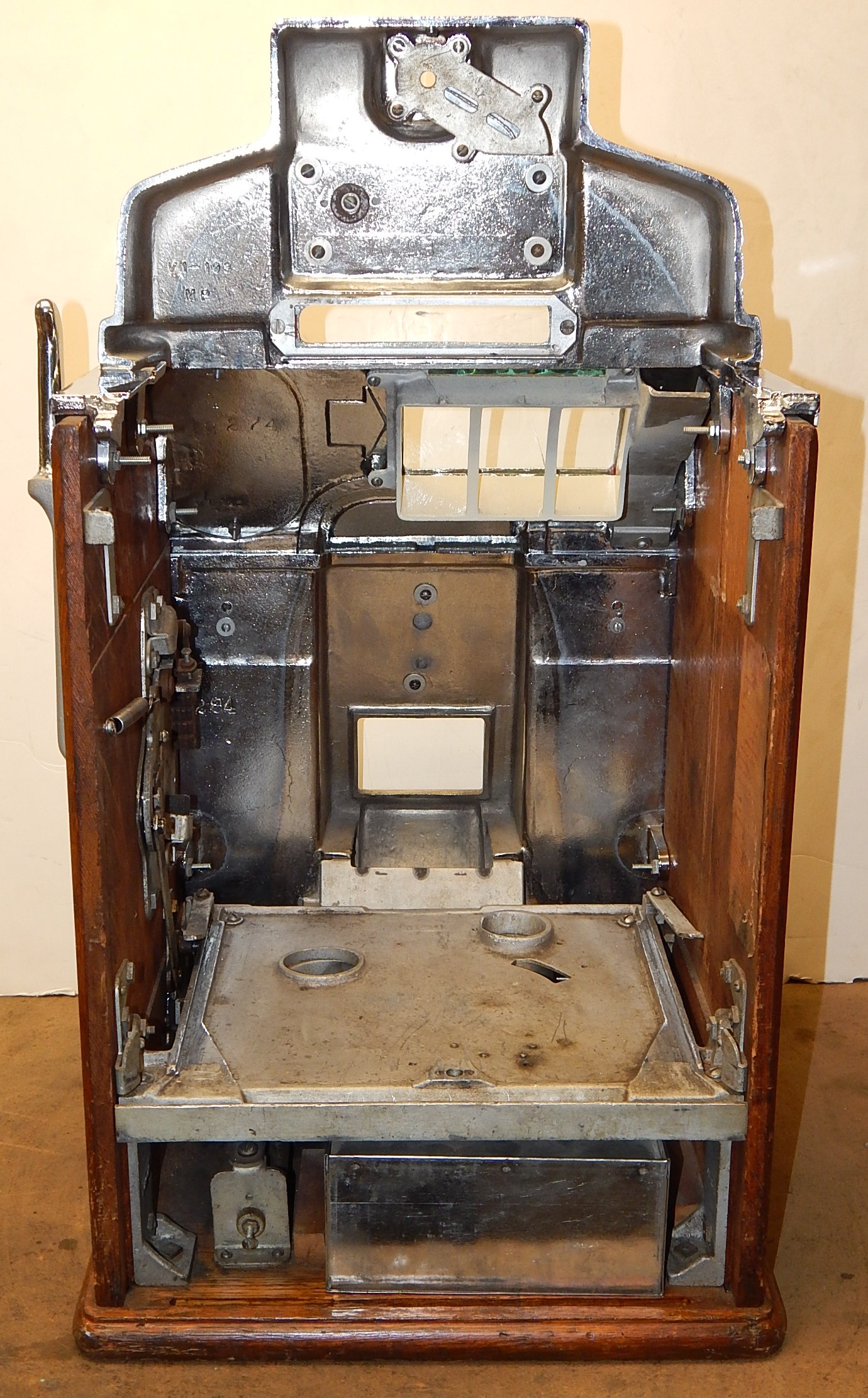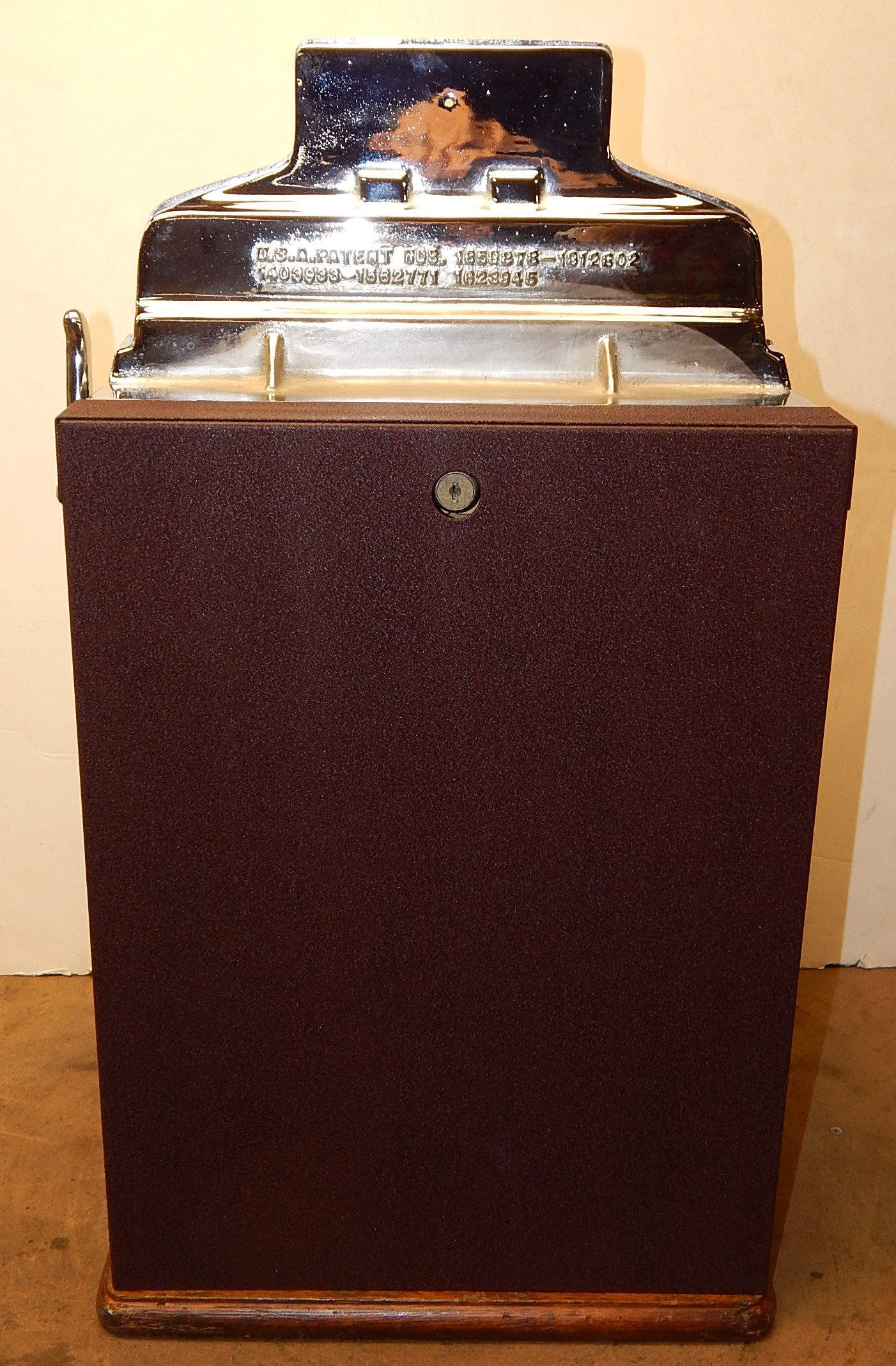 1941 Jennings Silver Moon Club Chief, 10 cent. Numbers matching. Previously restored back to the original colors, aqua, red, white with new chrome plating. The chrome is 9 out of a 10. on this machine. Plays nice. New cash box, All oak cabinet. Mint condition award card, new back door. Reel strips are original.