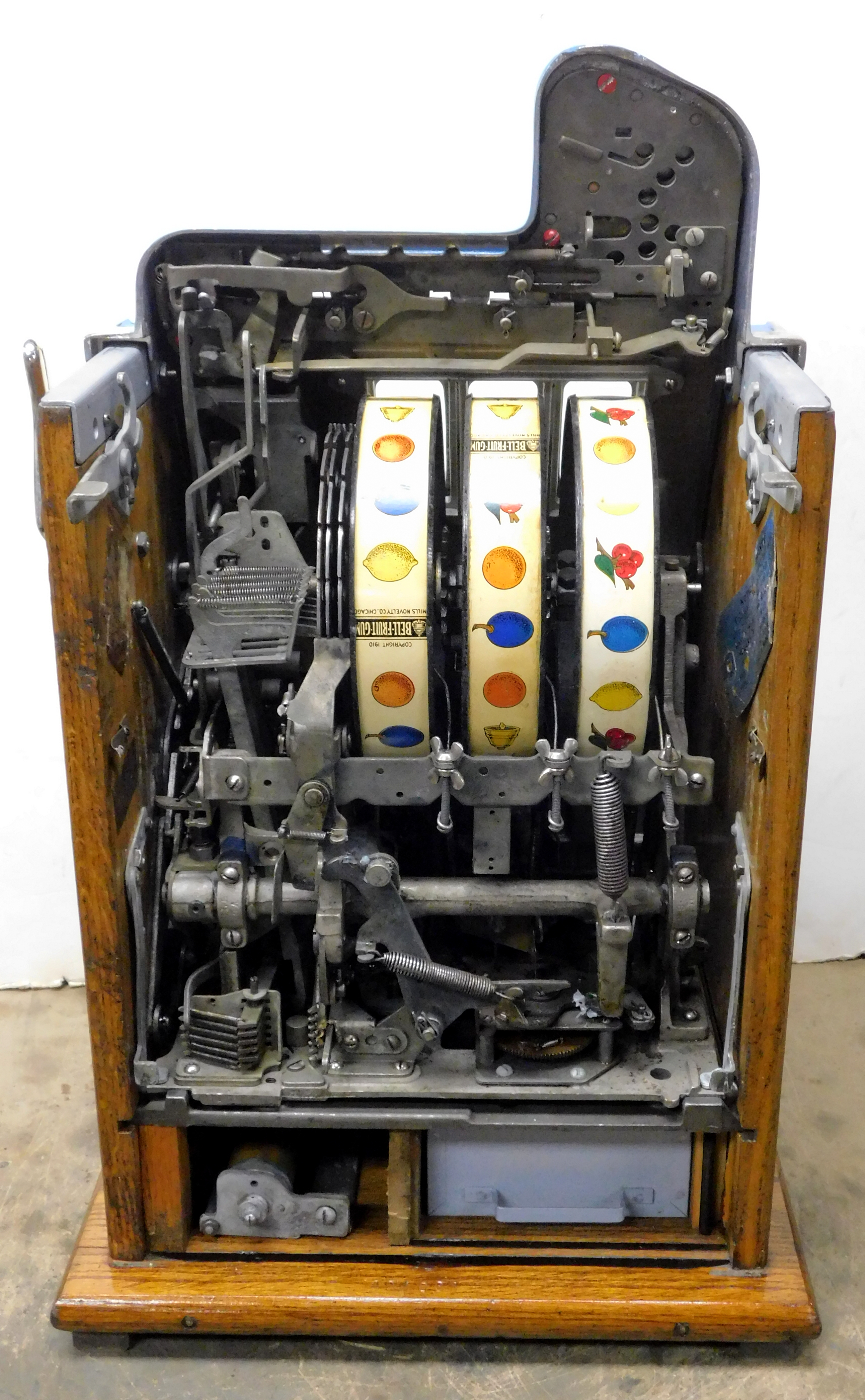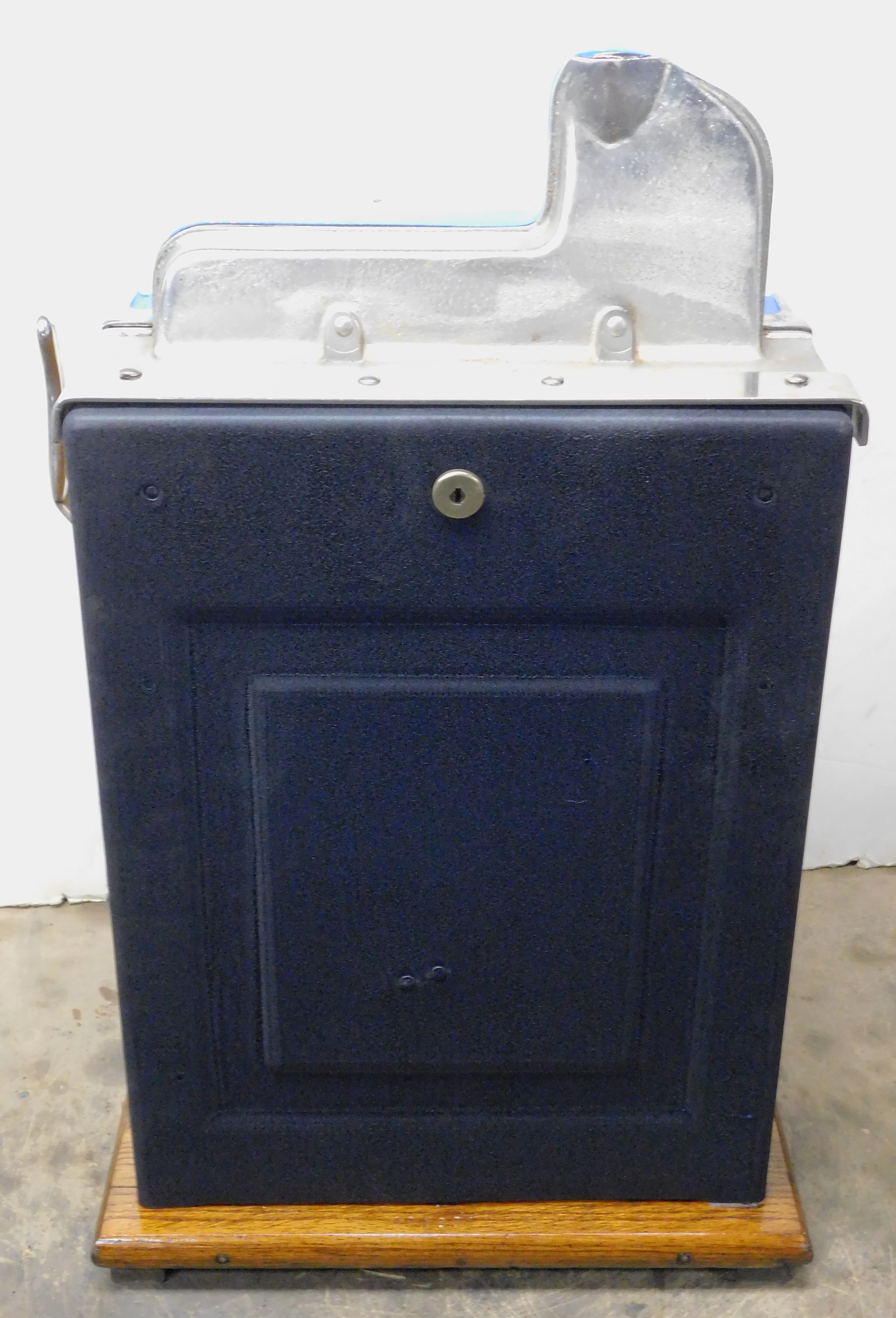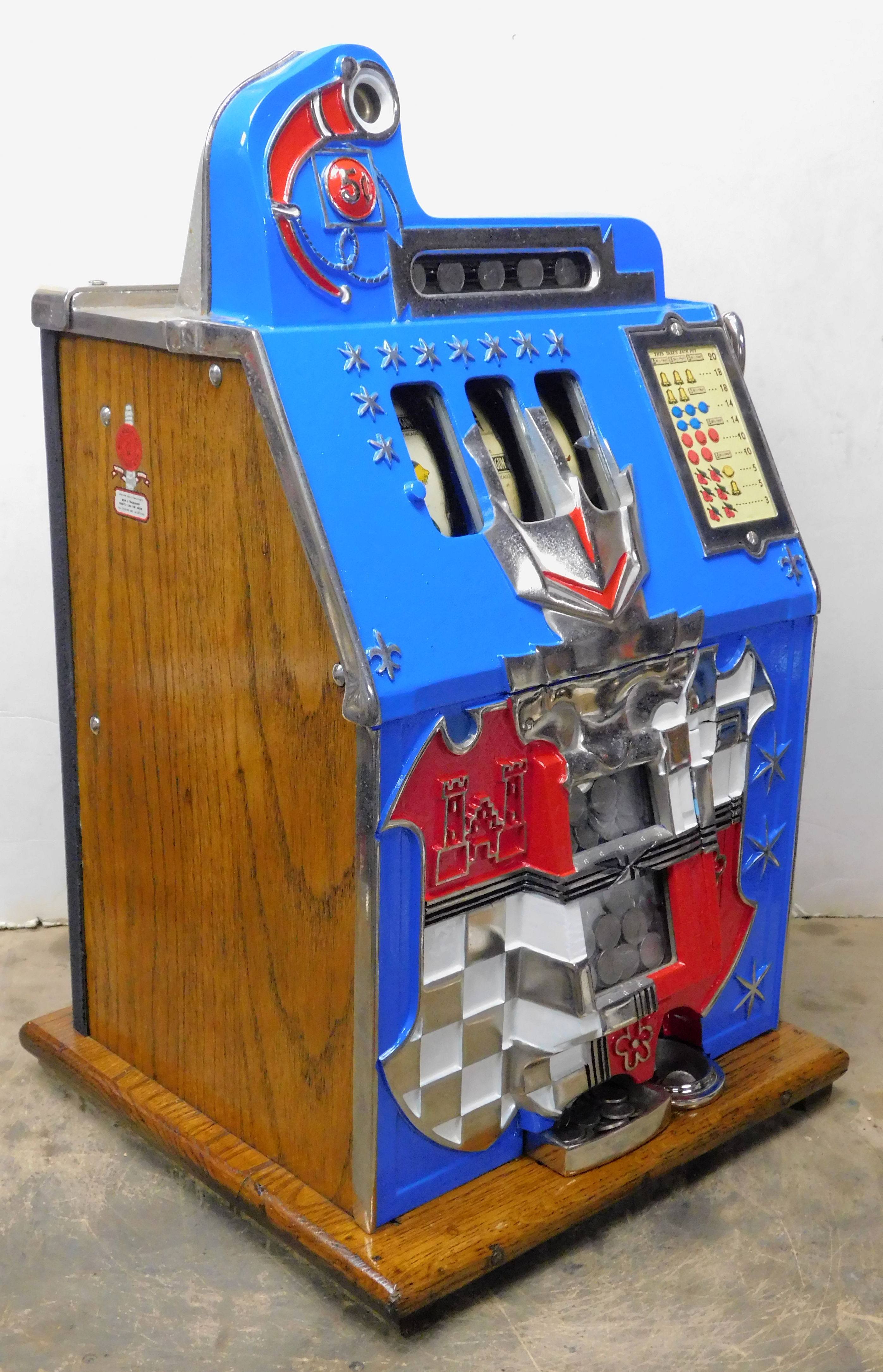 1935 Mills Castle Front 5 cent, previously restored, painted blue, red, white polished. Beautiful white oak cabinet with working Jackpot and reserve, original Reel Strip, original back door, original Mills lock with one key, cash box. Still has the original paper work on the inside. Plays very easy.