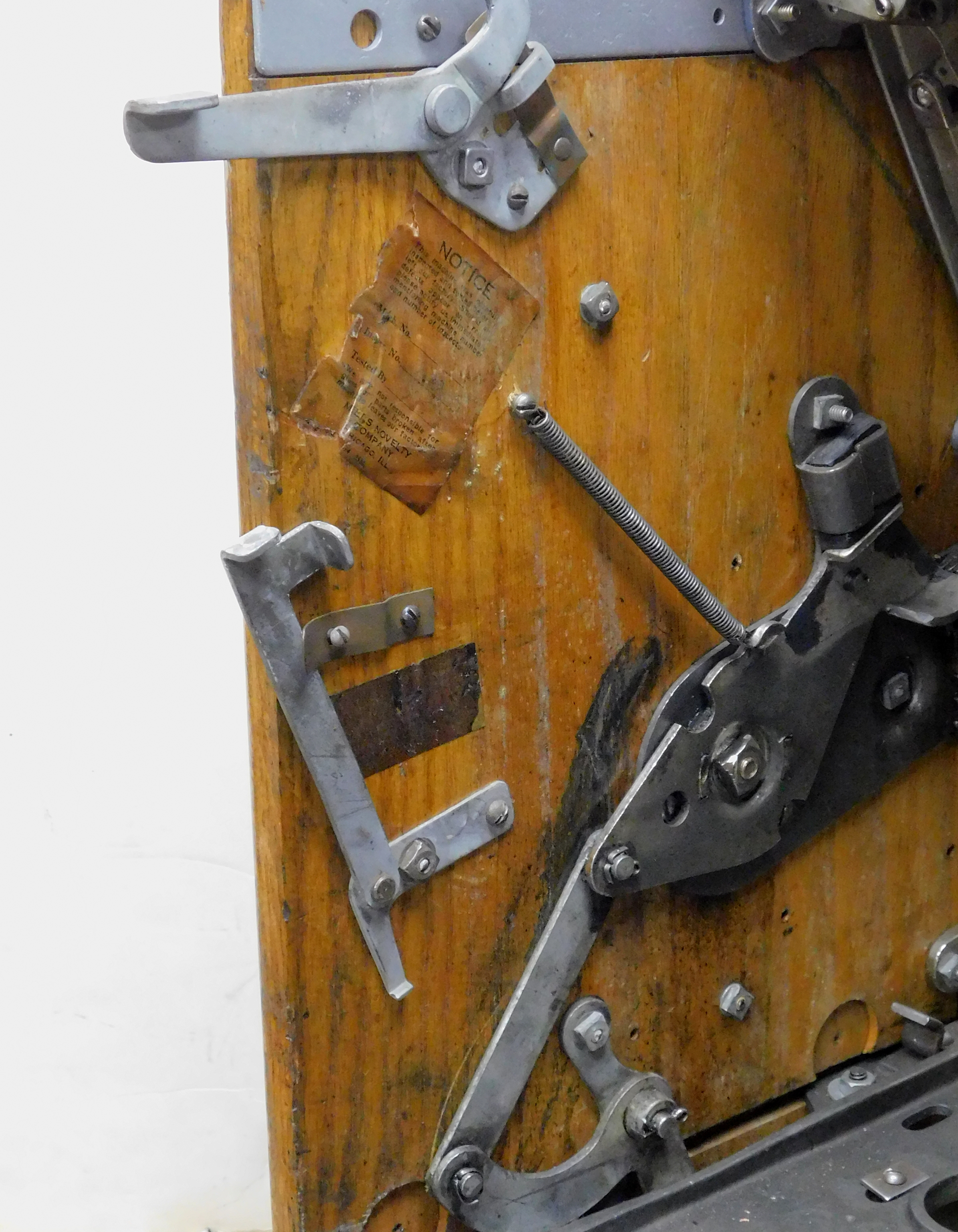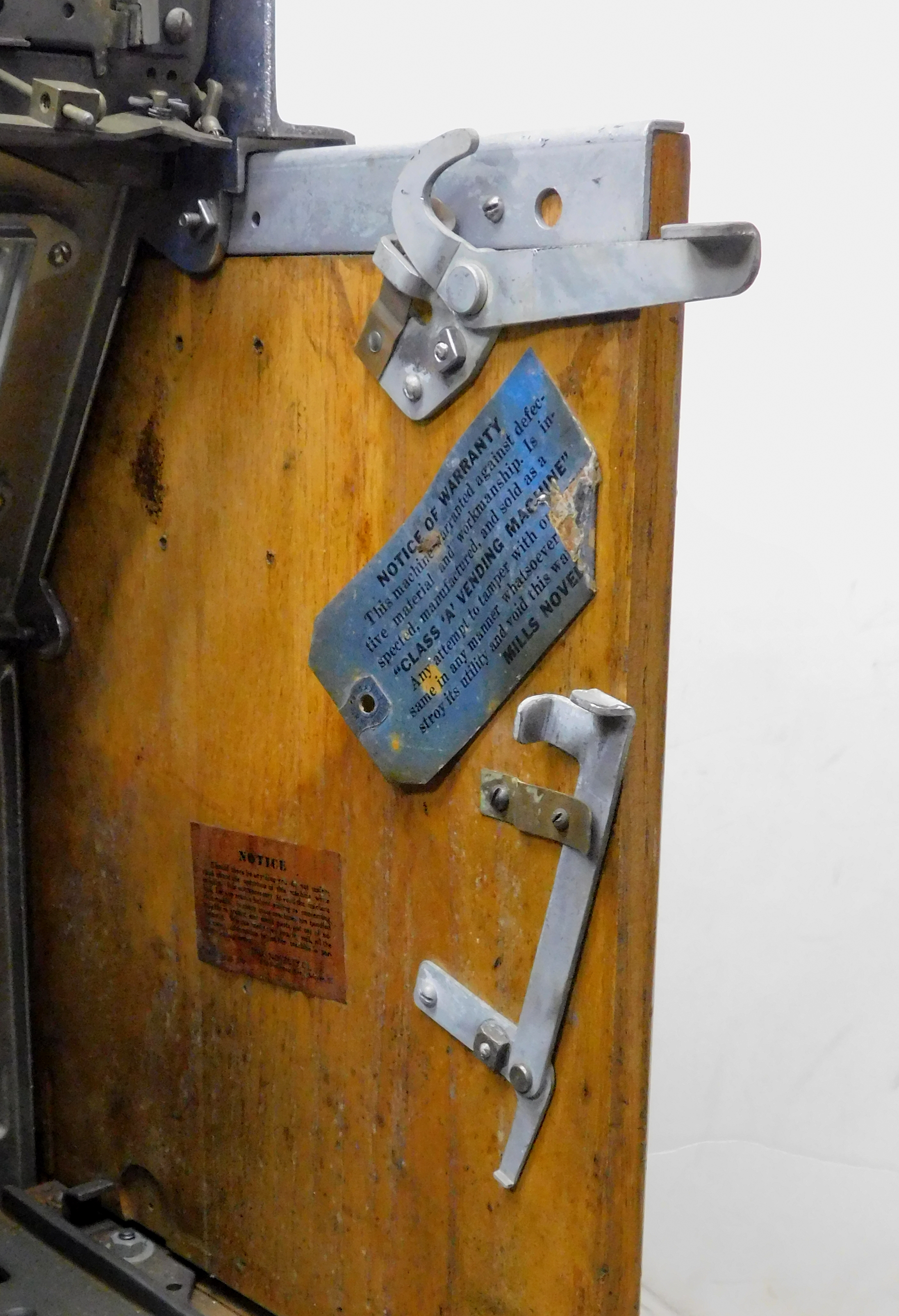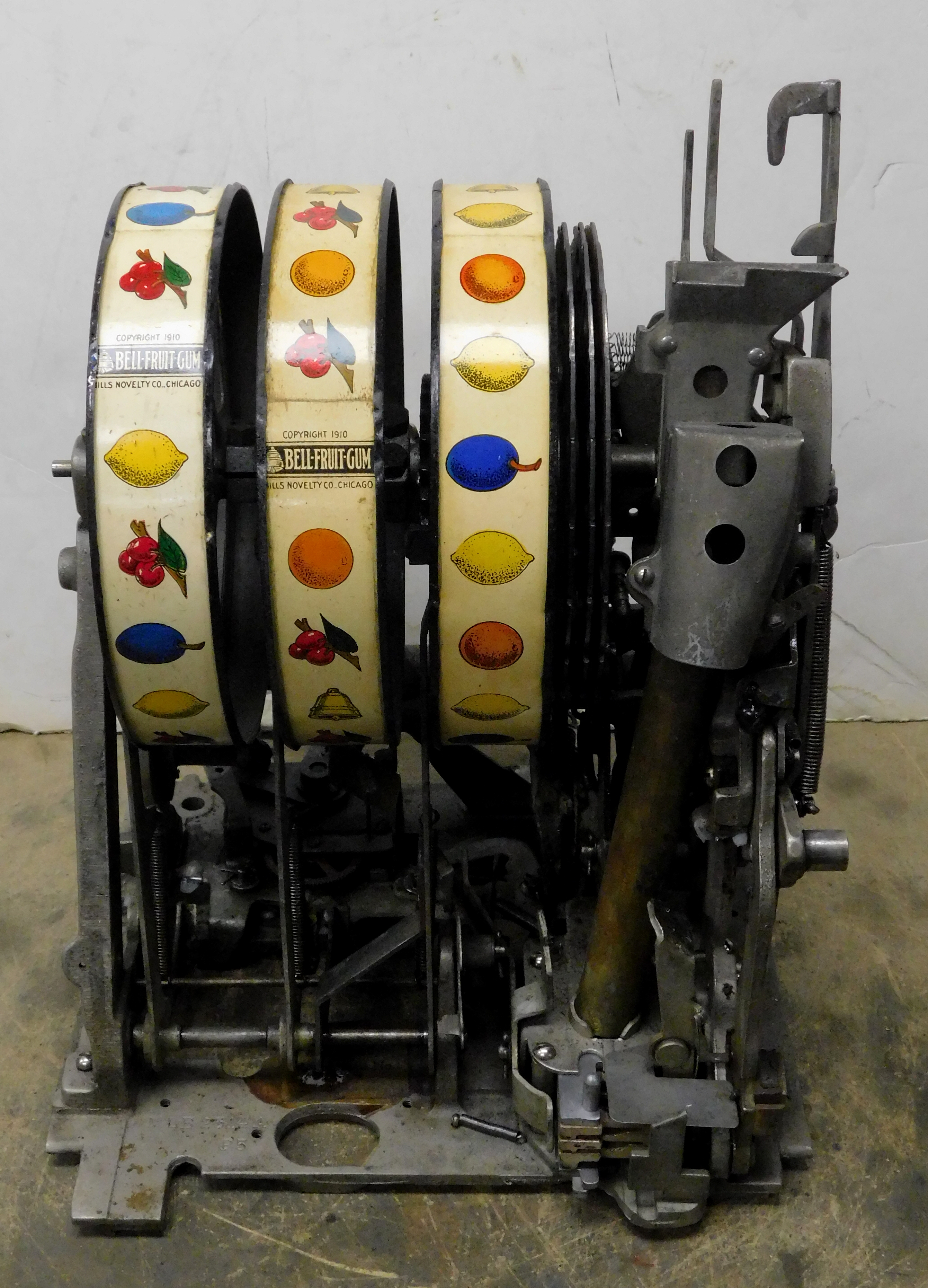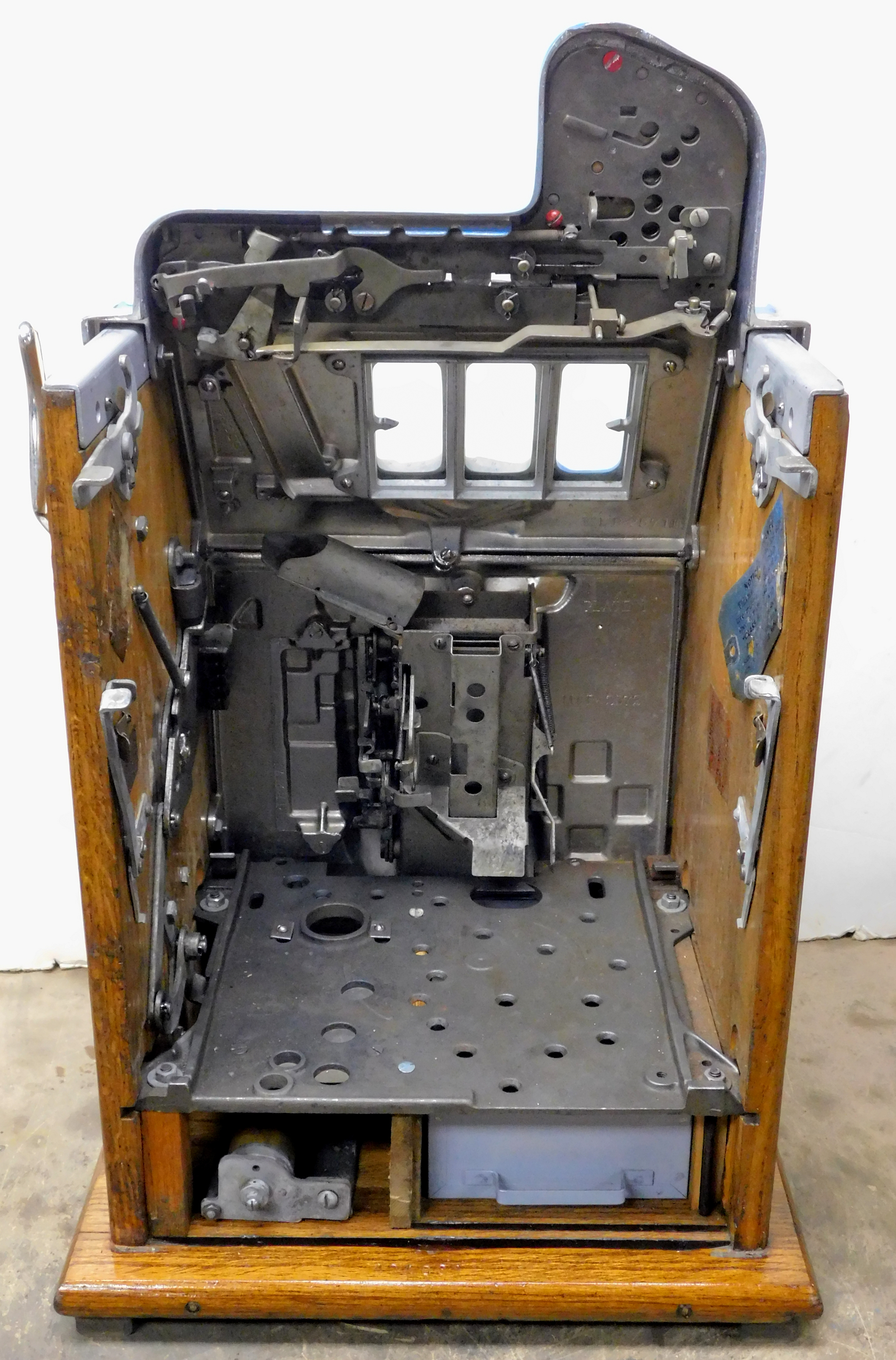 1935 Mills Castle Front 5 cent, previously restored, painted blue, red, white polished. Beautiful white oak cabinet with working Jackpot and reserve, original Reel Strip, original back door, original Mills lock with one key, cash box. Still has the original paper work on the inside. Plays very easy.