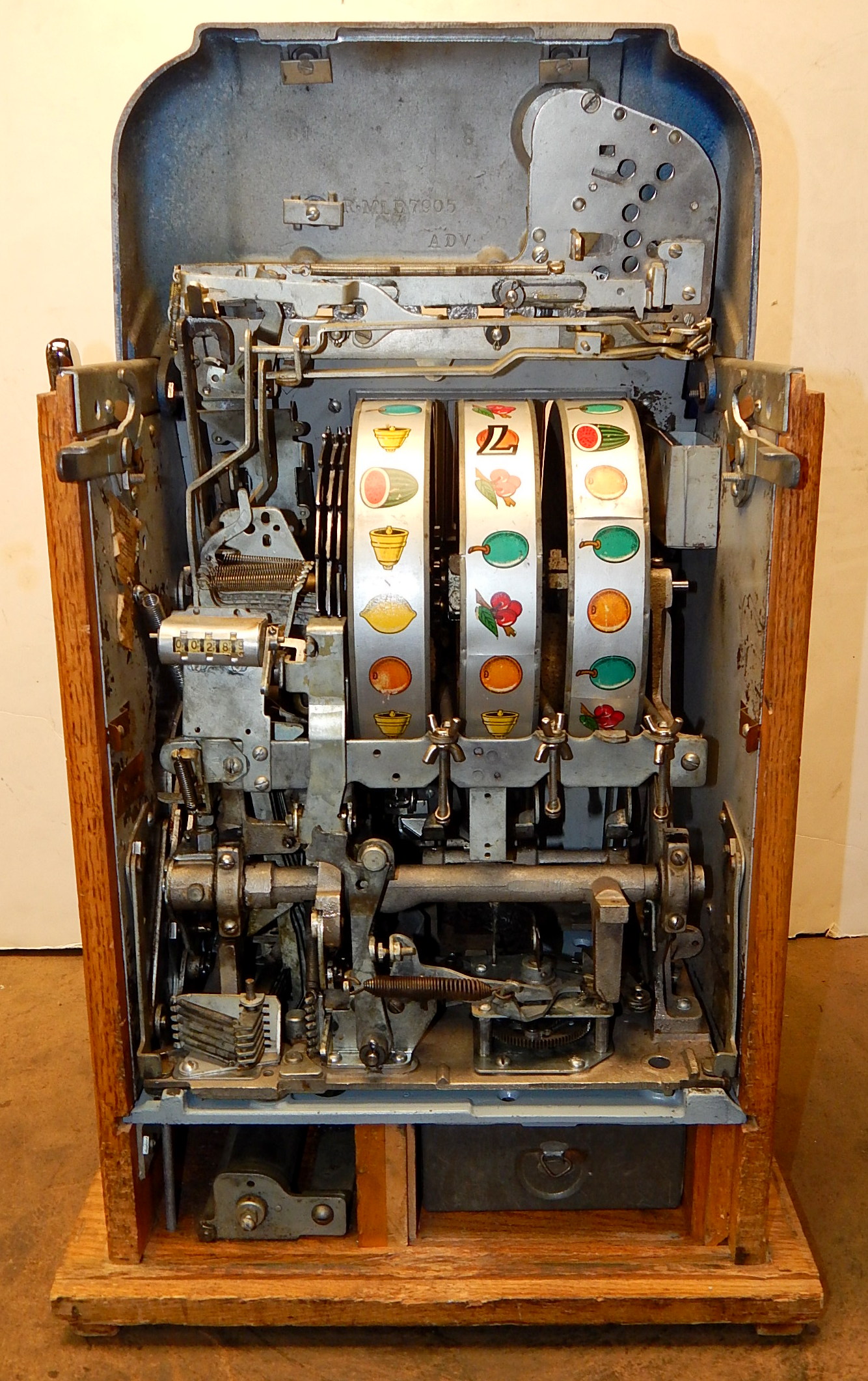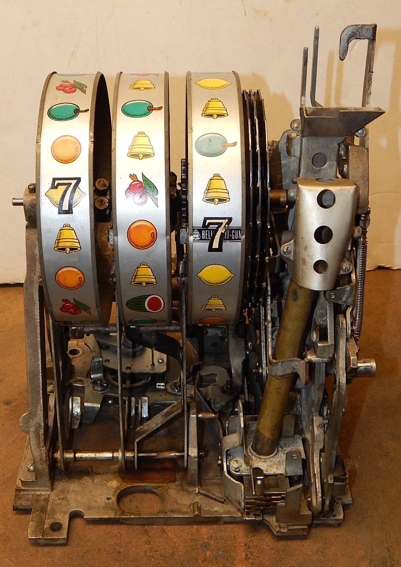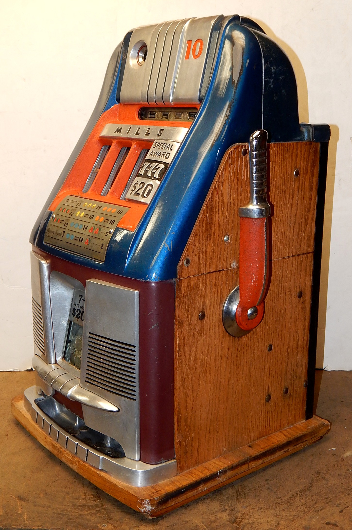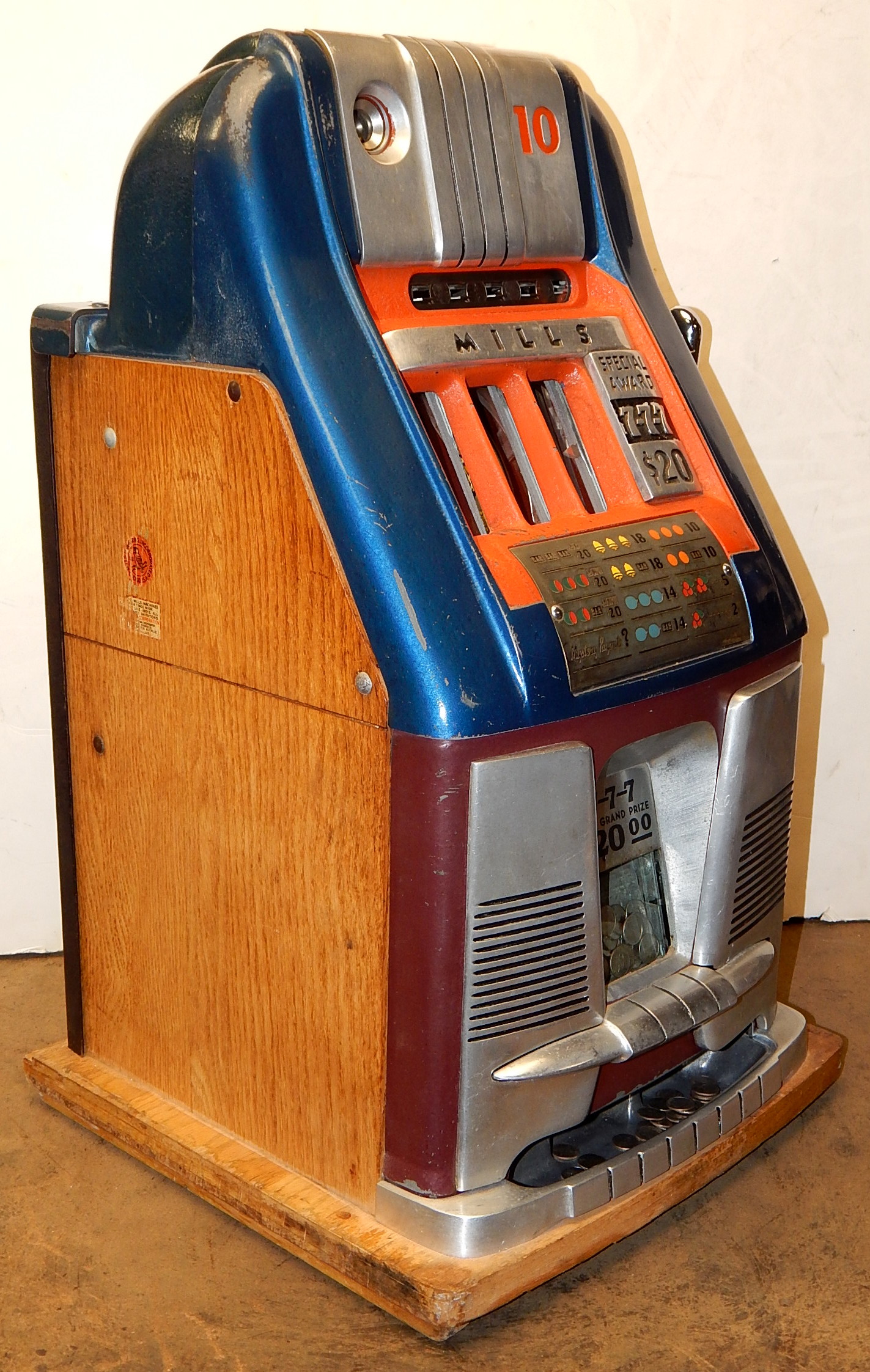 Mills Hi-Top 7-7-7, 10 cent, original condition. Original reel strips, full Jackpot with reserve, original back door, original cash box, Mills locks with one key, original award card, 7-7-7 award token vendor with two original tokens, still has the paper work on the cabinet and mechanism. If you are looking for a nice original machine, here you are. Plays easy and pays as it should. Ready for many years of trouble free service.