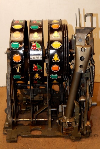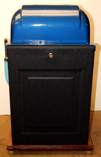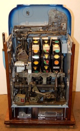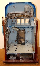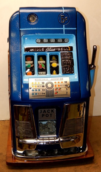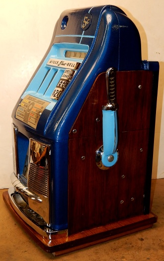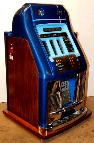 Mills 1948 Blue Bell Hi-Top 5 cent, This is a very nice perviously restored machine. Gloss Blue trimmed in Lt Blue. All the trim on this machine has been chrome plated to add a little flash to the gloss Blue color. Mint condition award card, Jack pot with reserve, original back door and lock with two key, new cash box, still has the original paper work on the inside of the cabinet. Very nice oak cabinet. Plays very easy.