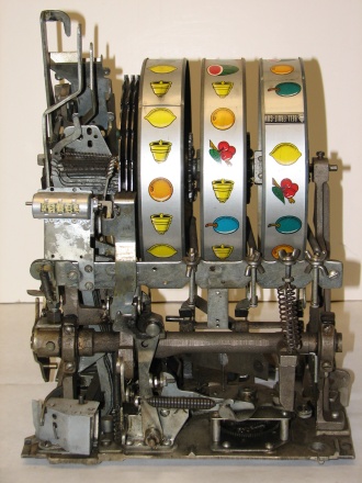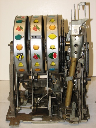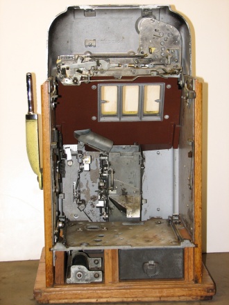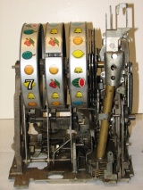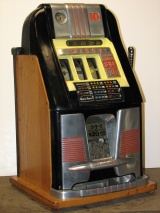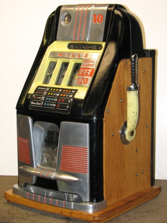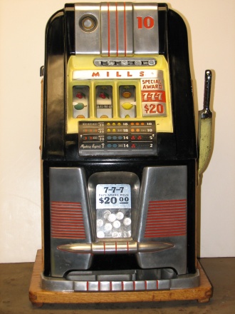 1957 Mills Hi-Top 7-7-7, 10 cent. Very nice original machine not restored, with Jackpot, original cash box, original back door, original reel stripes. original Mills lock with one key, 7-7-7 Token vendor with tokens.