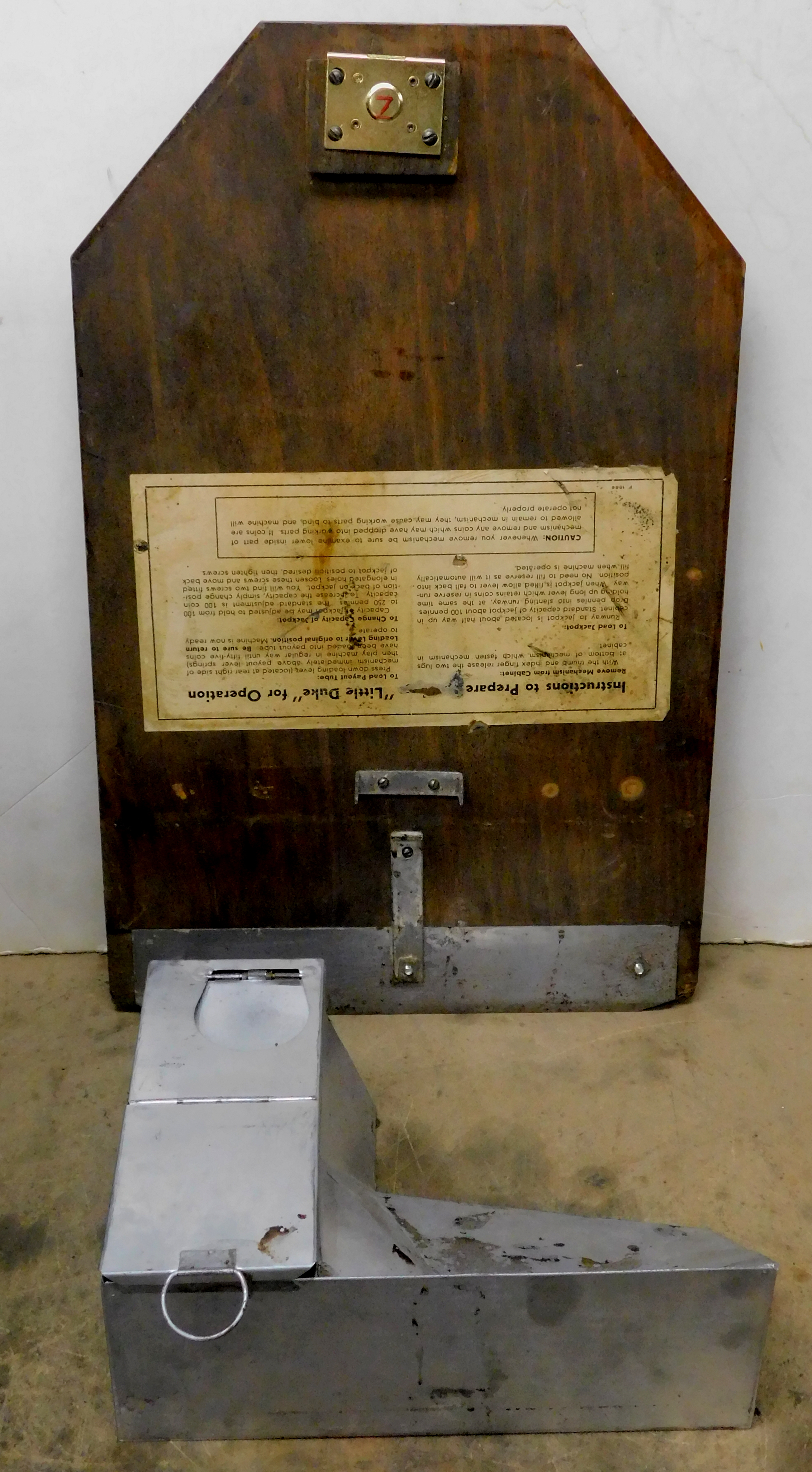 Jennings Little Duke 10 cent, older restoration with full funtion self feed Jack-Pots. This is the first one we have had that was a dime. Original reel strips, original cashbox, back door with instruction sheet, nice chrome on coin entry and handle.